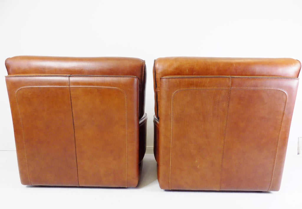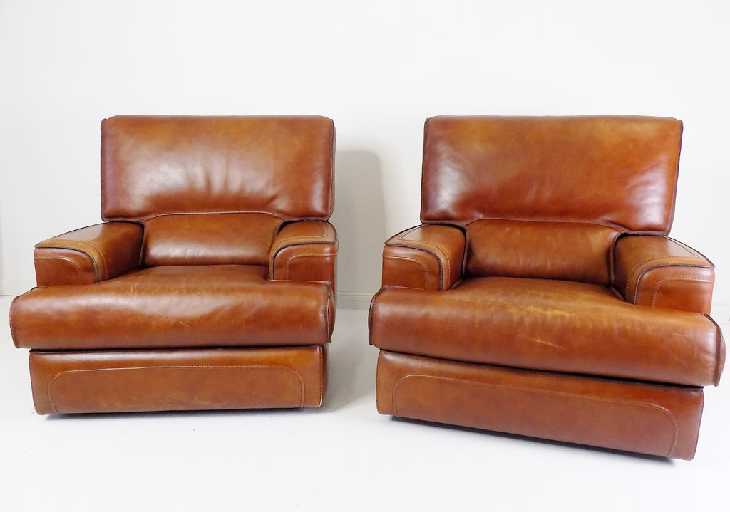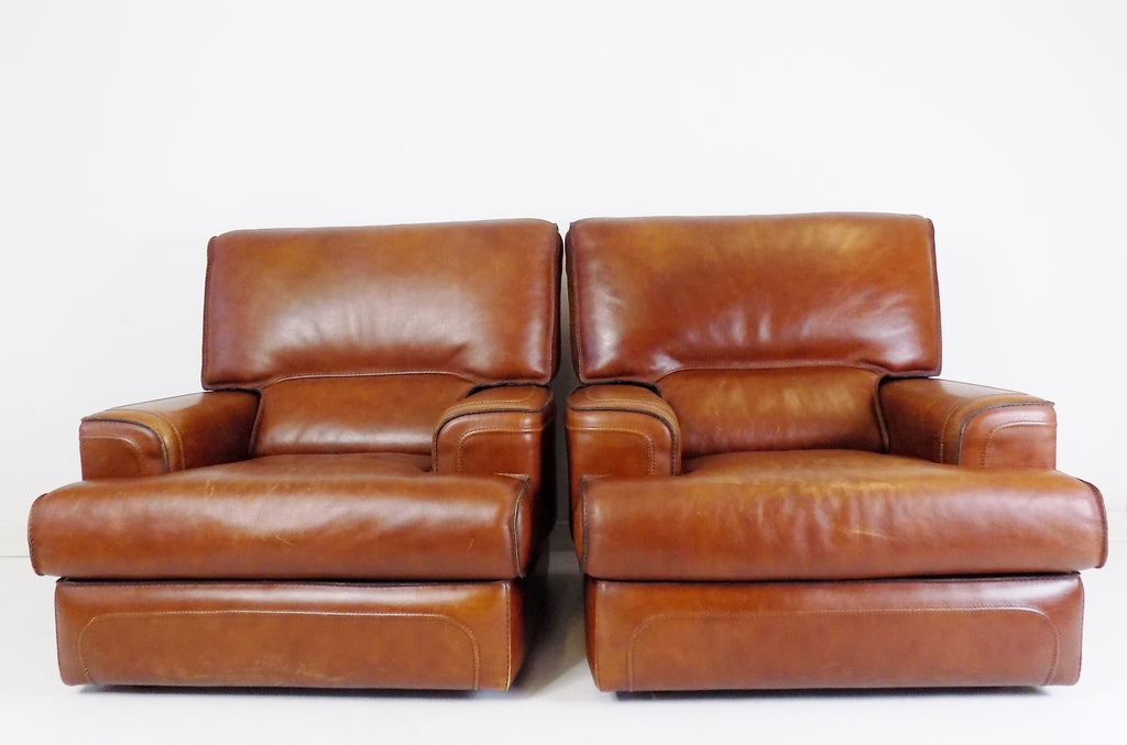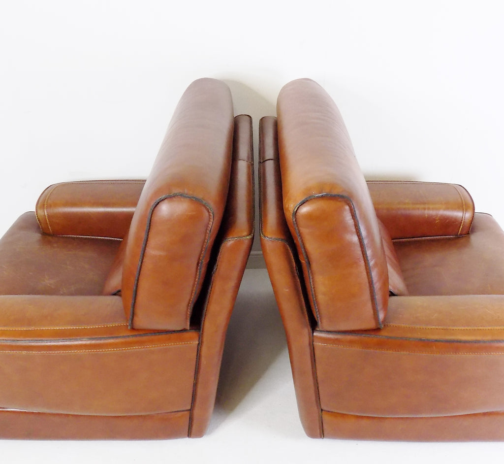 이 갈색 가죽 안락의자 2개 세트는 로슈 보부아의 전형적인 두꺼운 가죽 변형으로 만들어졌으며 상태가 좋습니다.