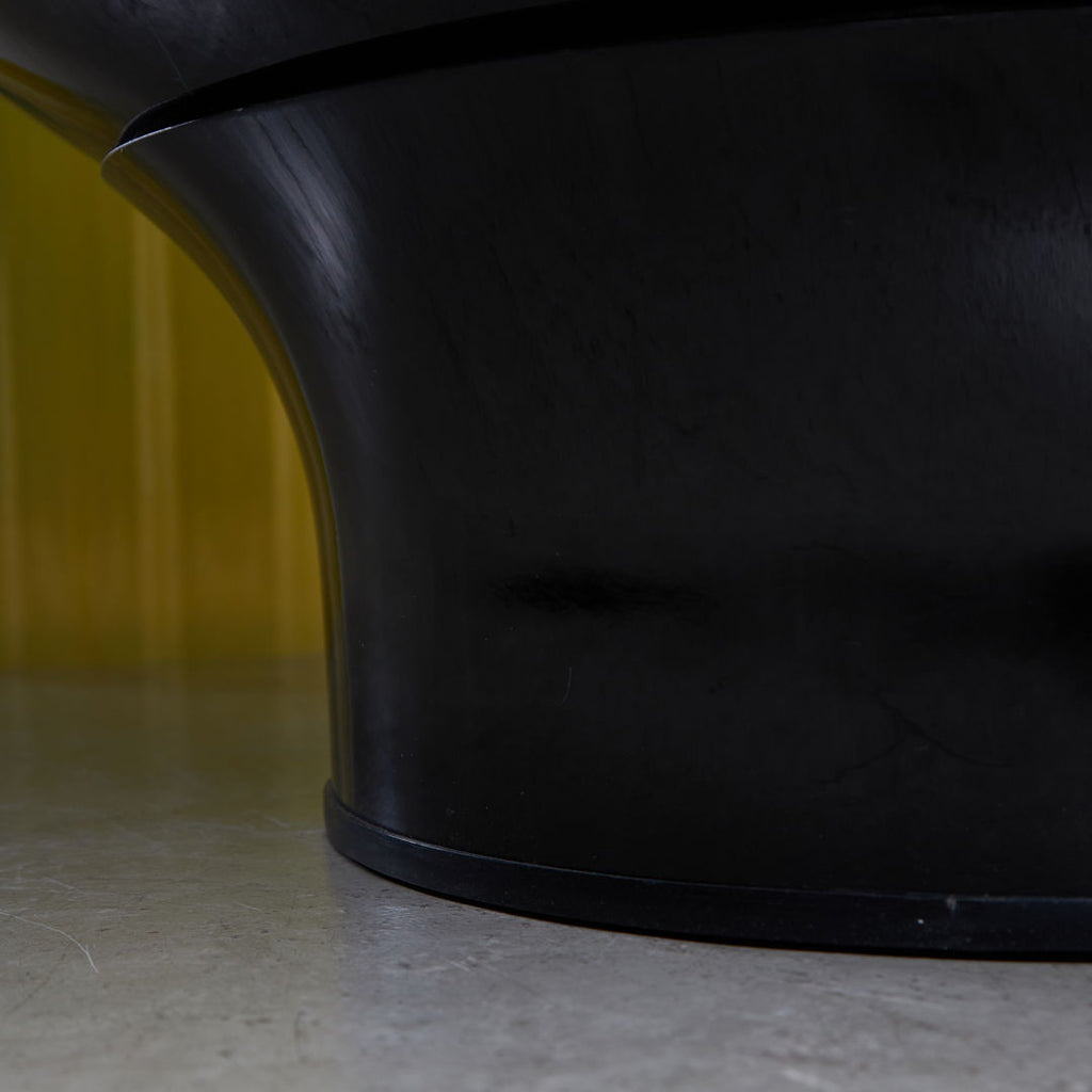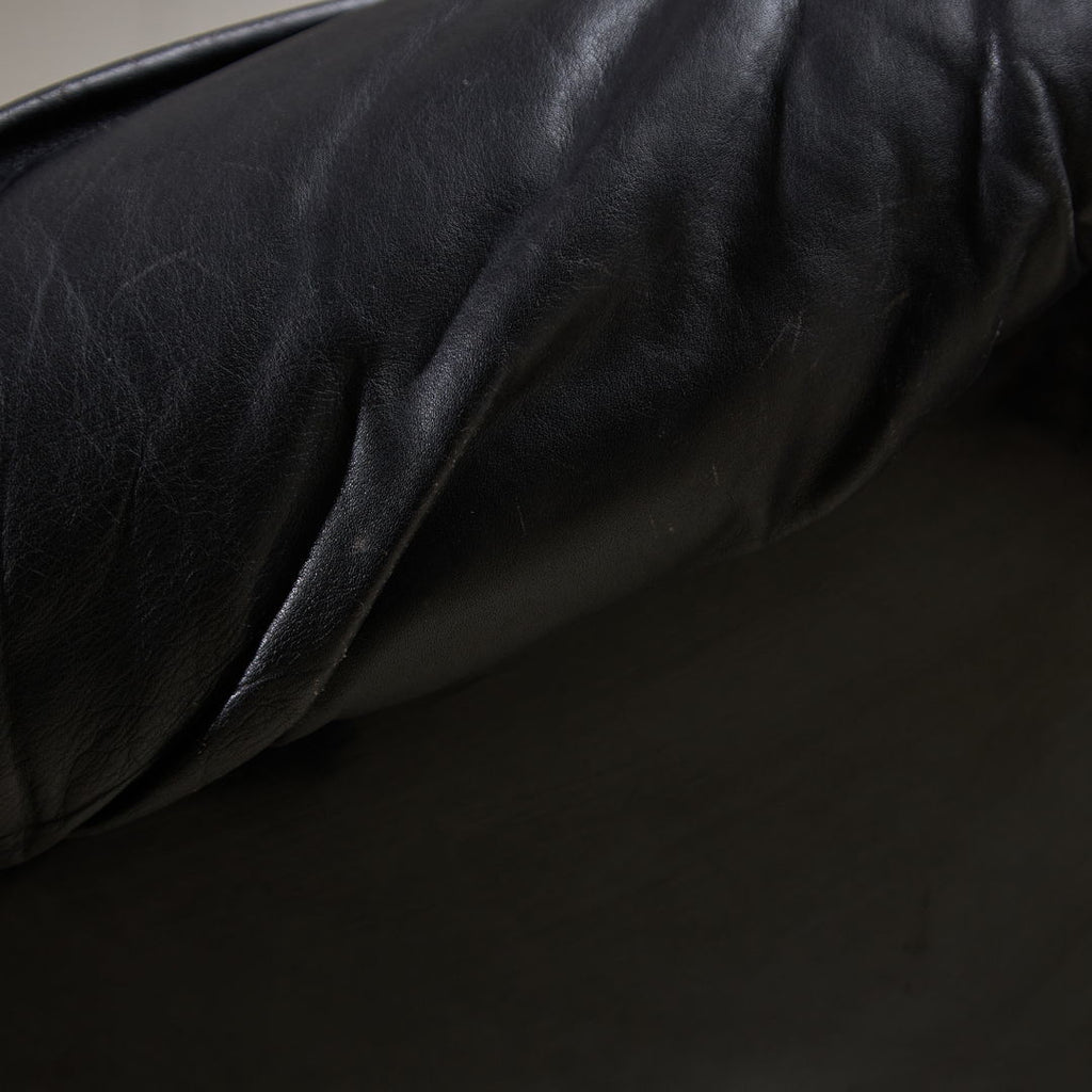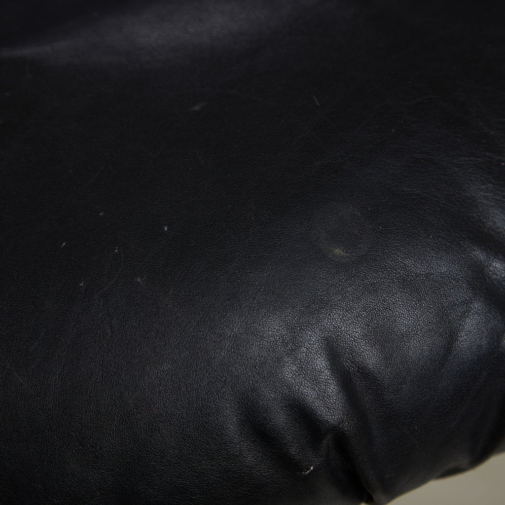부드러운 가죽 커버가 있는 검정색 이탈리아 미드센추리 쉘 안락의자. 고정 베이스에서 회전하며 유리 섬유 프레임에 원형 발판이 있습니다. Rodica 라운지 의자는 Mario Brunu가 1968년 Comfort Italy를 위해 디자인한 것으로, 넉넉하고 꼭 껴안는 모양이 최고의 편안함을 선사합니다. 가죽에 마모의 흔적이 있고 사용으로 인해 유리 섬유 프레임에 긁힌 자국이 있습니다.