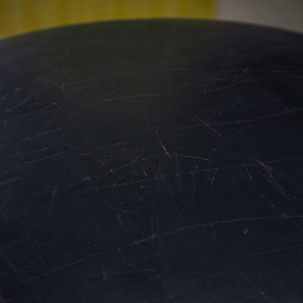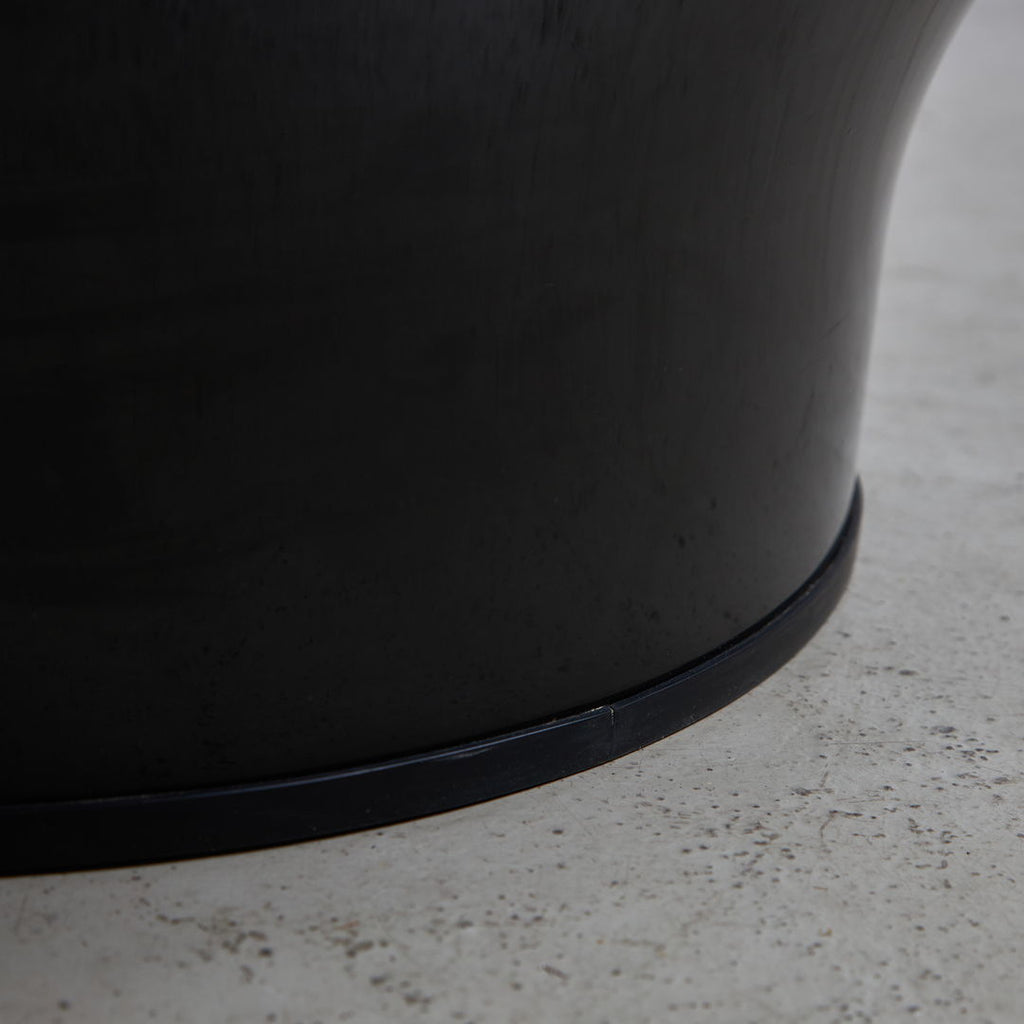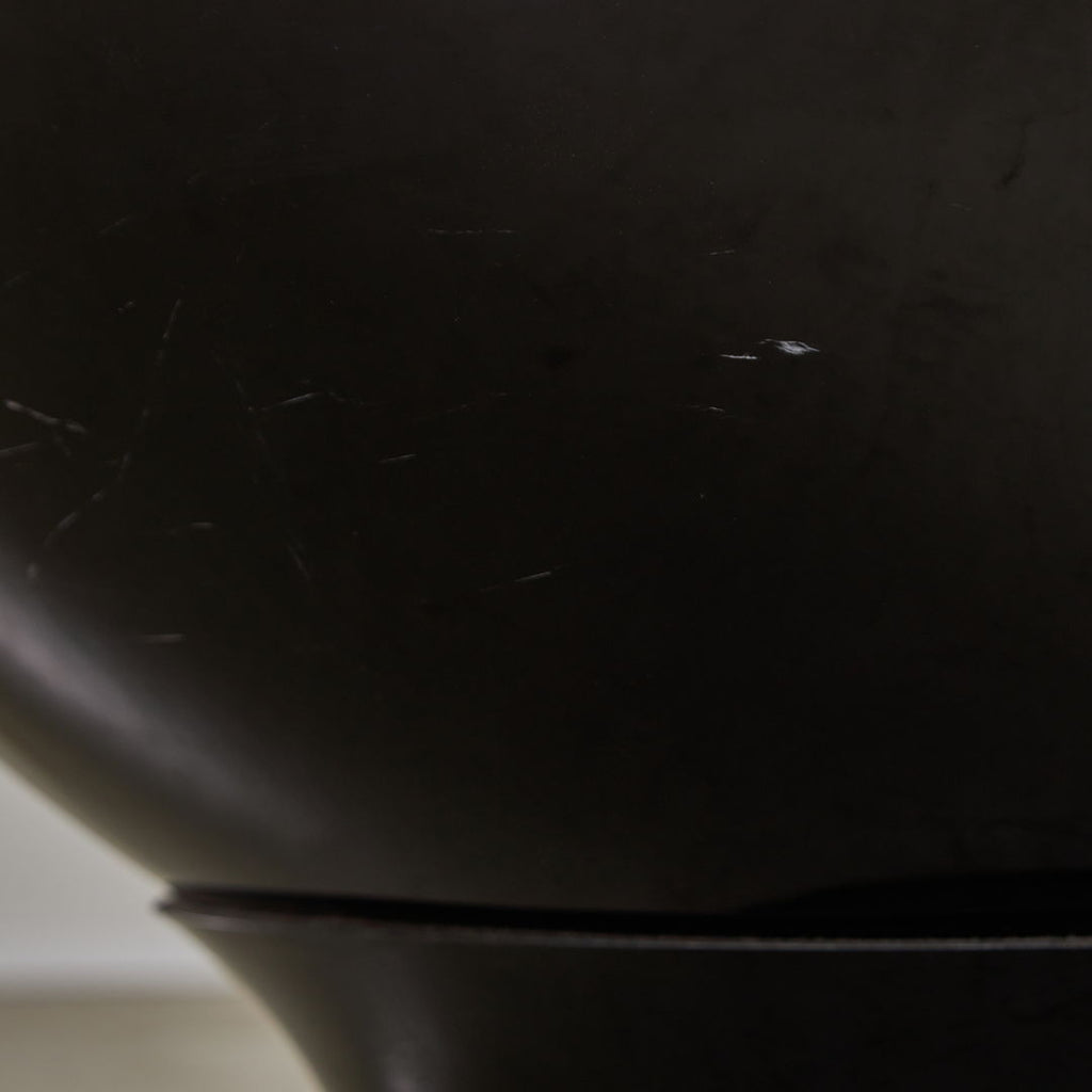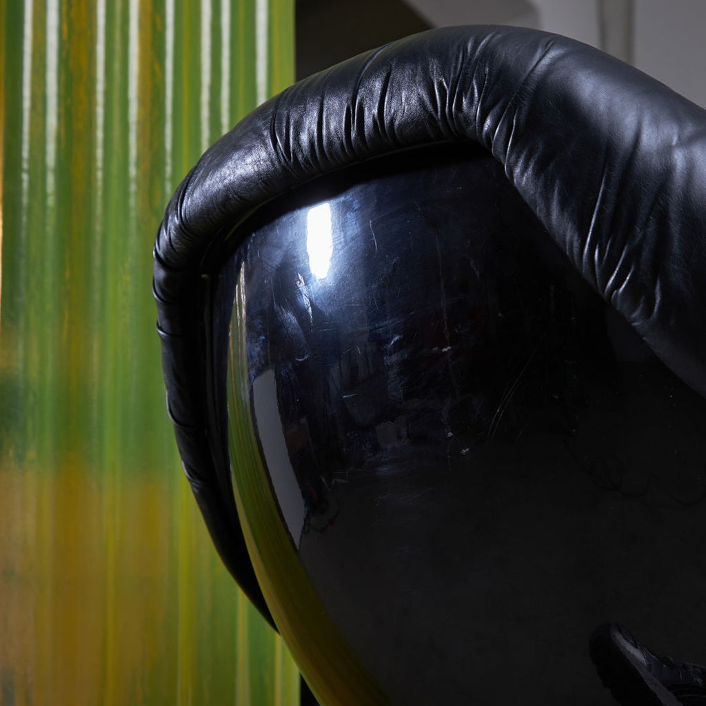 부드러운 가죽 커버가 있는 검정색 이탈리아 미드센추리 쉘 안락의자. 고정 베이스에서 회전하며 유리 섬유 프레임에 원형 발판이 있습니다. Rodica 라운지 의자는 Mario Brunu가 1968년 Comfort Italy를 위해 디자인한 것으로, 넉넉하고 꼭 껴안는 모양이 최고의 편안함을 선사합니다. 가죽에 마모의 흔적이 있고 사용으로 인해 유리 섬유 프레임에 긁힌 자국이 있습니다.