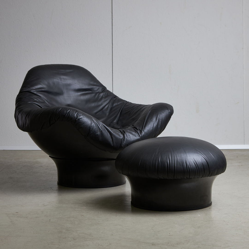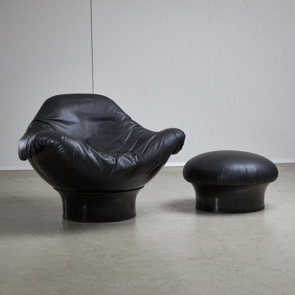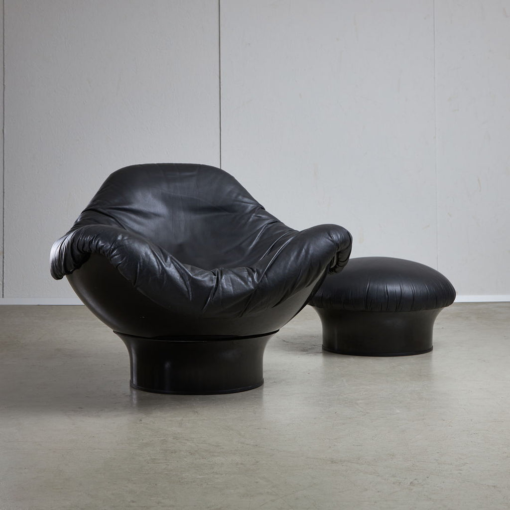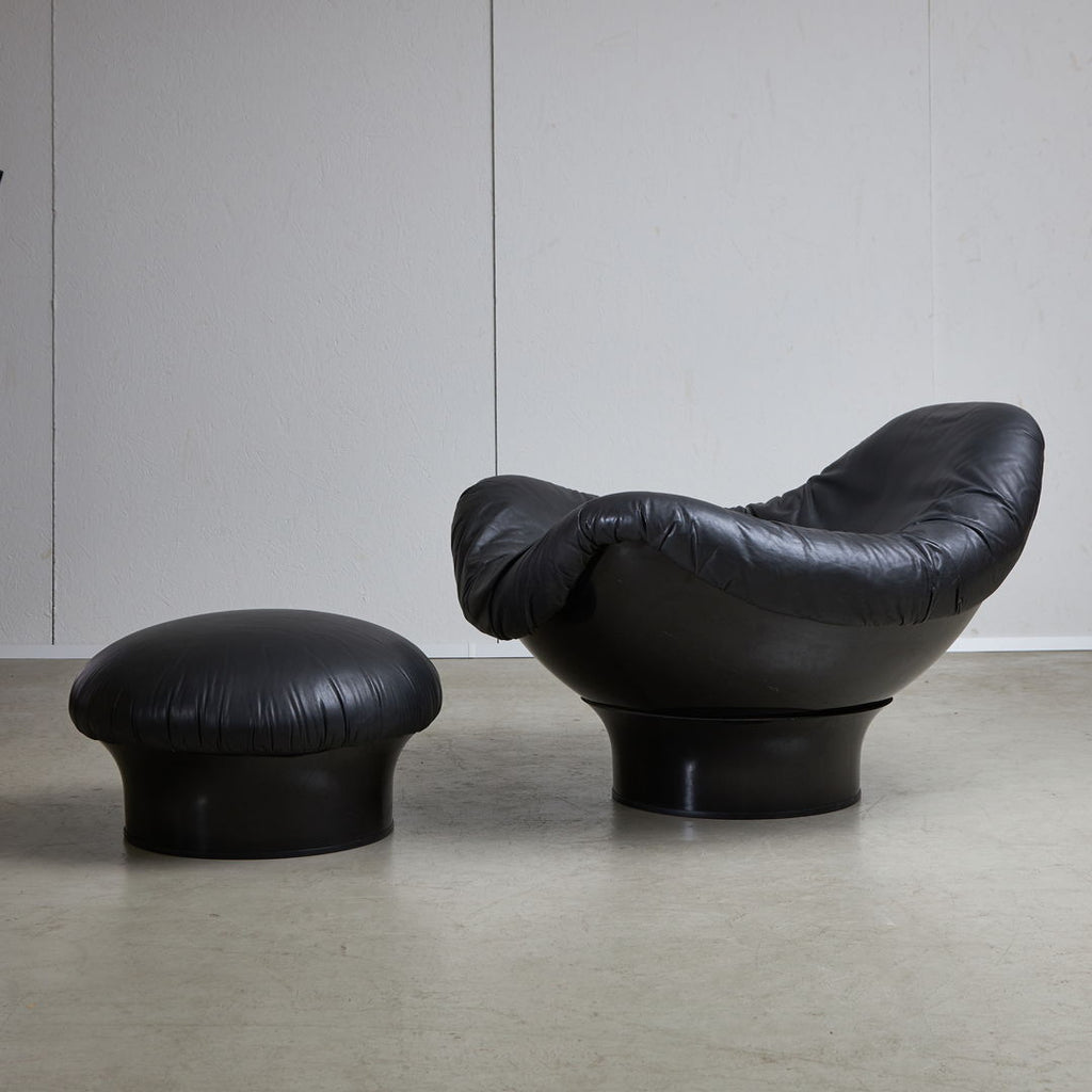 Black, Italian Mid-century shell armchair with soft leather cover, which rotates on a fixed base, with a circular footrest on a fiberglass frame. The Rodica lounge chair was designed by Mario Brunu for Comfort Italy in 1968, and it features a generous, hugging shape that gives utmost comfort. It shows signs of wear on the leather and scratches on the fiberglass frame from use.