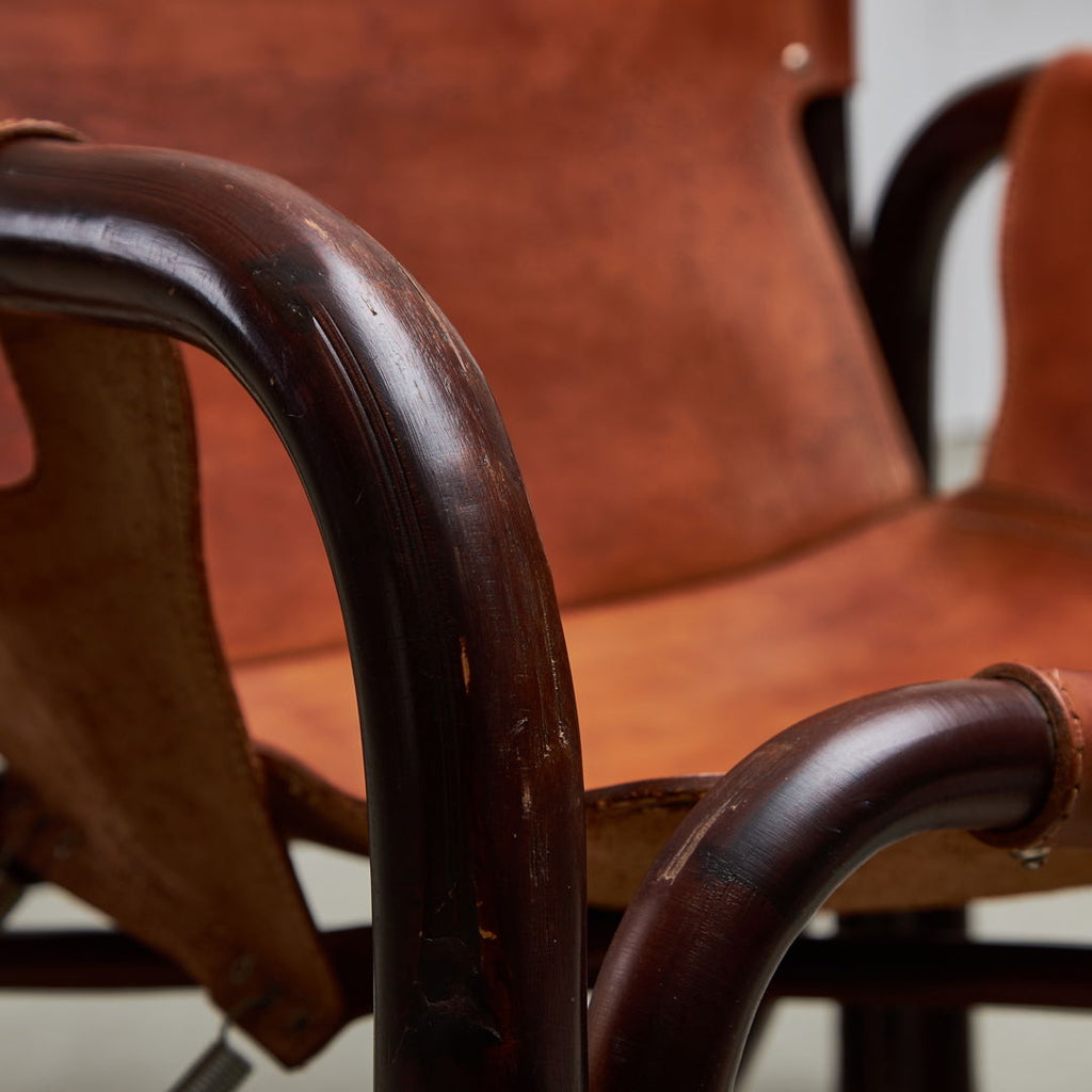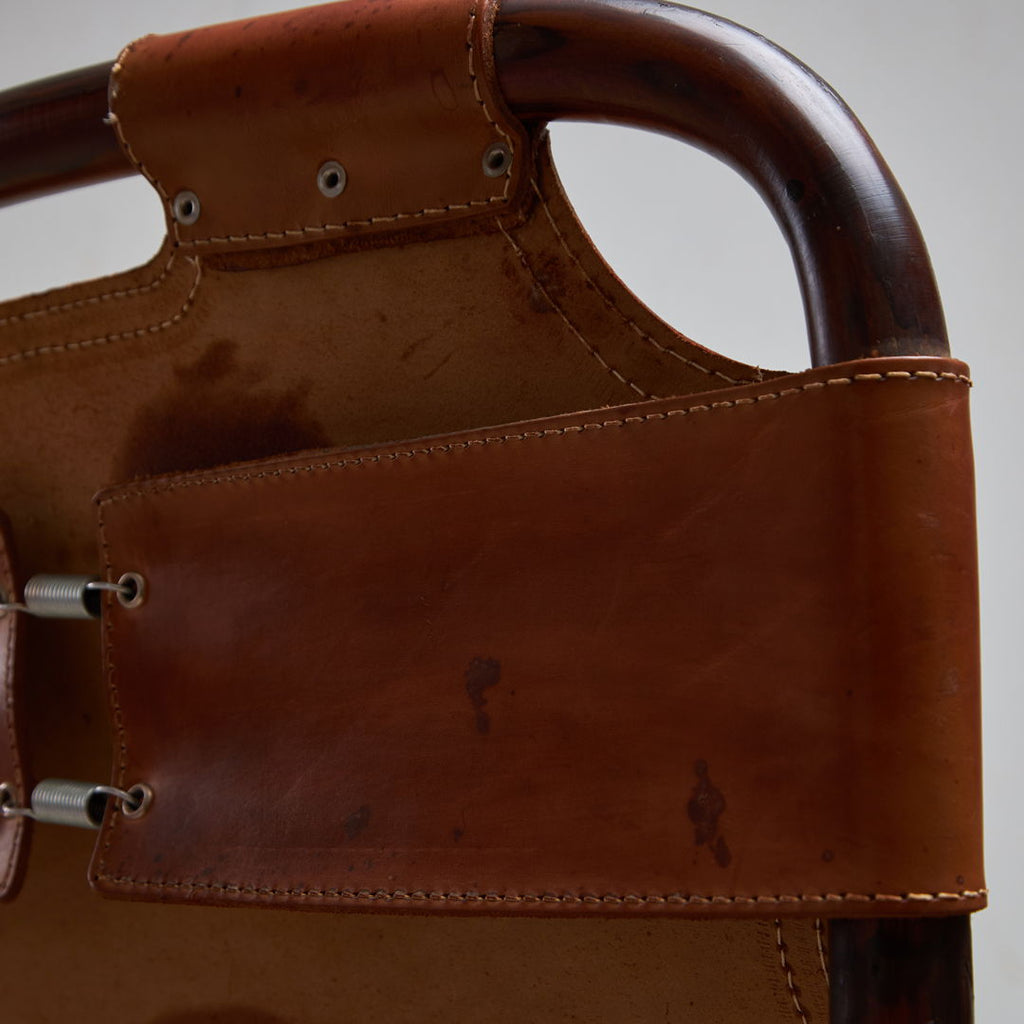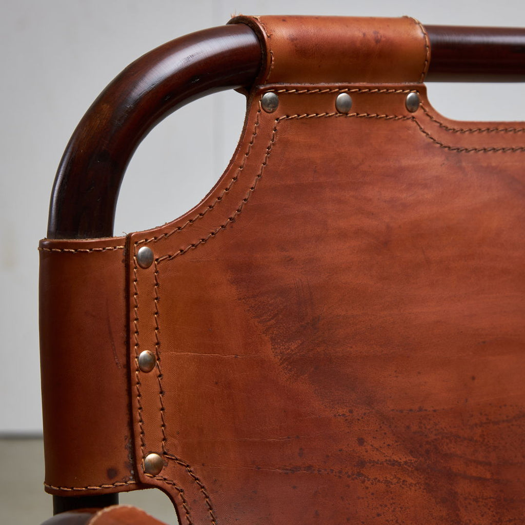 "티토 아뇰리가 1960년대 보나치나를 위해 디자인한 이 사파리 안락의자는 시대를 초월한 우아함과 모험심이 결합되어 있습니다. 안락의자는 나무 프레임과 사용 흔적이 있는 갈색 가죽 장식이 특징입니다. 뒷면에는 특허 1개가 누락되어 있습니다. "