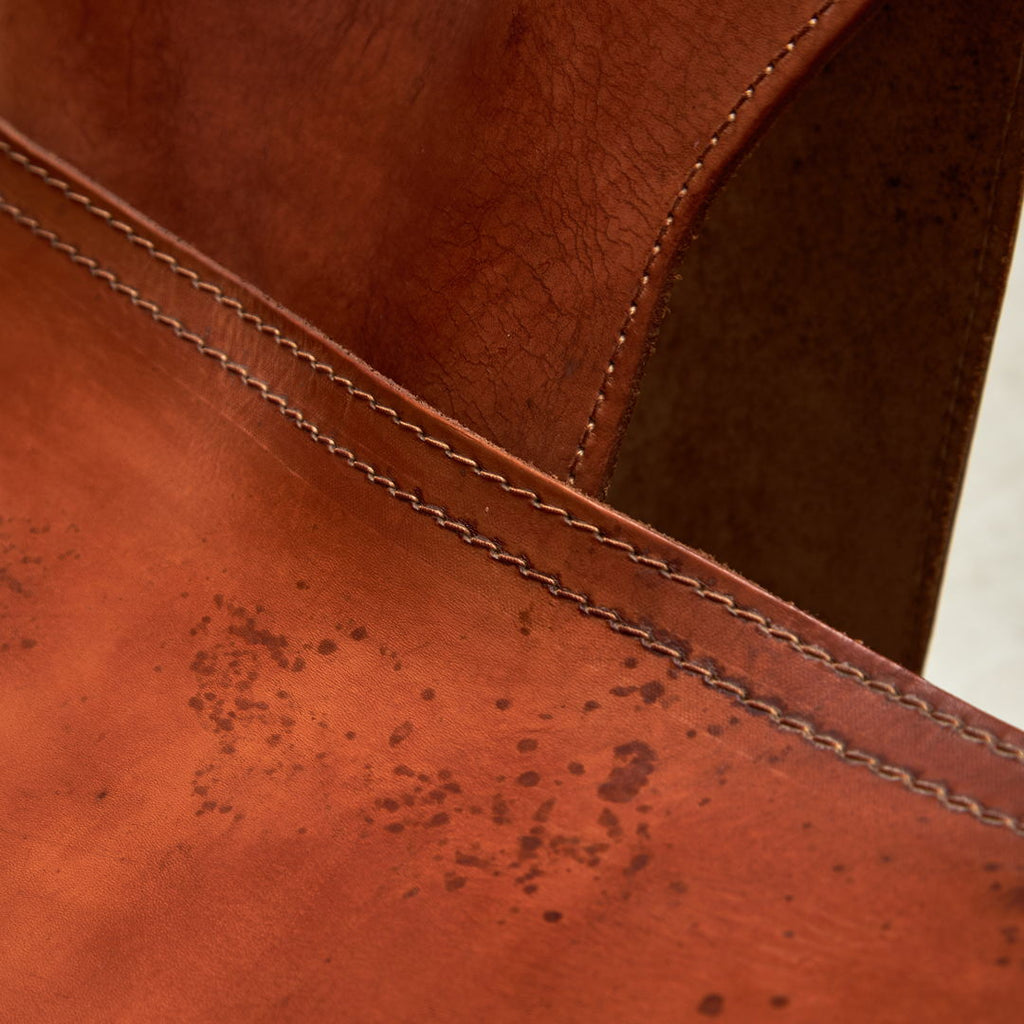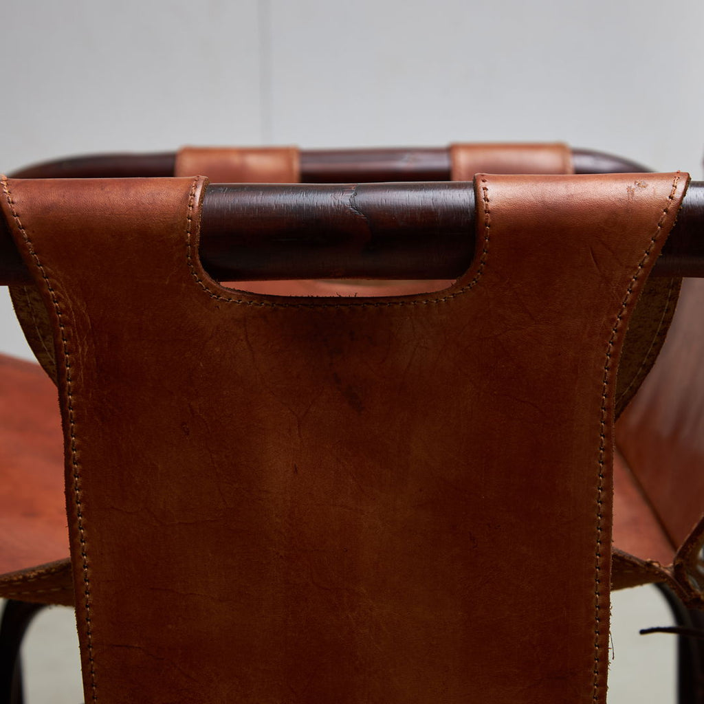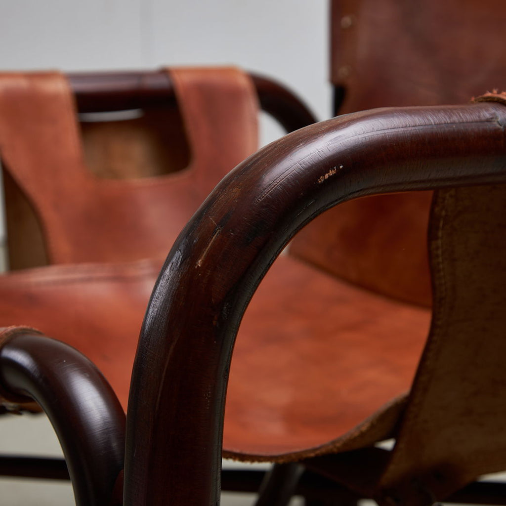 "티토 아뇰리가 1960년대 보나치나를 위해 디자인한 이 사파리 안락의자는 시대를 초월한 우아함과 모험심이 결합되어 있습니다. 안락의자는 나무 프레임과 사용 흔적이 있는 갈색 가죽 장식이 특징입니다. 뒷면에는 특허 1개가 누락되어 있습니다. "