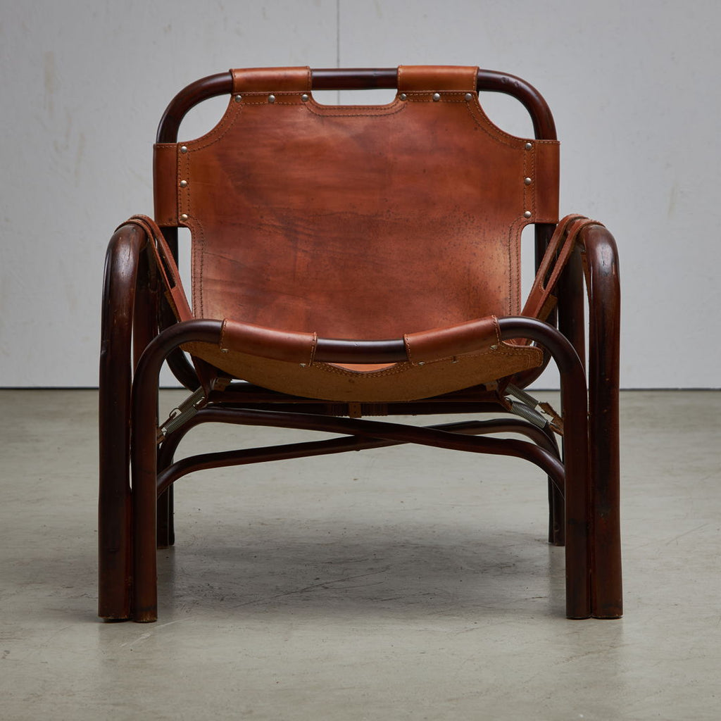 "A sense of adventure is paired with timeless elegance in this Safari armchair, designed by Tito Agnoli for Bonacina in the 1960s. The armchair features a wooden frame and brown leather upholstery, with signs of use. One patent is missing on the back. "