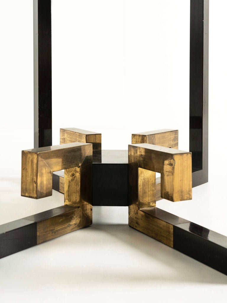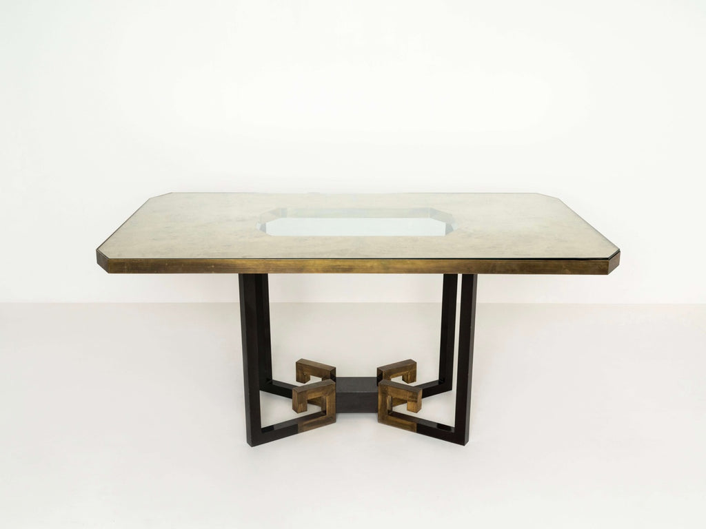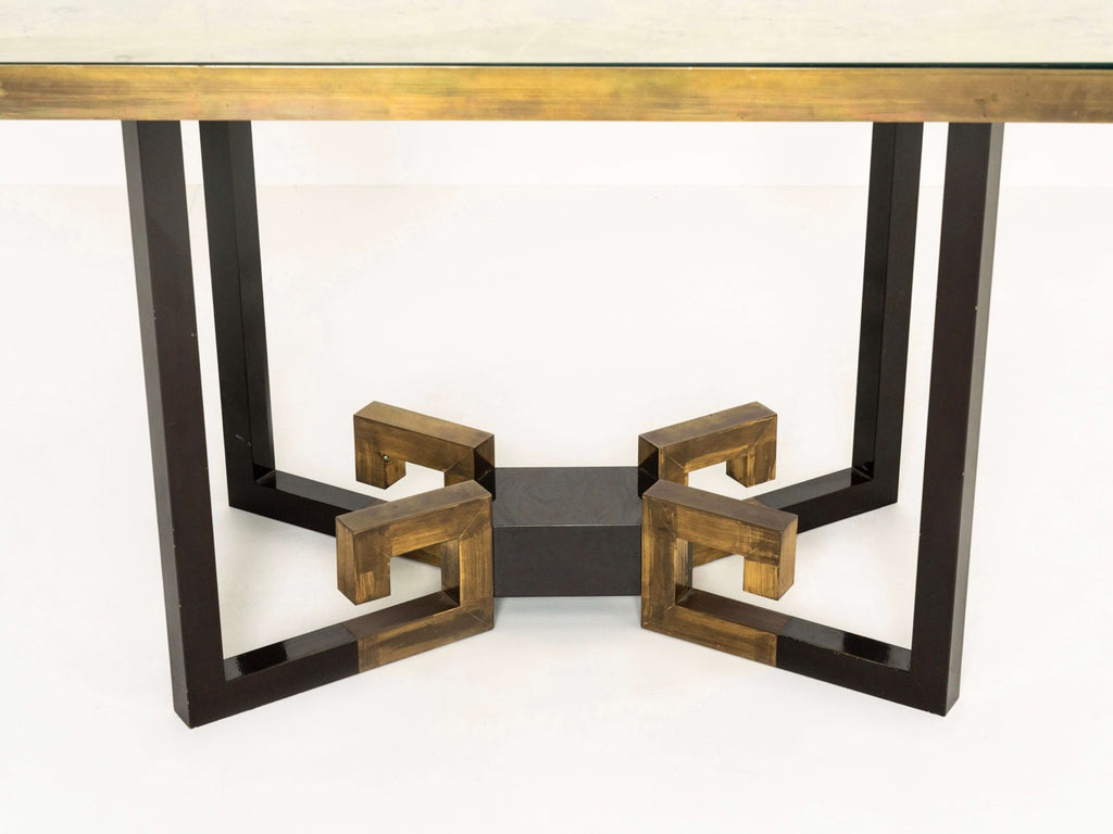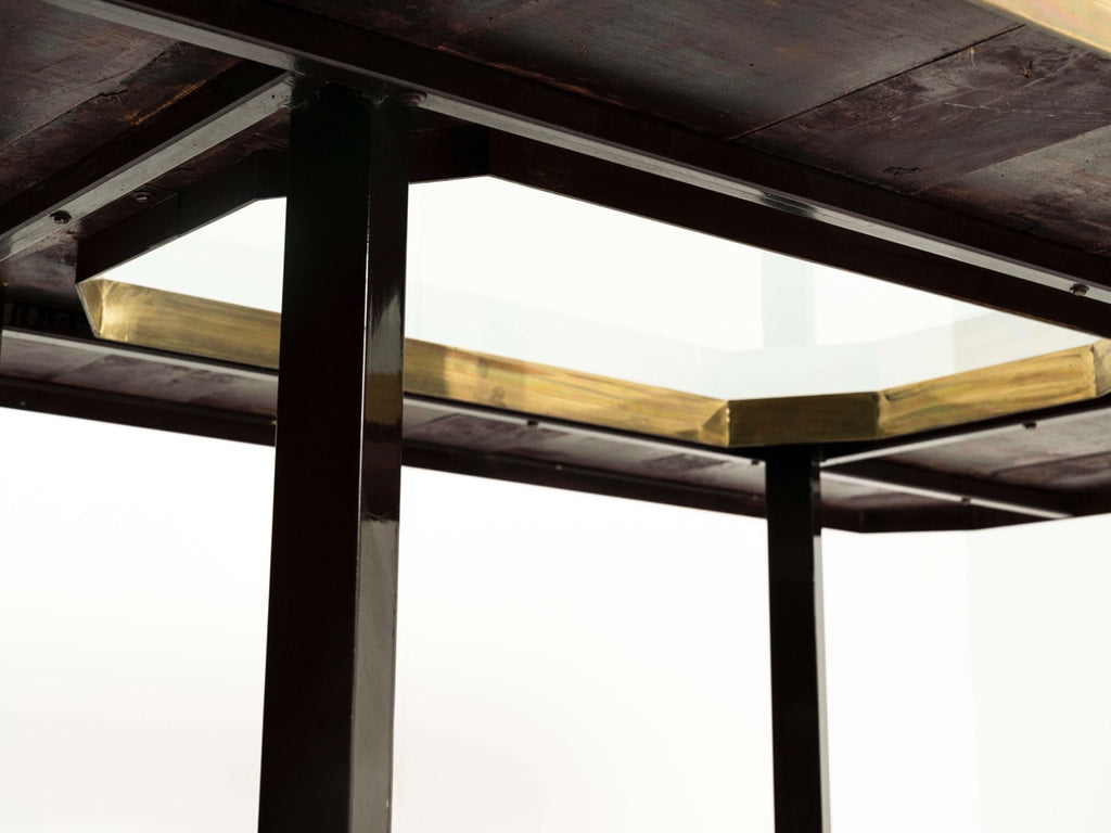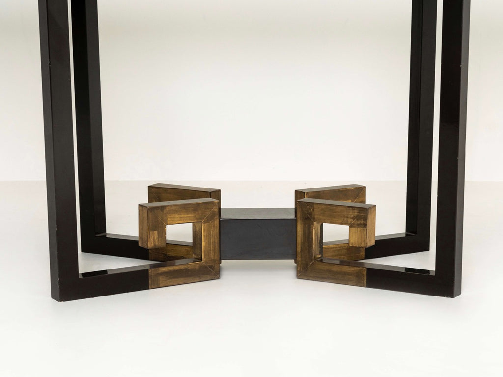 1970년대 이탈리아 앙골로메탈라르테를 위한 산드로 페티 식탁은 여러 애호가에게 사랑받는 품목 중 하나입니다. 특히 검은 색 크롬 금속, 황동 다리 및 유리 상단의 조합이 인기 입니다.