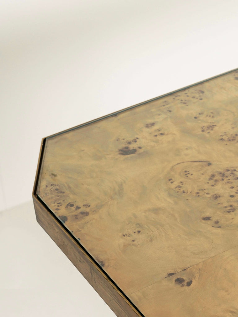 유리 상단 아래에는 '금색' 무늬가 있는 나무 패널이 있으며, 상단에는 투명한 육각형 유리가 있고 측면은 황동으로 덮여 있습니다.