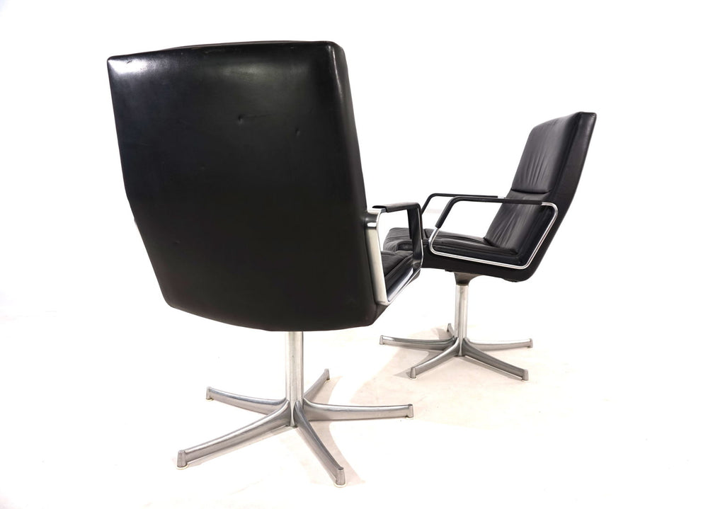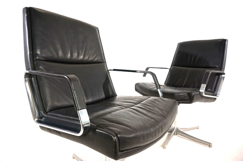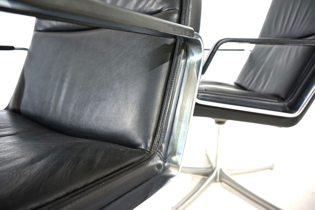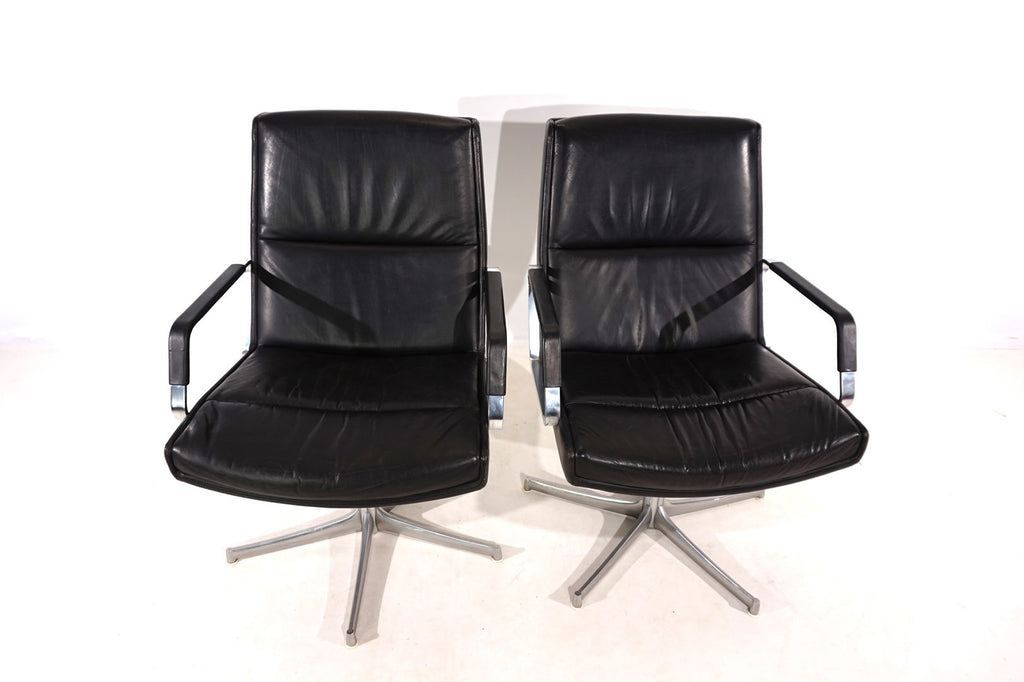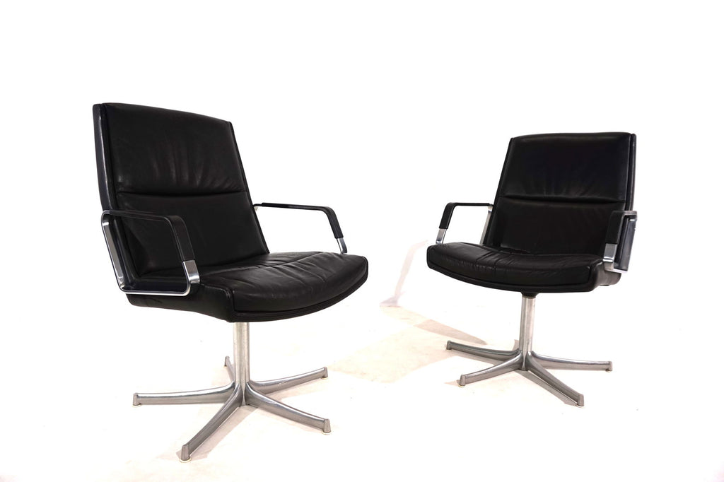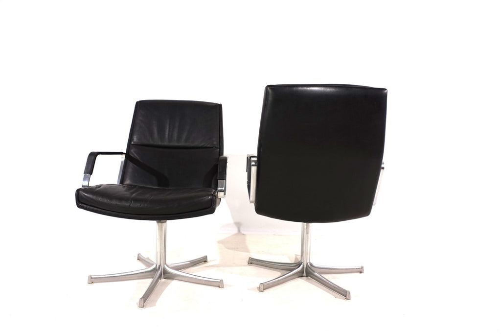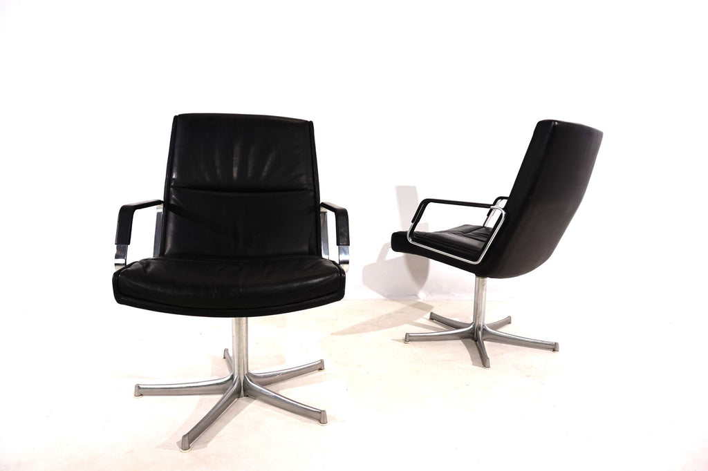 This beautiful pair of FK 711 office chairs, in black leather, is in very good condition. The stainless steel armrests are covered with leather and give these chairs a very high-quality look. The black leather shows only minimal signs of wear, the stainless steel frames are in perfect condition. Only the back of one chair and the star feet of the chairs show slight signs of wear. The chairs can be swiveled.