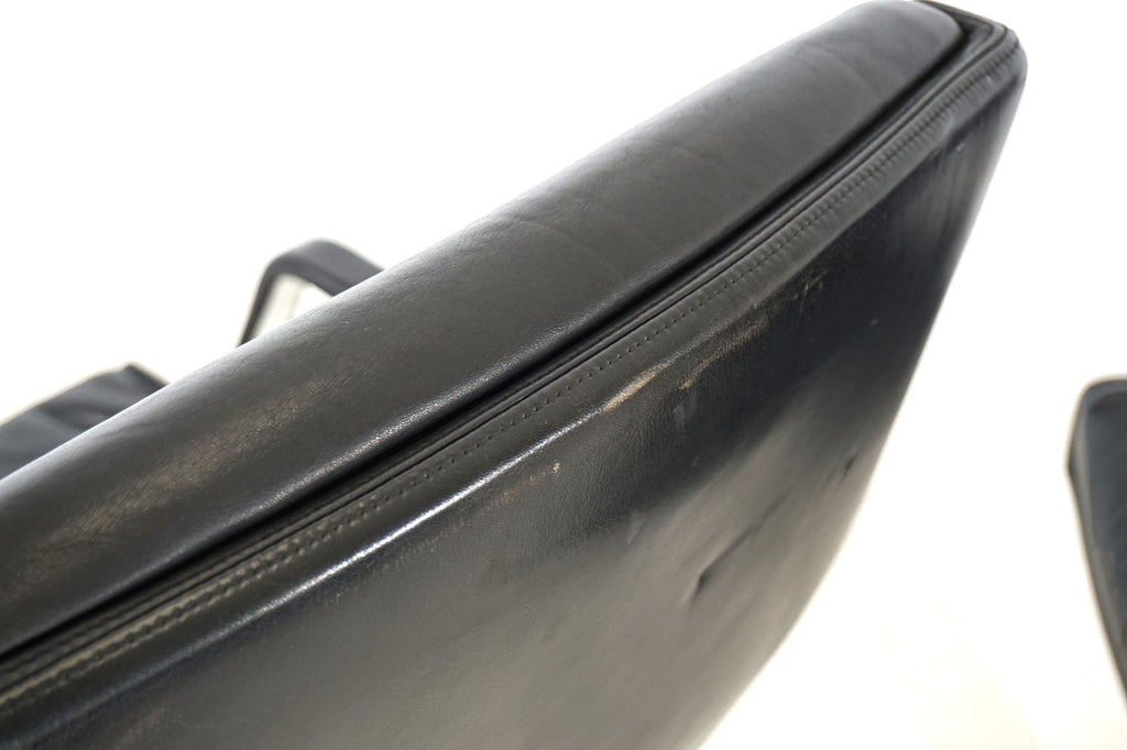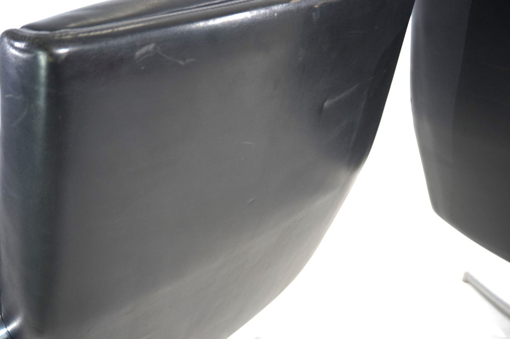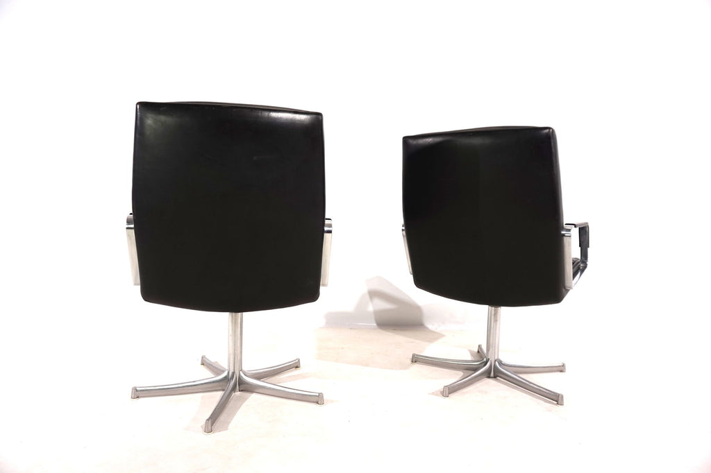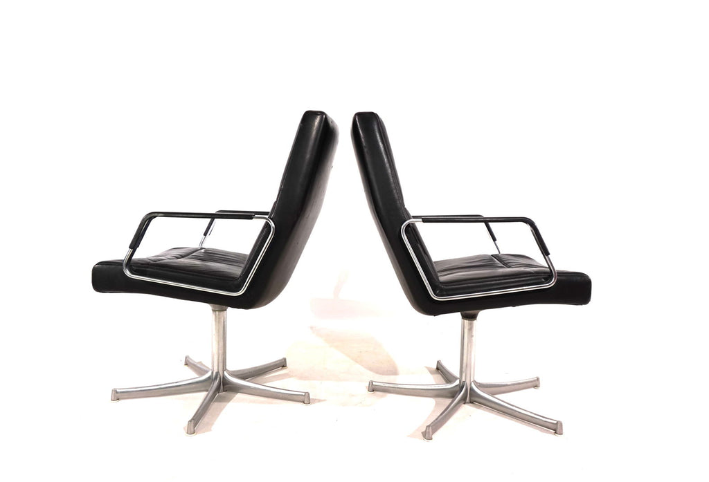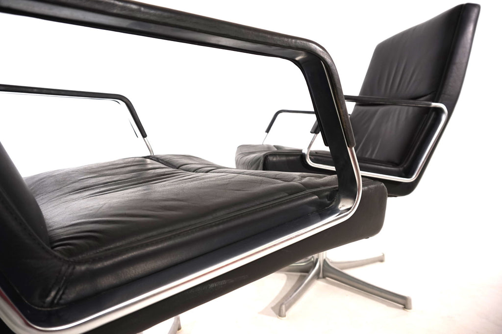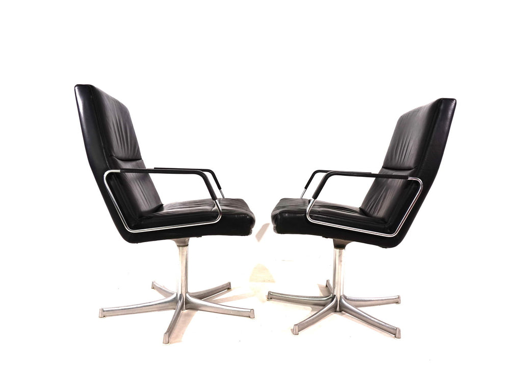 This beautiful pair of FK 711 office chairs, in black leather, is in very good condition. The stainless steel armrests are covered with leather and give these chairs a very high-quality look. The black leather shows only minimal signs of wear, the stainless steel frames are in perfect condition. Only the back of one chair and the star feet of the chairs show slight signs of wear. The chairs can be swiveled.