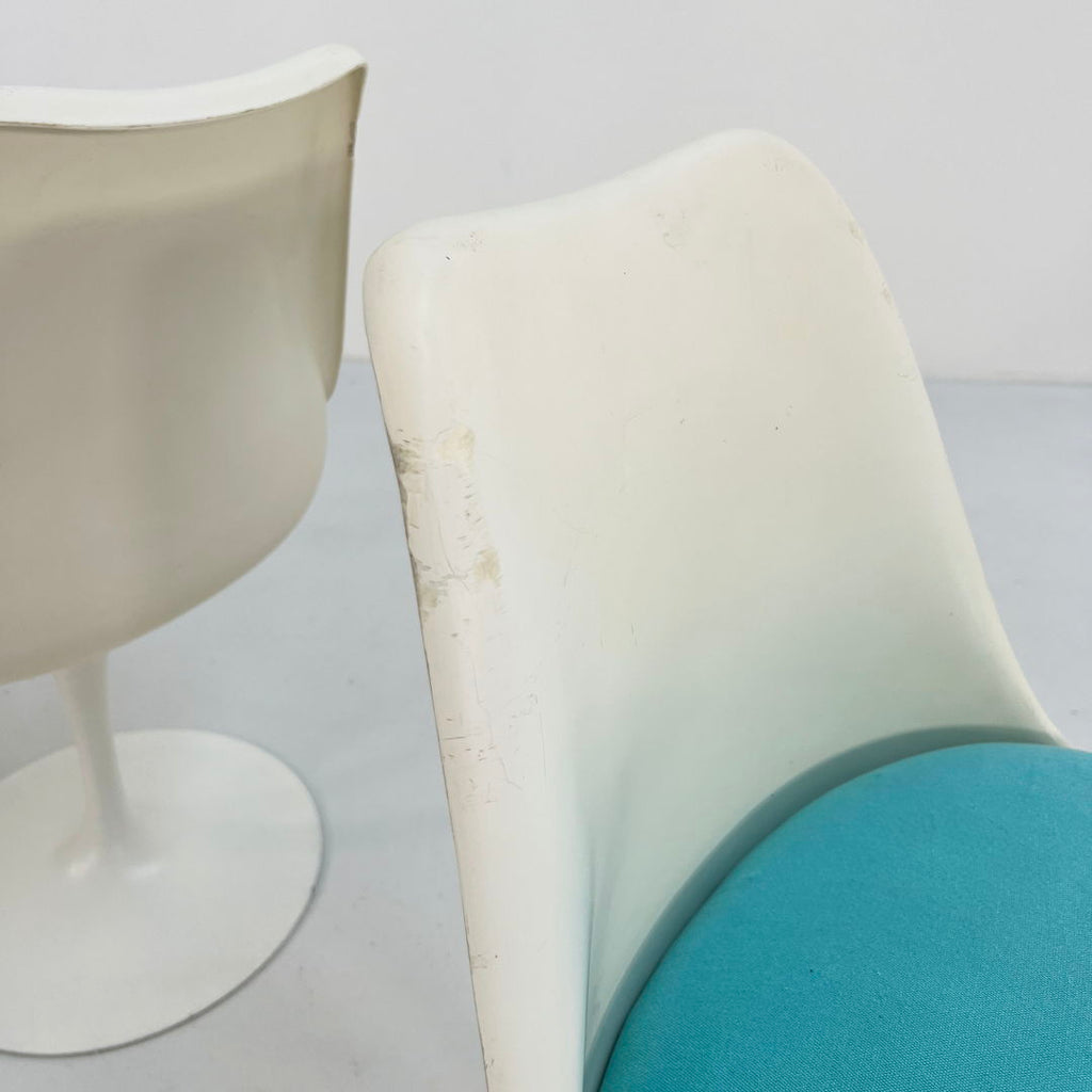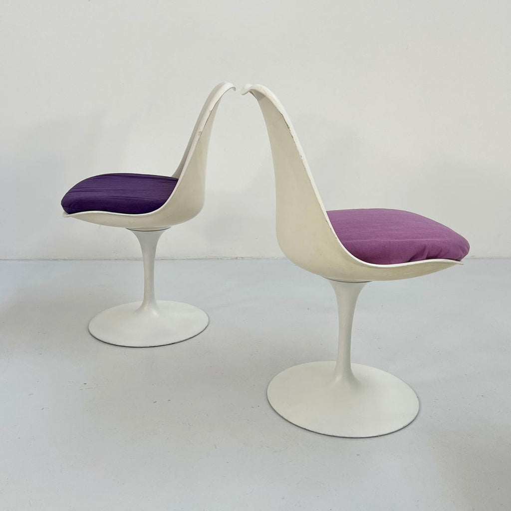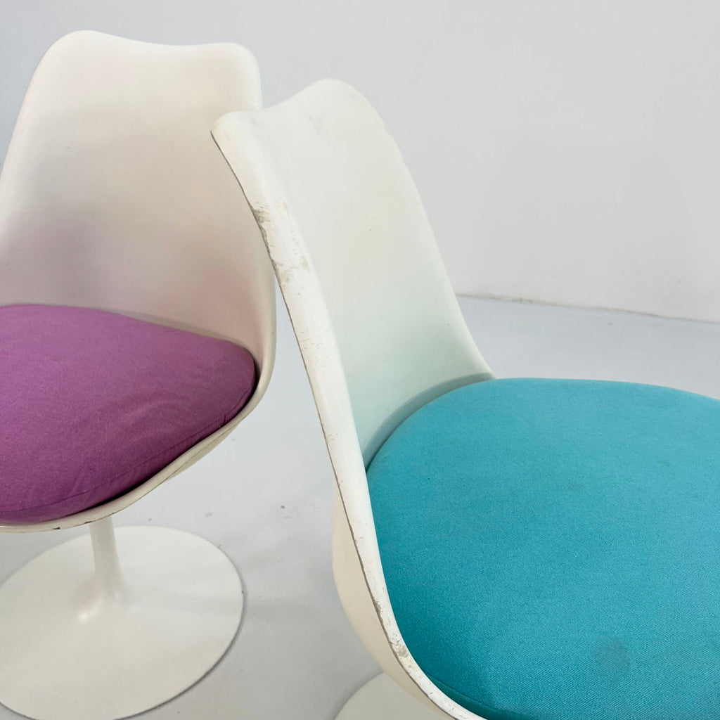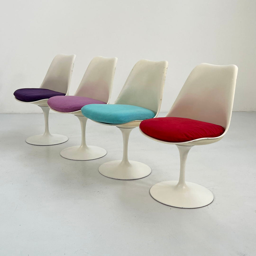 Knoll을 위한 Eero Saarinen의 다색 회전 튤립 다이닝 체어 4개 세트, 1960년 디자이너 - Eero Saarinen 프로듀서 - Knoll 모델 - 회전 튤립 다이닝 체어 디자인 기간 - 70년대 측정 - 폭 50cm x 깊이 54cm x 높이 80cm x 좌석 높이 45cm 소재 - 알루미늄, 유리섬유, 패브릭 컬러 - 화이트, 릴라, 퍼플, 레드, 블루 상태 - 좋은 코멘트 - 발 밑에 Knoll International 각인되어 있습니다. 의자는 자체 요소에 있습니다. 쿠션은 천을 다시 덮어야 하며 정품이 아닙니다. 특히 좌석과 등받이의 가장자리에 섬유 구조에 흠집/깨짐이 있습니다. 세부 사진을 참조하세요.