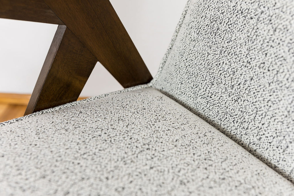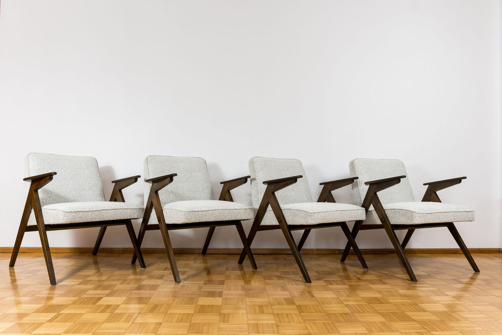복원된 20세기 중반 "토끼" 안락의자 유형 300-177, 1970년대 폴란드 4개 세트. 흑백 패브릭으로 다시 덮었습니다. 너도밤나무 프레임이 복원되고 다시 마감되었습니다.