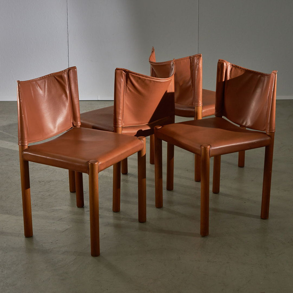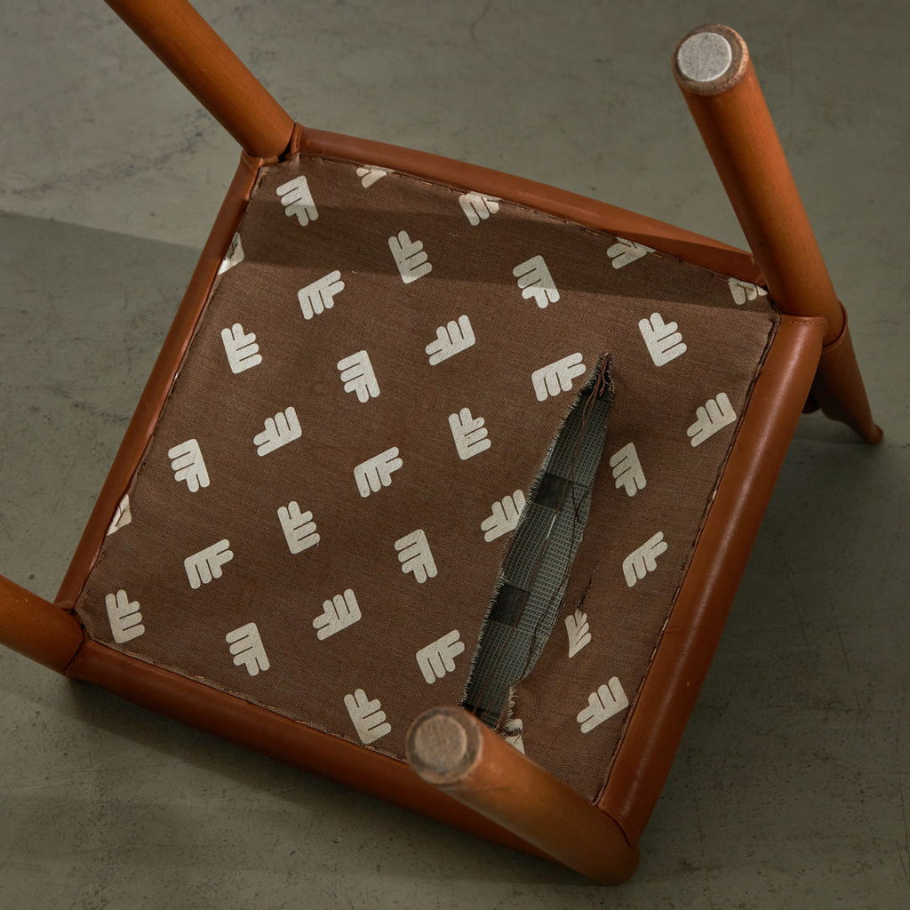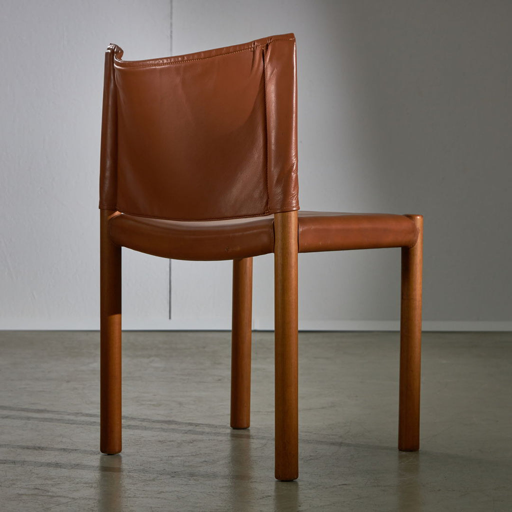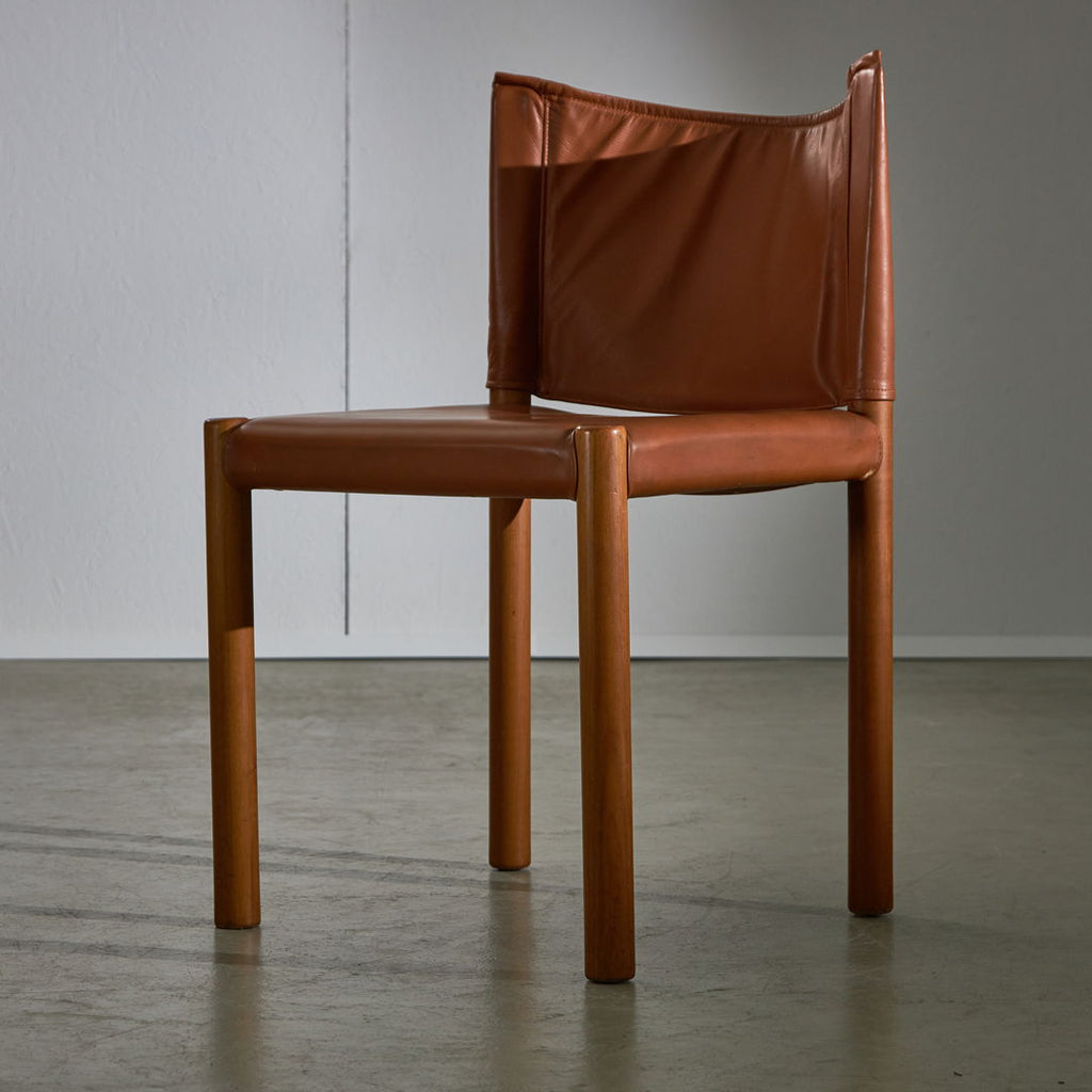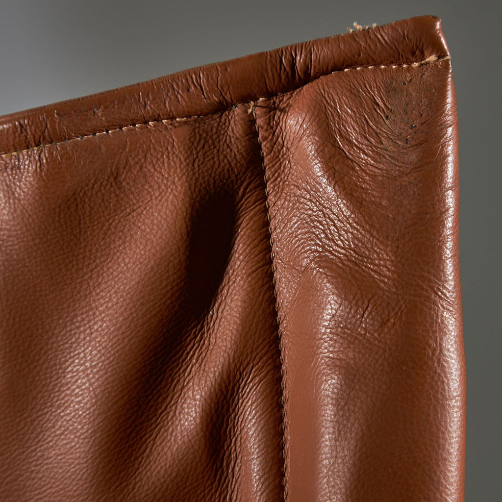 밝은 갈색 가죽과 나무 의자 세트입니다. 가죽 등받이는 탈부착이 가능해 활용도가 높고 유지 관리가 용이하며, 부드러운 가죽 굴곡 덕분에 아이템에 독특한 느낌을 더해줍니다. 표면은 곳곳에 눈에 띄는 손상이 있고 세월과 사용감이 있으나 전반적으로 양호하고 편안한 상태입니다. 의자 바닥의 덮개가 모두 찢어졌습니다. 세트당 가격입니다. SKU: GB0145