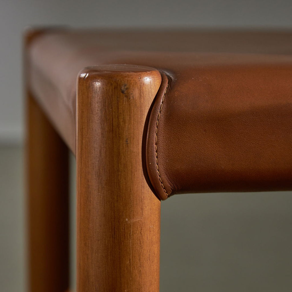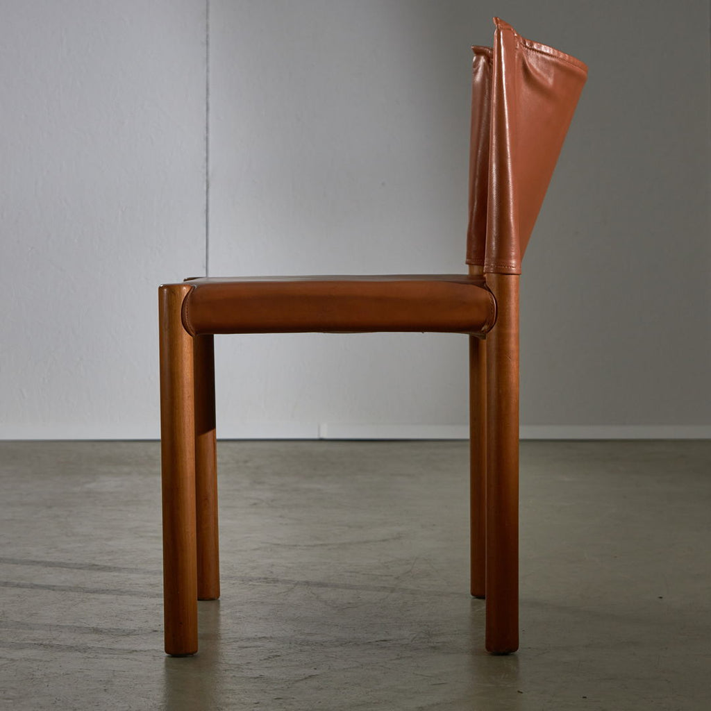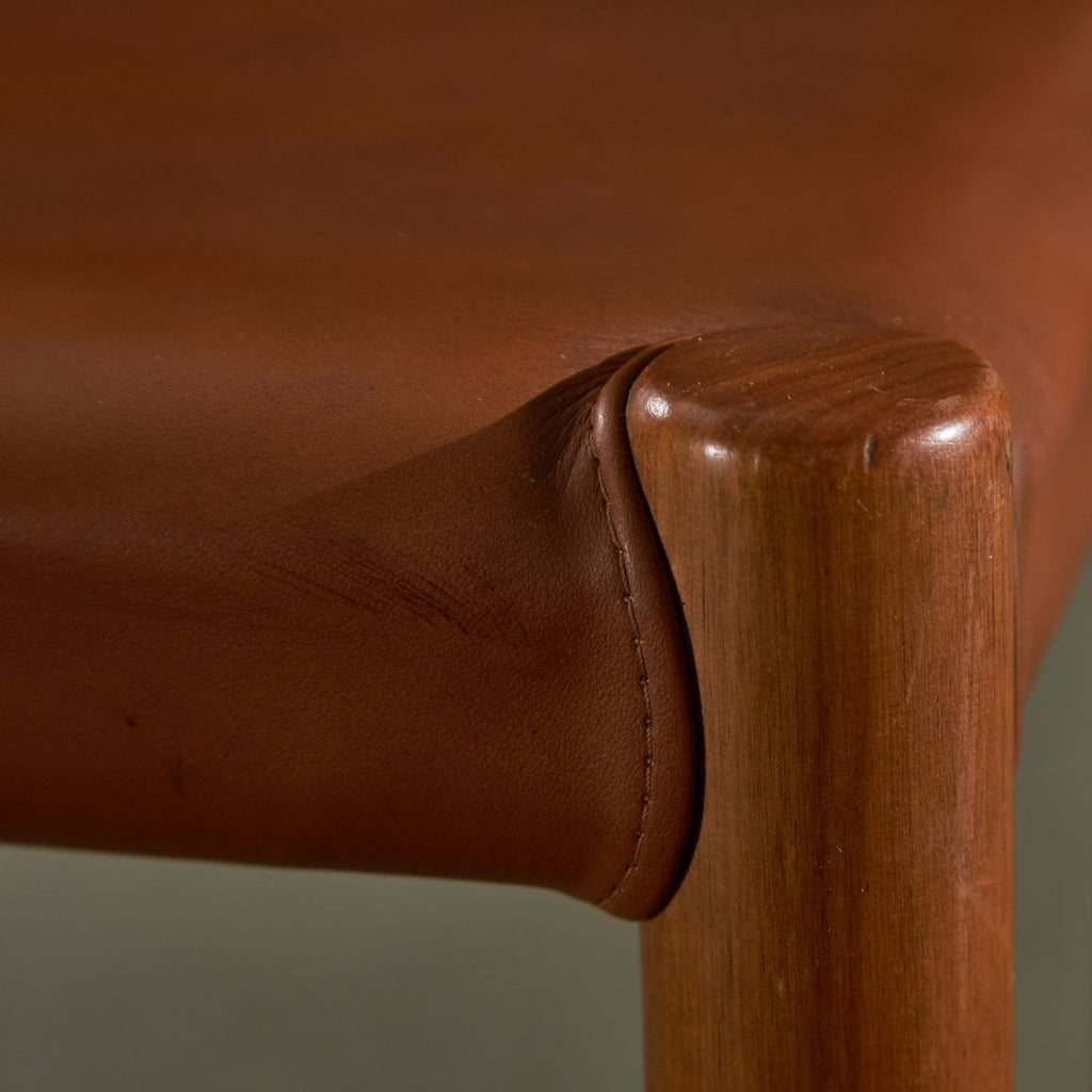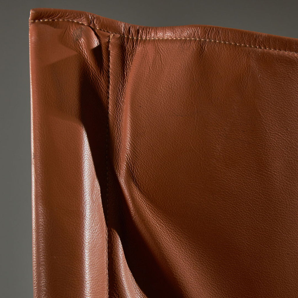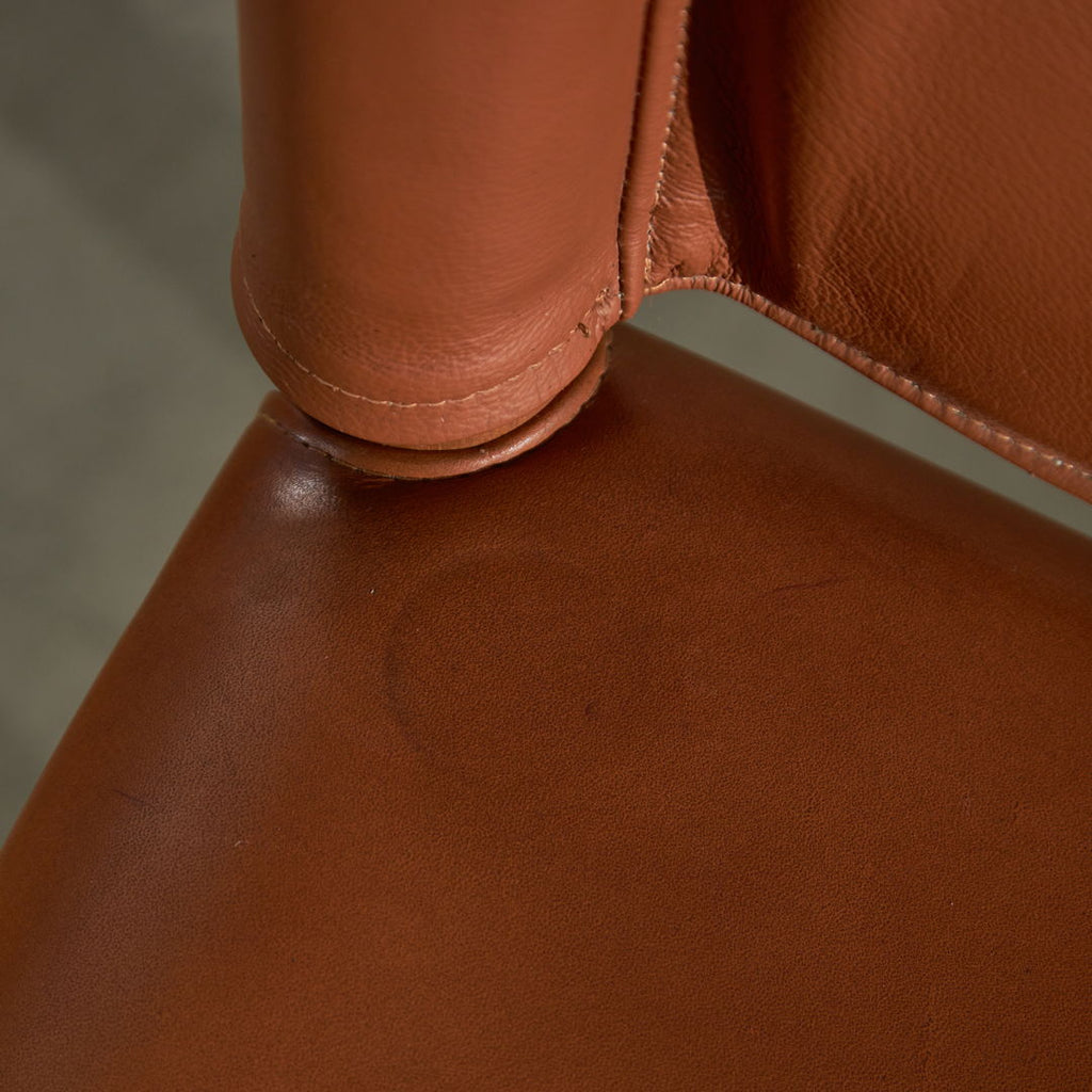 밝은 갈색 가죽과 나무 의자 세트입니다. 가죽 등받이는 탈부착이 가능해 활용도가 높고 유지 관리가 용이하며, 부드러운 가죽 굴곡 덕분에 아이템에 독특한 느낌을 더해줍니다. 표면은 곳곳에 눈에 띄는 손상이 있고 세월과 사용감이 있으나 전반적으로 양호하고 편안한 상태입니다. 의자 바닥의 덮개가 모두 찢어졌습니다. 세트당 가격입니다. SKU: GB0145