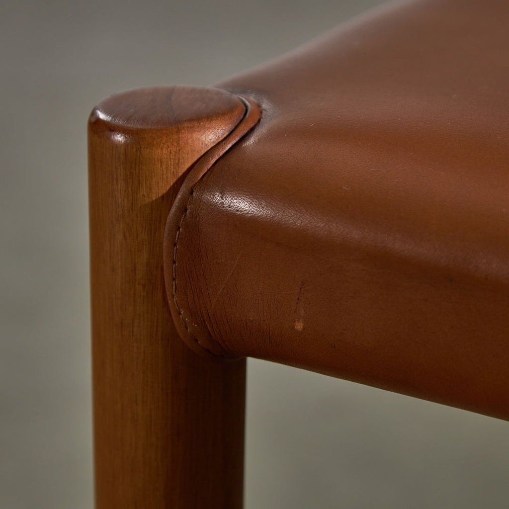 Light, brown leather and wooden chairs set. The versatility and ease of maintenance of the leather backrests are enhanced by their removable feature, and they also give the items a unique look thanks to the soft leather bending. The surfaces are sightly damaged at places and show signs of age and use but are in a good and comfortable overall condition. The upholstery at the bottom of the chairs is torn on all of them.