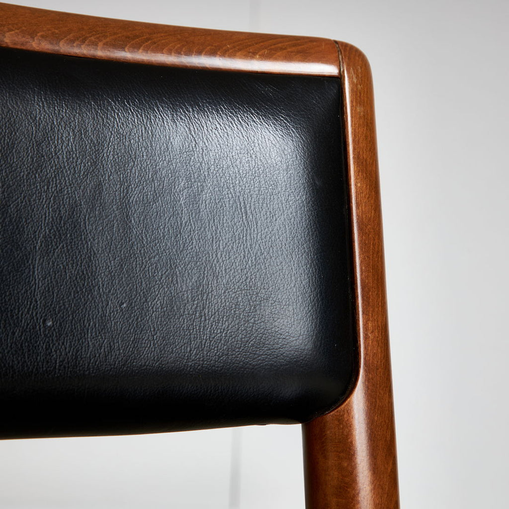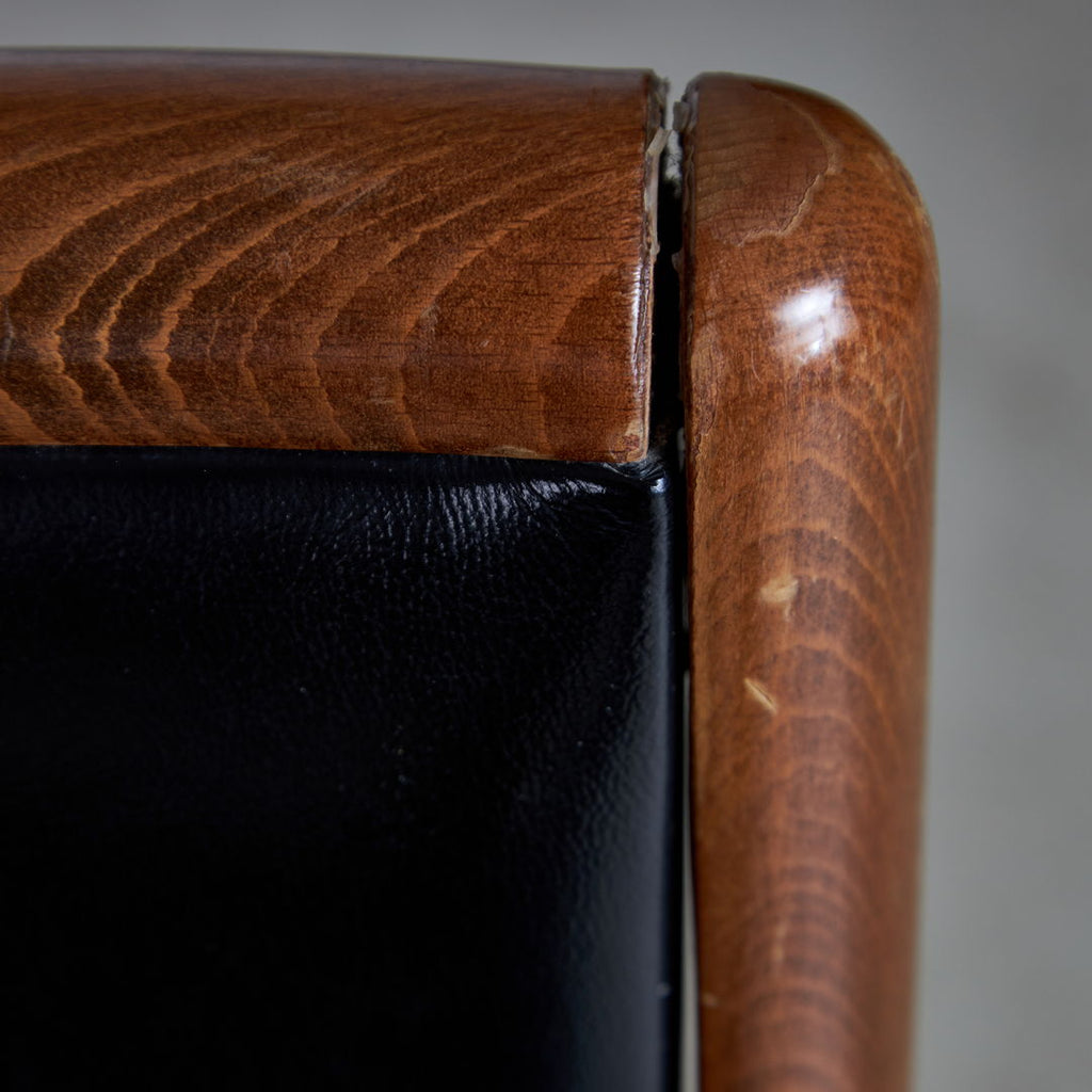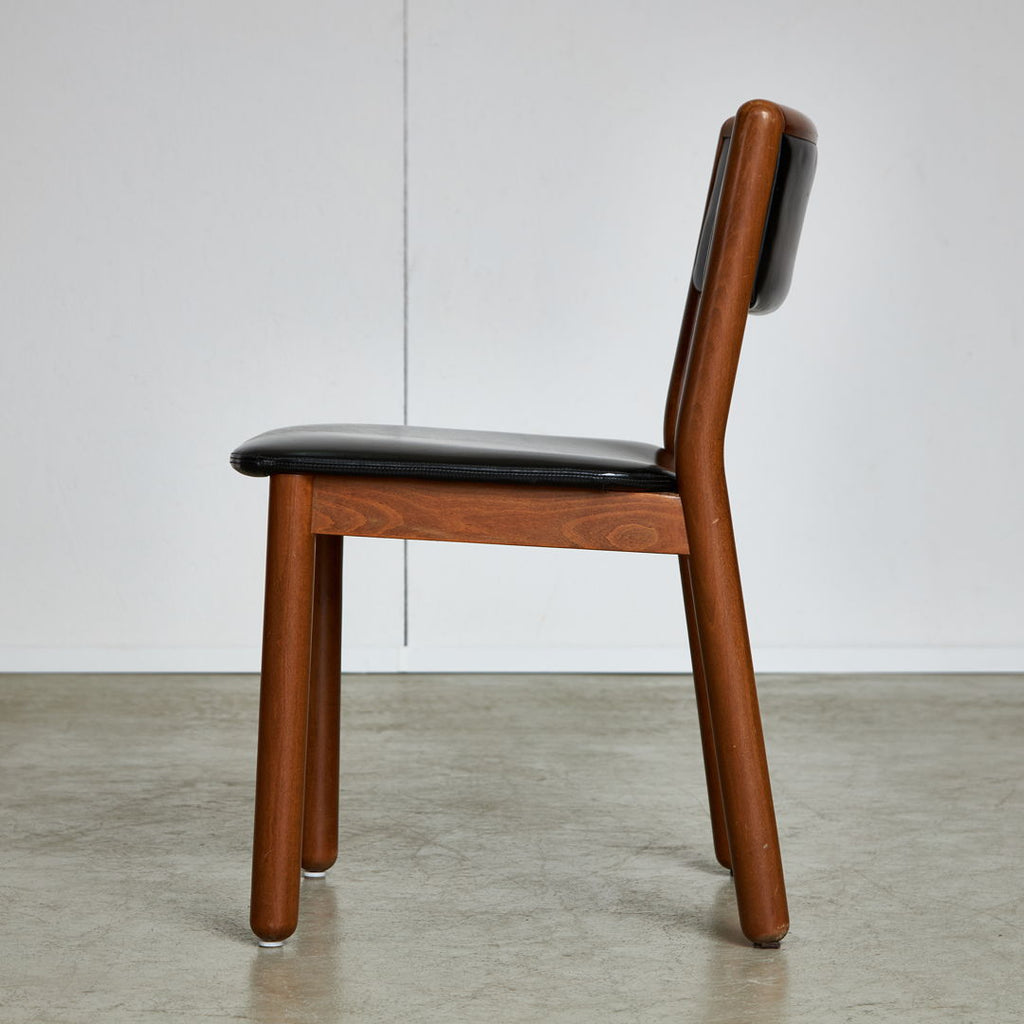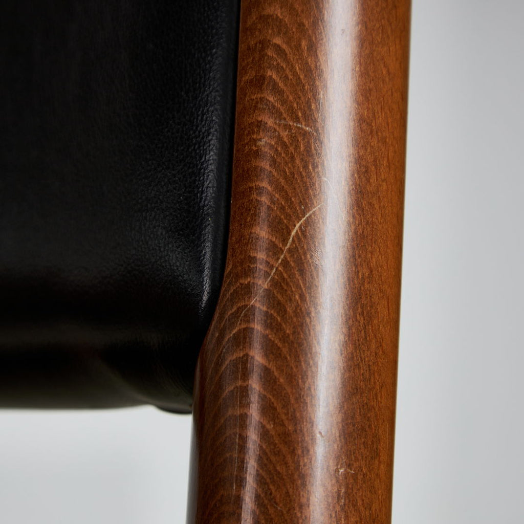 A collection of six Italian chairs, with glossy finish beech wood and black leather. The unique shape of the chairs includes slightly bent rear elements, creating a stylish and classy look. The combination of colour and materials elevates the chairs to a higher level of sophistication, accentuated by the glossy finish on the wood. While remaining modest pieces, these chairs are refined, and offer comfortable seating with soft cushions, designed to be both functional and visually appealing. One chair shows a repaired crack on the upper corner, along with minor signs of wear on some parts.