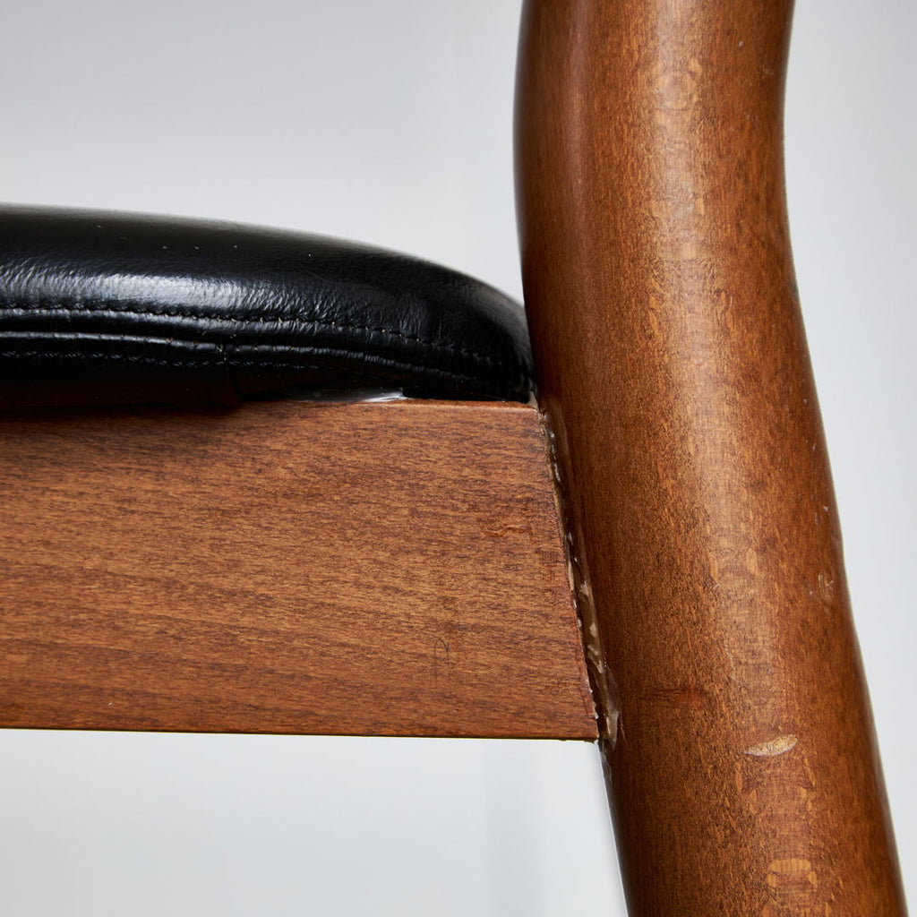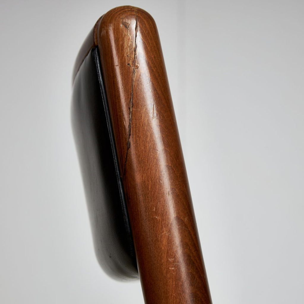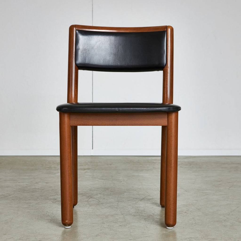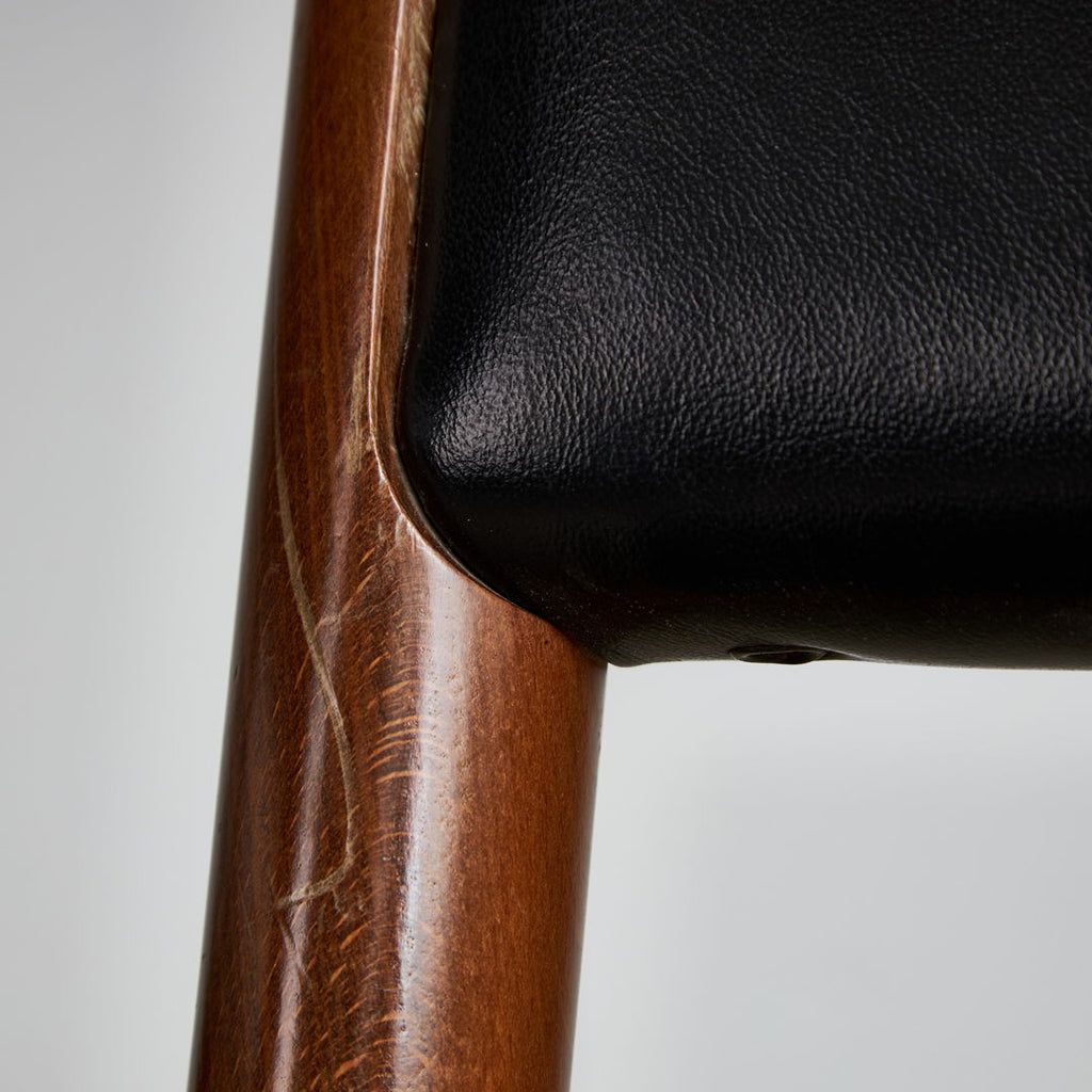 A collection of six Italian chairs, with glossy finish beech wood and black leather. The unique shape of the chairs includes slightly bent rear elements, creating a stylish and classy look. The combination of colour and materials elevates the chairs to a higher level of sophistication, accentuated by the glossy finish on the wood. While remaining modest pieces, these chairs are refined, and offer comfortable seating with soft cushions, designed to be both functional and visually appealing. One chair shows a repaired crack on the upper corner, along with minor signs of wear on some parts.
