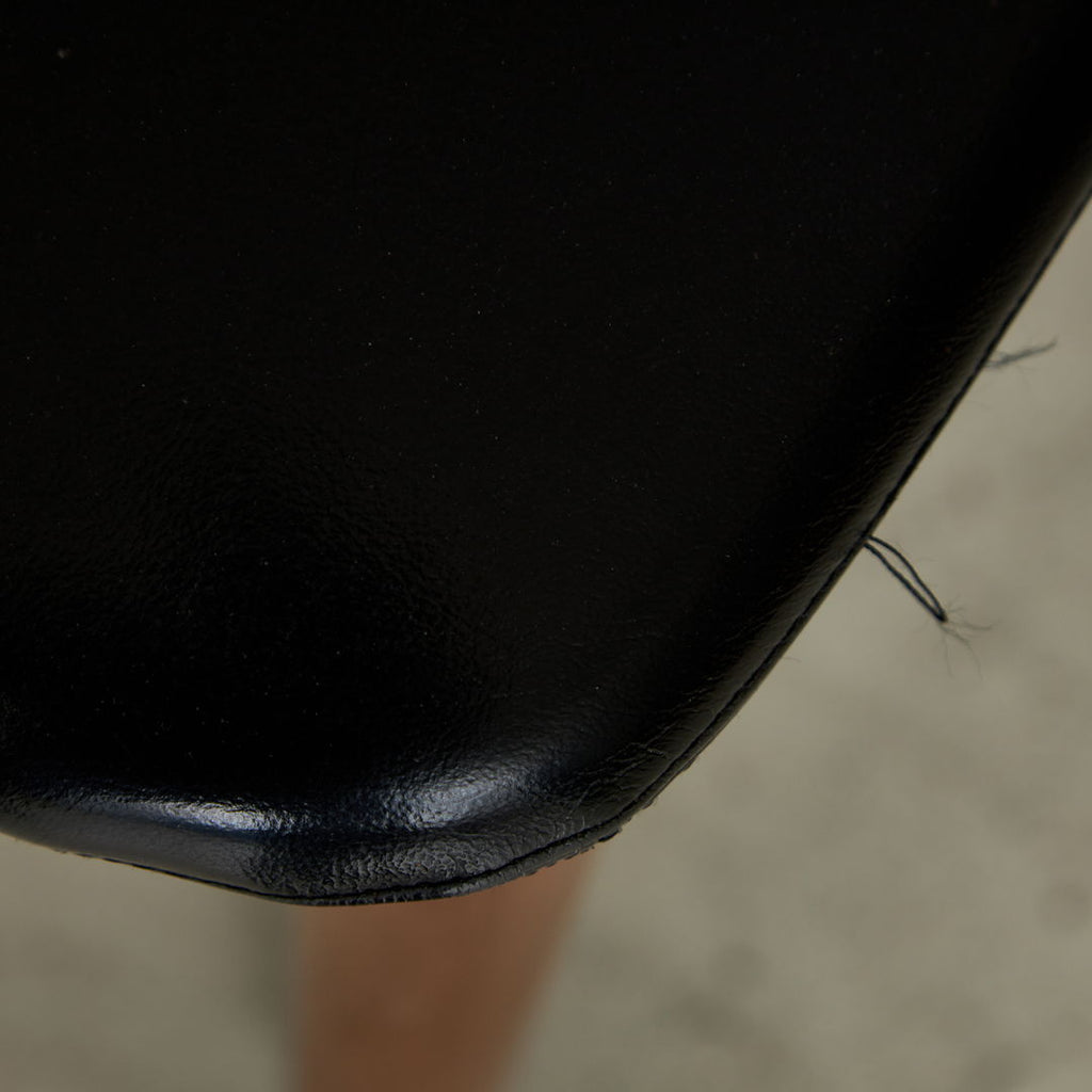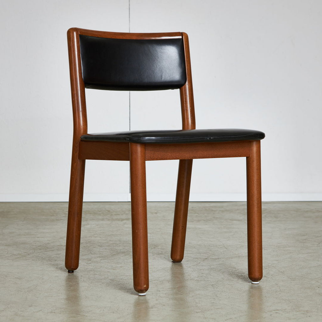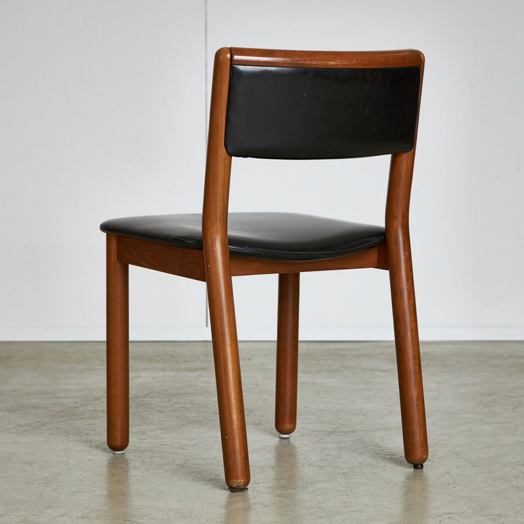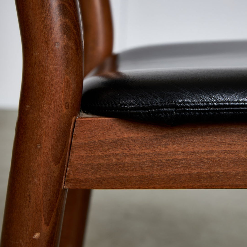 A collection of six Italian chairs, with glossy finish beech wood and black leather. The unique shape of the chairs includes slightly bent rear elements, creating a stylish and classy look. The combination of colour and materials elevates the chairs to a higher level of sophistication, accentuated by the glossy finish on the wood. While remaining modest pieces, these chairs are refined, and offer comfortable seating with soft cushions, designed to be both functional and visually appealing. One chair shows a repaired crack on the upper corner, along with minor signs of wear on some parts.