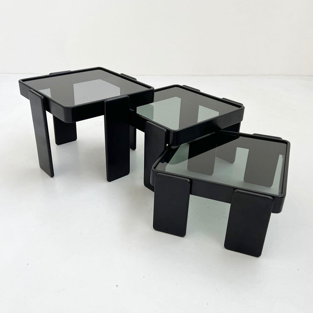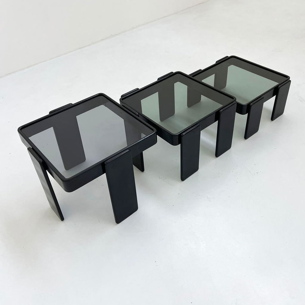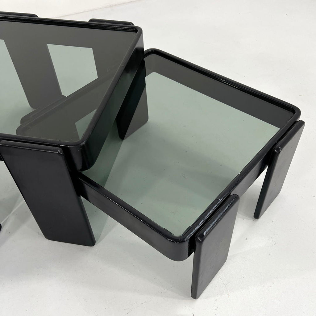 Cassina를 위한 Gianfranco Frattini의 네스팅 테이블 세트, 1970년대 디자이너 - Gianfranco Frattini 프로듀서 - Cassina 모델 - 네스팅 테이블 디자인 기간 - 70년대 측정 - 폭 58cm x 깊이 58cm x 높이 46cm 재질 - 페인트 목재, 유리 색상 - 검정색, 연기 상태 - 좋음 코멘트 - 세월과 사용감에 걸맞는 가벼운 마모입니다. 페인트 복원. 가장 큰 테이블의 유리는 동일하지 않거나 연한 연기 색상입니다.
