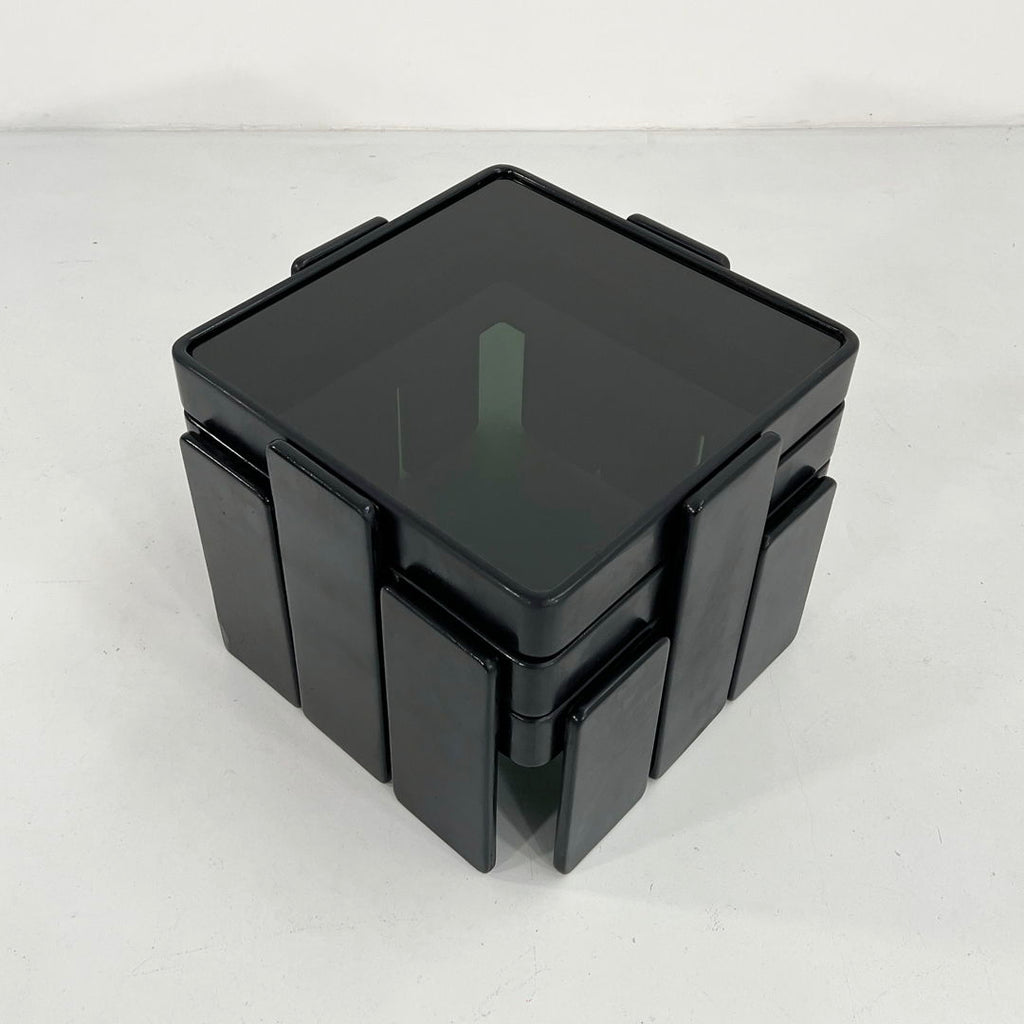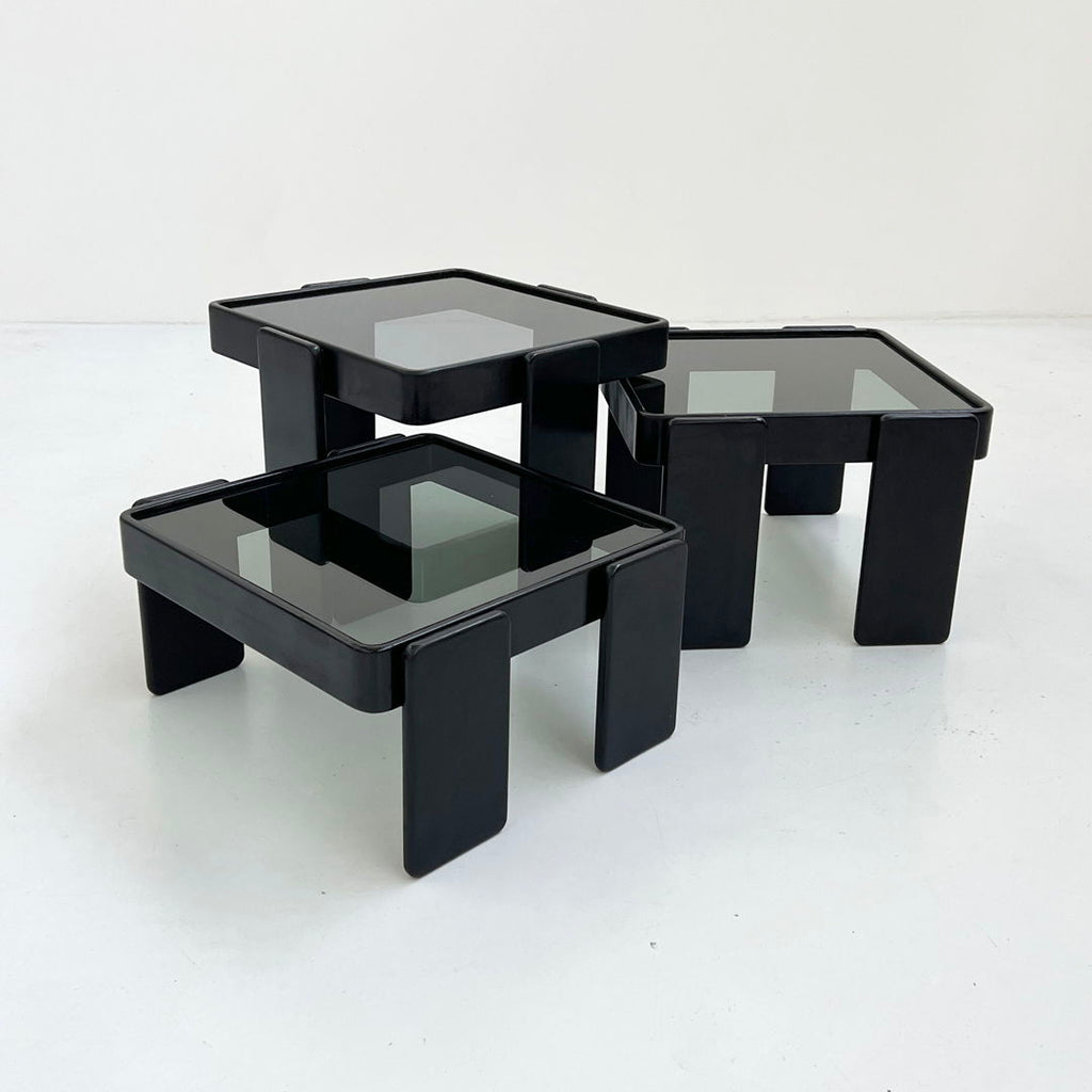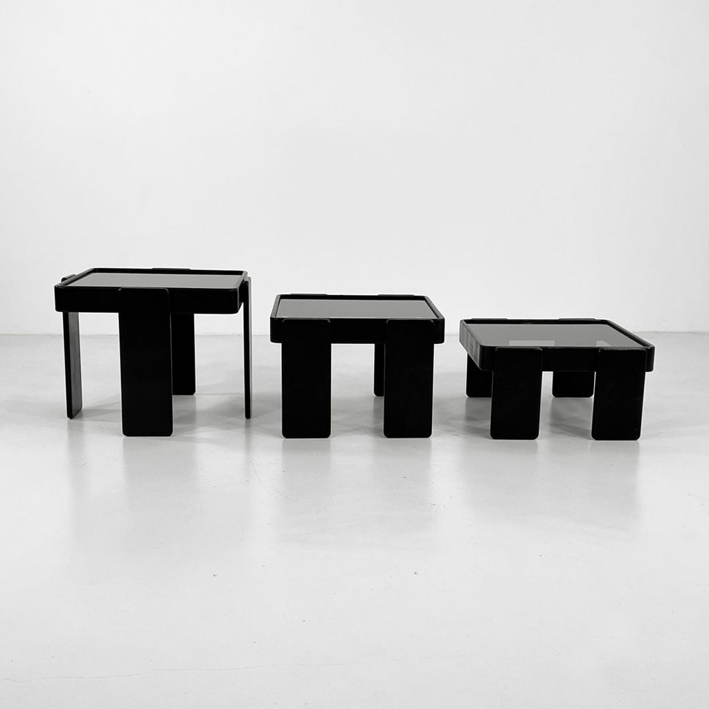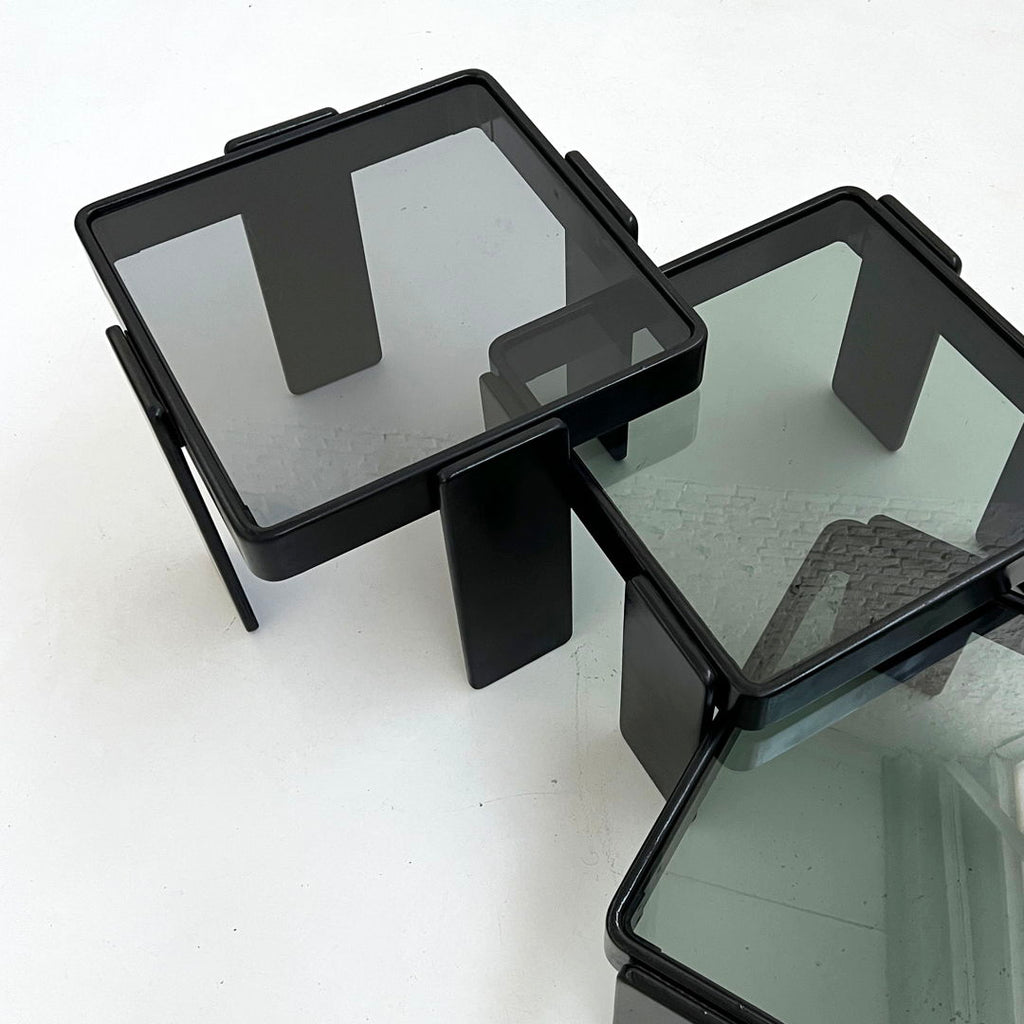 Cassina를 위한 Gianfranco Frattini의 네스팅 테이블 세트, 1970년대 디자이너 - Gianfranco Frattini 프로듀서 - Cassina 모델 - 네스팅 테이블 디자인 기간 - 70년대 측정 - 폭 58cm x 깊이 58cm x 높이 46cm 재질 - 페인트 목재, 유리 색상 - 검정색, 연기 상태 - 좋음 코멘트 - 세월과 사용감에 걸맞는 가벼운 마모입니다. 페인트 복원. 가장 큰 테이블의 유리는 동일하지 않거나 연한 연기 색상입니다.