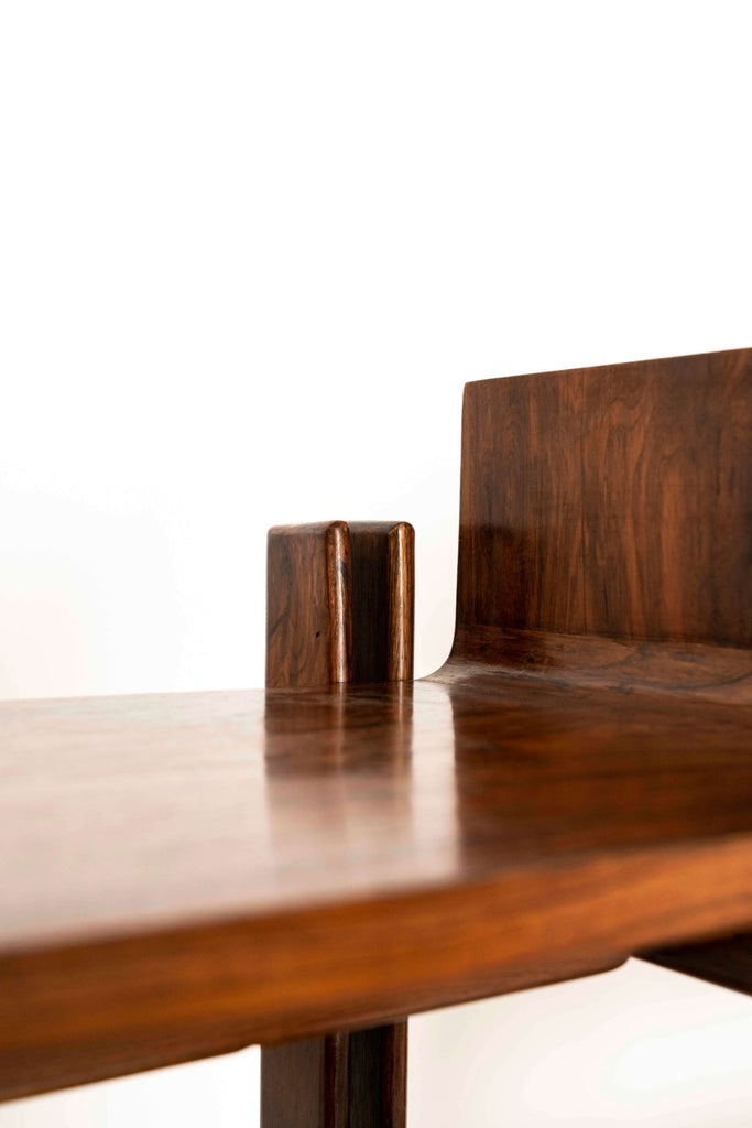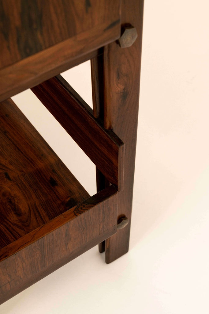 이 세트는 페로바 나무, 합판, 황동으로 만들어졌습니다. 책장은 구조가 디자인의 일부인 황동 손잡이와 함께 고정되는 나무 판자의 아주 멋진 구조를 가지고 있습니다.