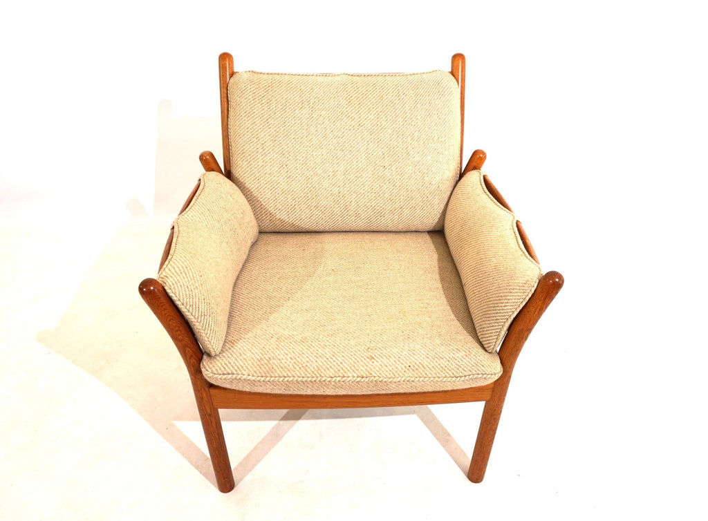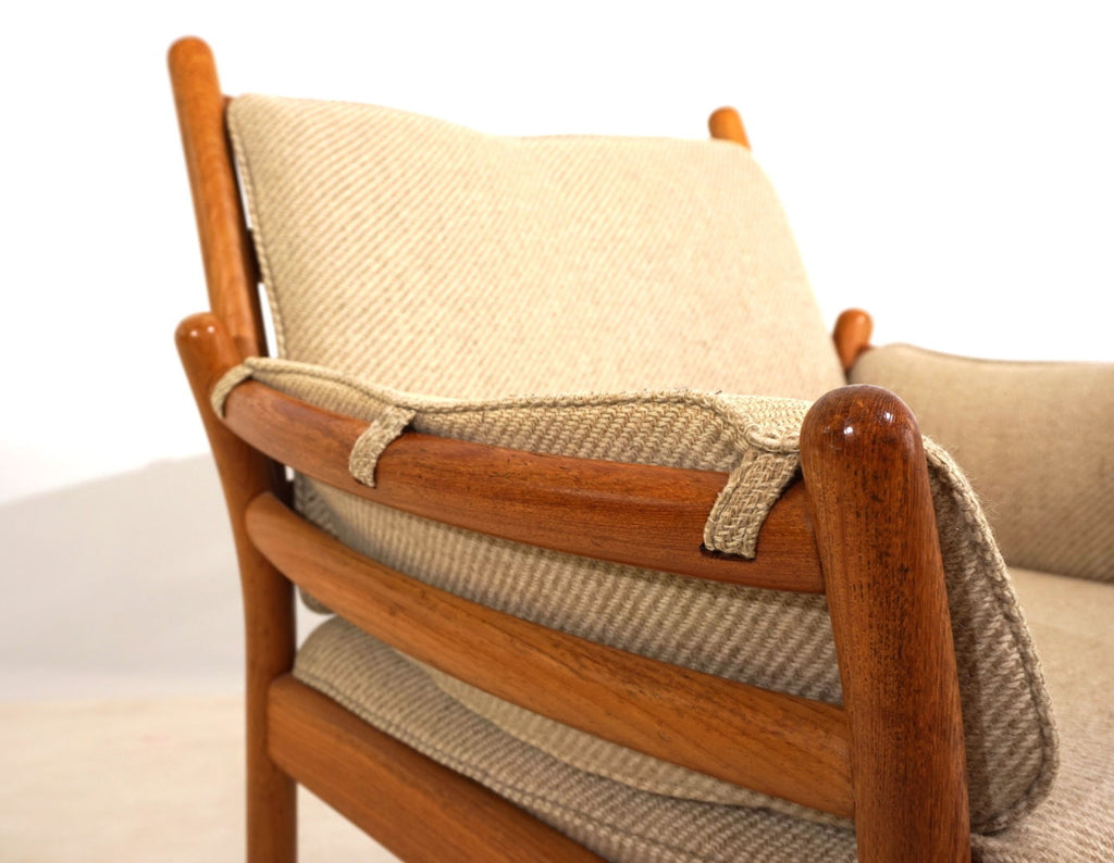 A Genius teak armchair in excellent condition from CFC Silkeborg. The attractive wooden frame with a very beautiful grain and a honey-colored color shows hardly any signs of wear. The covers, which are made from a beige brown wool fabric, are also in perfect condition. The armchair offers very good seating comfort. Cfc Silkeborg was one of the most famous Danish furniture manufacturers, dealing with Danish teak and collaborating with the best designers. These armchairs were designed by Illum Wikkelso in the 1960s.