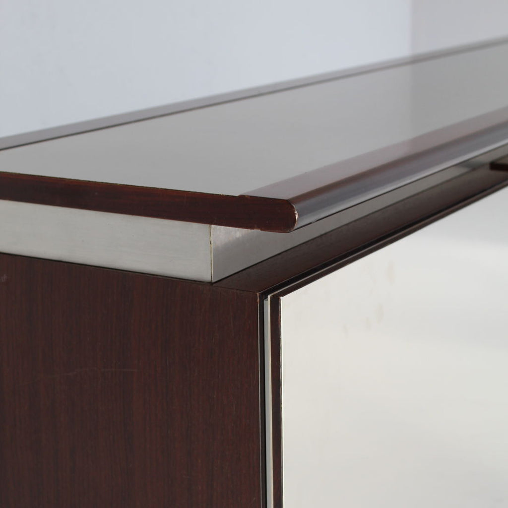 Giotto Stoppino와 Marco Acerbis가 Acerbis를 위해 제작한 이탈리안 모던 원목과 알루미늄 Parioli 사이드보드, 1950년대 브랜드 현재. Parioli 모델 사이드보드는 알루미늄 마감 및 프로파일이 있는 원목 구조, 내부 유리 선반이 있는 힌지 도어 2개, 서랍이 있는 중앙 모듈로 구성되어 있습니다. 좋은 조건. 크기: h73.5 x D43.5 x L190cm