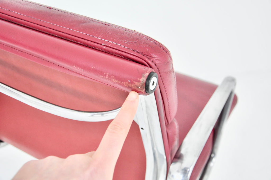 알루미늄 베이스와 바퀴가 달린 버건디 가죽 안락의자 6개 세트. 그들은 스스로 켜집니다. 좌석 높이 52cm. 시간과 나이로 인한 마모.
