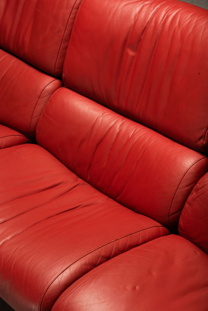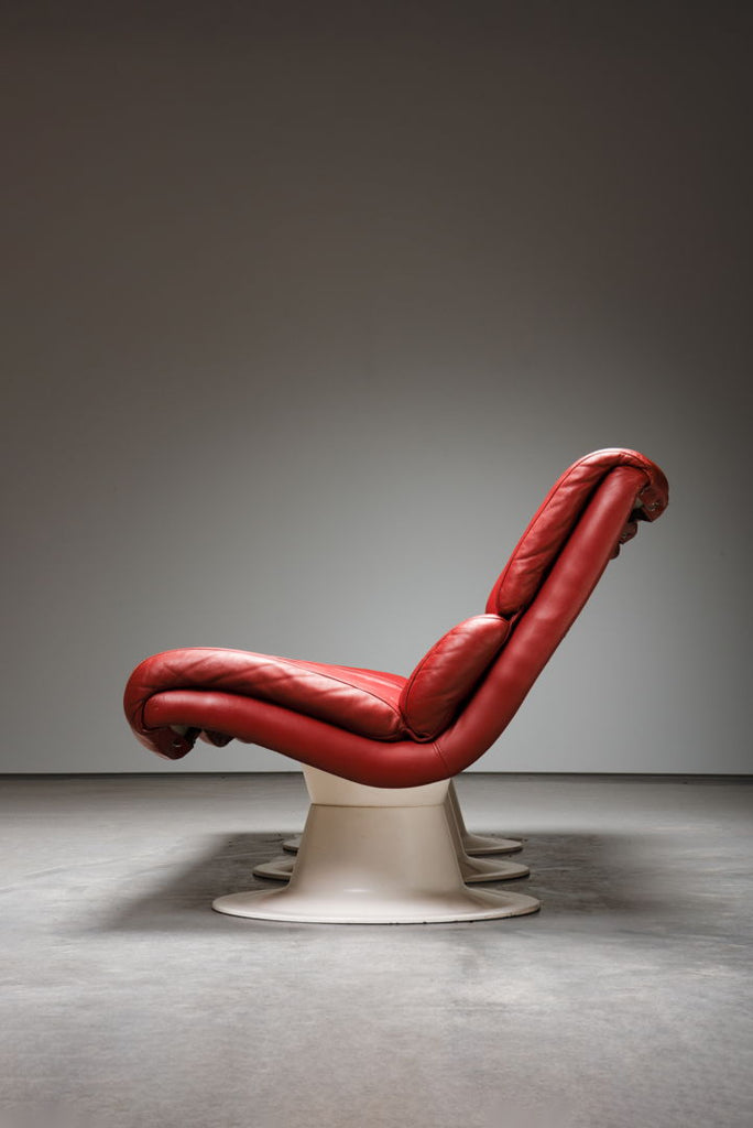 This space age sofa is made in white lacquered moulded fiberglass frame and covered in interchangeable cushions, upholstered in patinated red-brown leather.