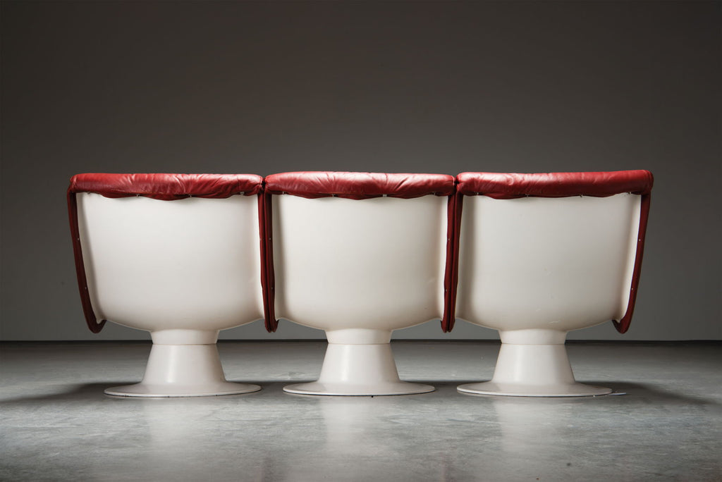 'Saturnus' 3인용 소파는 Yrjö Kukkapuro가 1960년대 핀란드 하이미를 위해 디자인한 것입니다. 이 우주 시대 소파는 흰색 래커 처리된 성형 섬유 유리 프레임으로 제작되었으며, 녹청 처리된 적갈색 가죽으로 장식된 교체 가능한 쿠션으로 덮여 있습니다. 가죽은 마모 및 사용 흔적이 있는 파티나 처리된 상태입니다. 또한, 유리섬유에는 약간의 찌그러짐이나 긁힌 자국이 있는데, 이는 연식에 비해 정상적인 현상입니다.