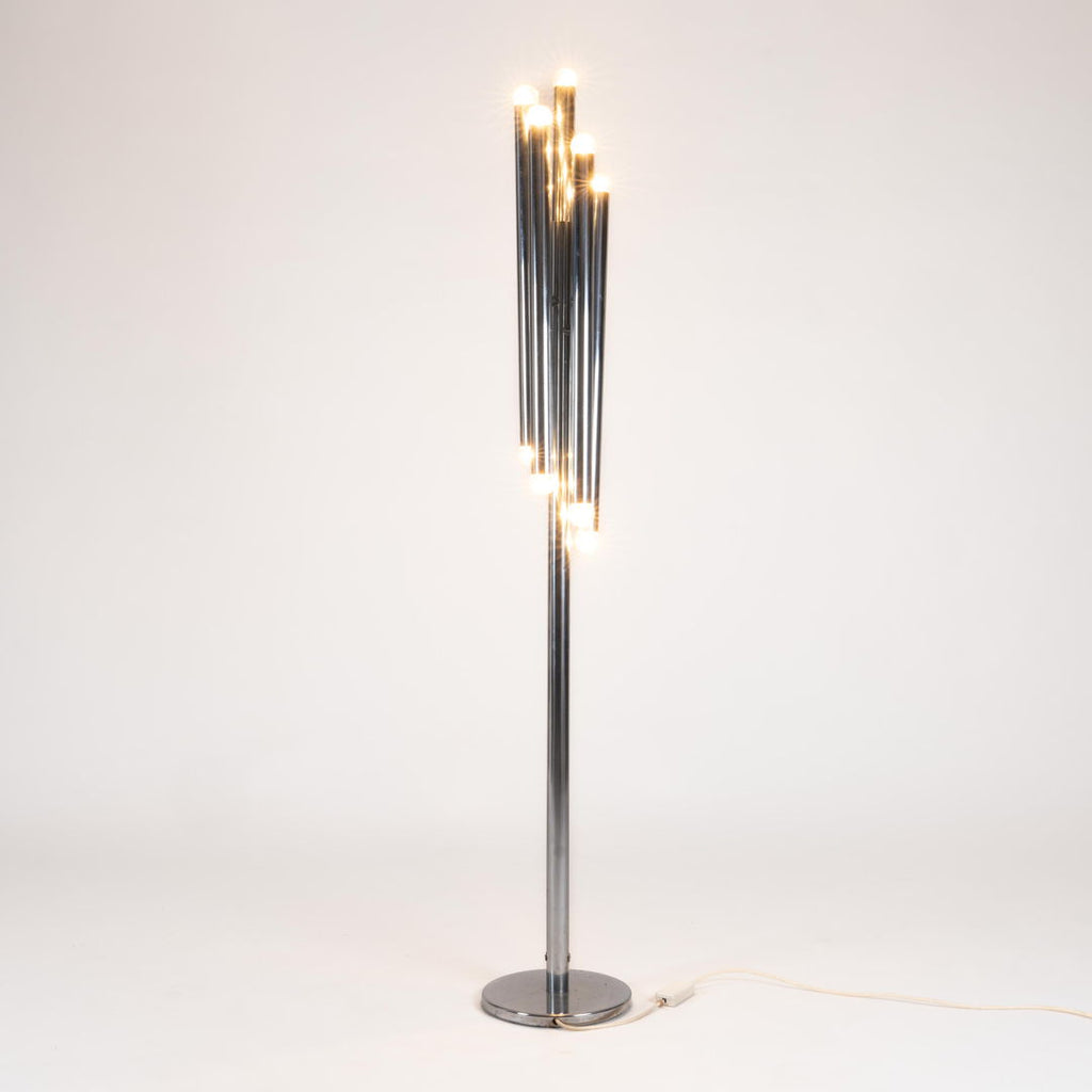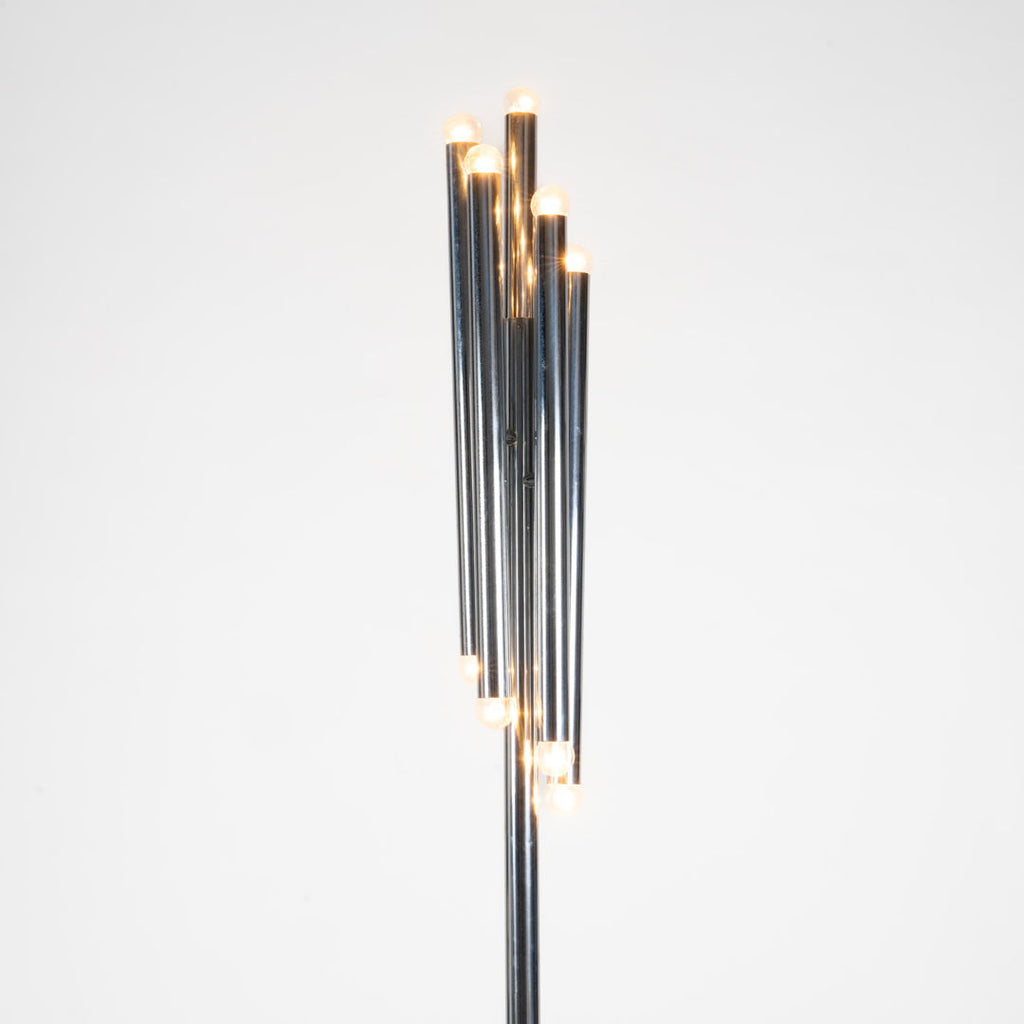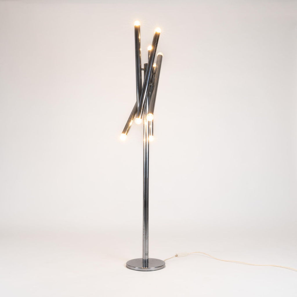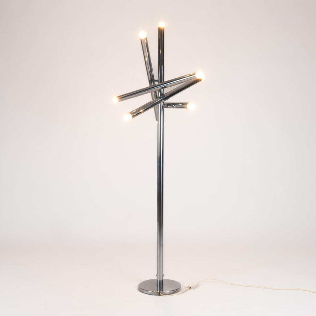 Stilux Milano의 크롬 소재의 절묘한 플로어 램프. 팔은 원하는 방향으로 움직일 수 있습니다. 이탈리아 디자인의 조각적이고 매우 희귀한 작품입니다! 밝기 조절 가능