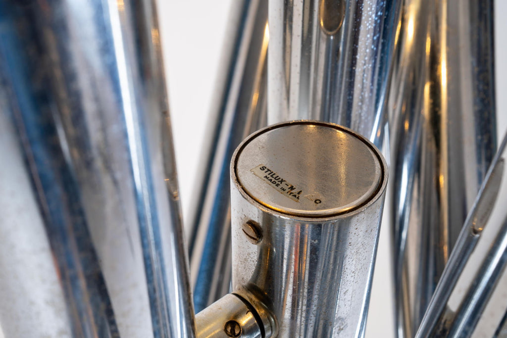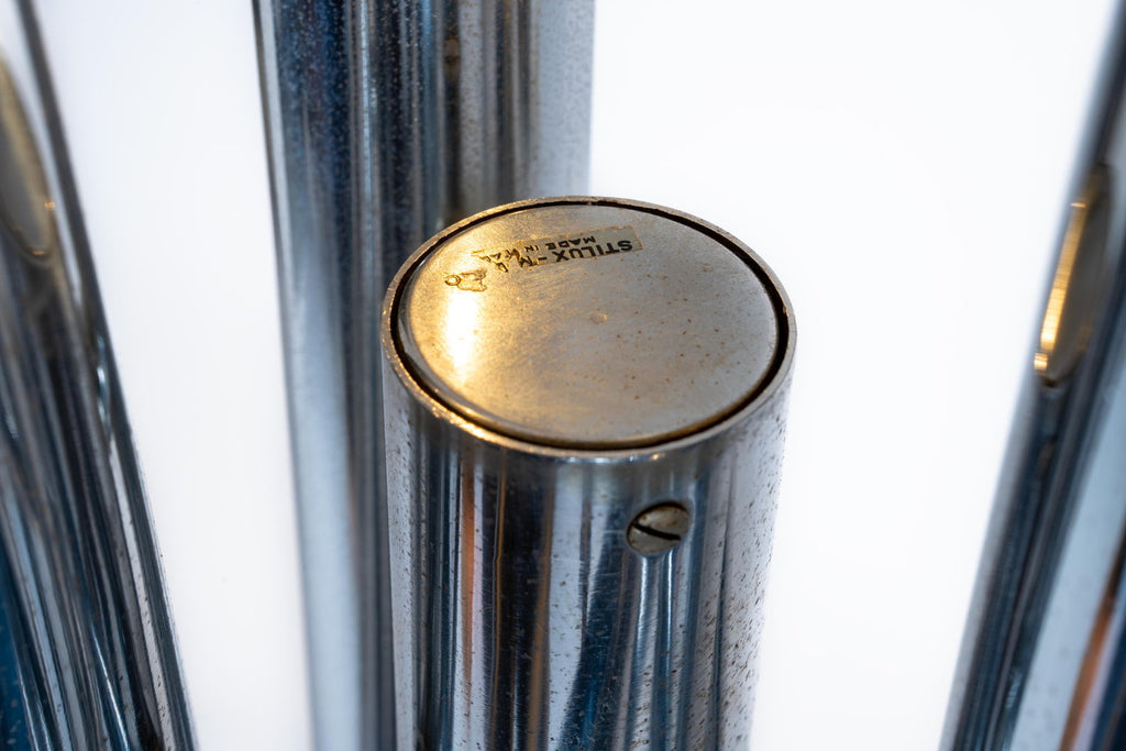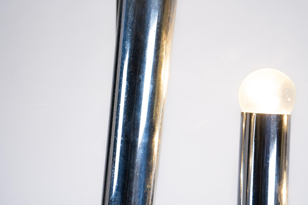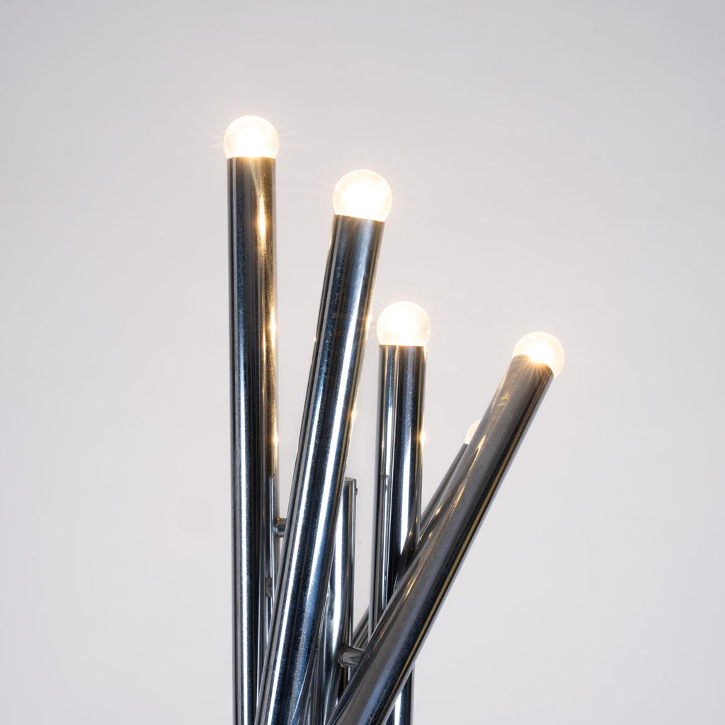 Stilux Milano의 크롬 소재의 절묘한 플로어 램프. 팔은 원하는 방향으로 움직일 수 있습니다. 이탈리아 디자인의 조각적이고 매우 희귀한 작품입니다! 밝기 조절 가능