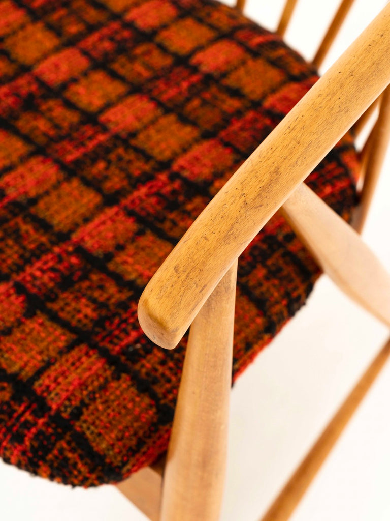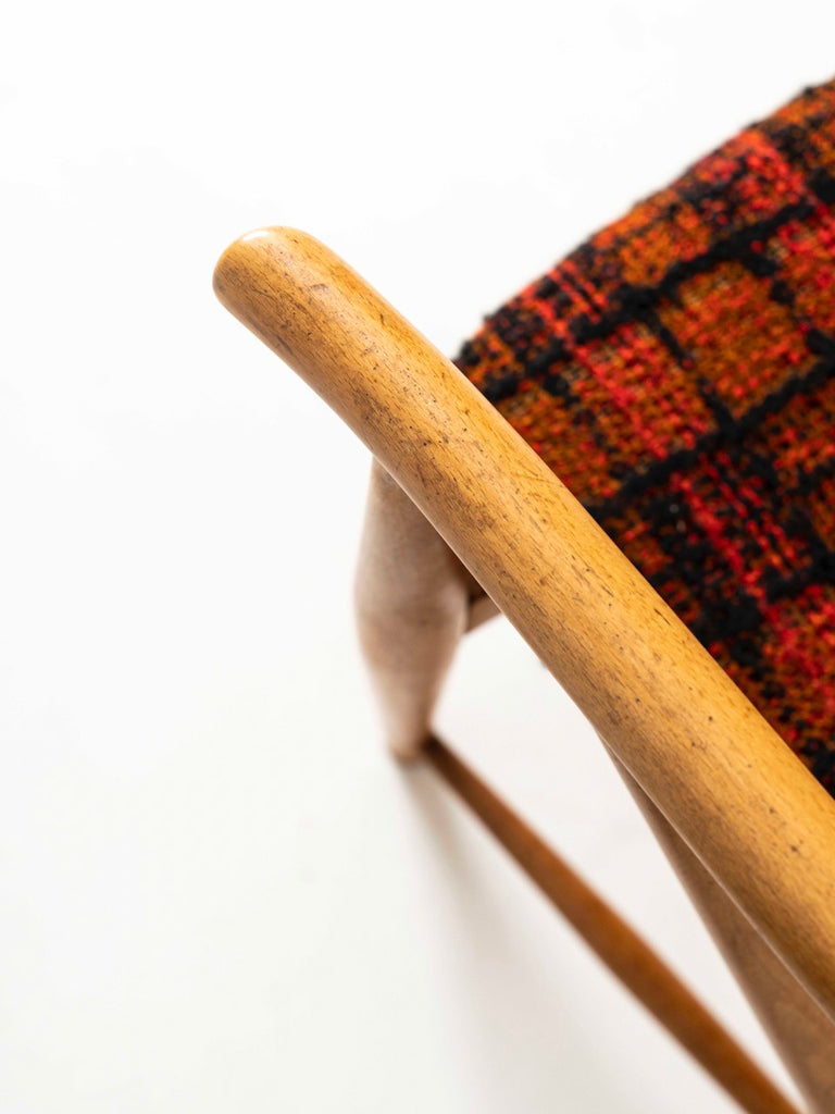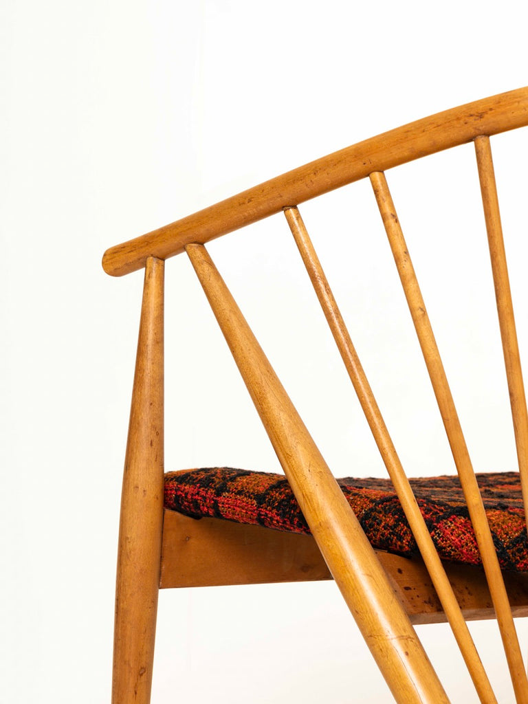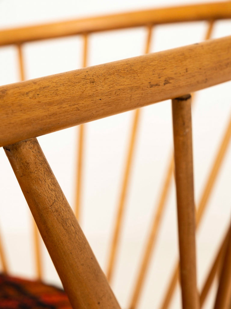 이 상징적인 빈티지 라운지 체어는 스칸디나비아 장인 정신의 한 예입니다. 등받이의 모양과 등뼈는 떠오르는 태양이나 태양열을 나타냅니다. 좌석 쿠션 역시 잘 관리된 상태 입니다.