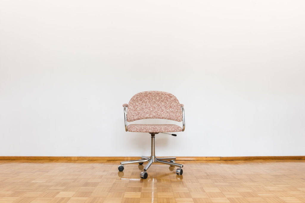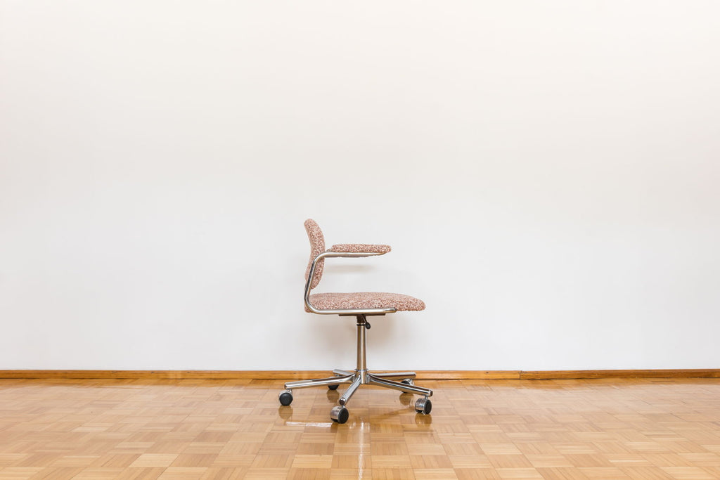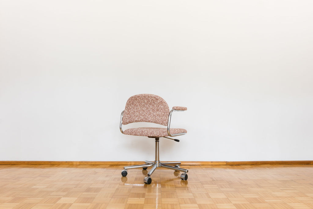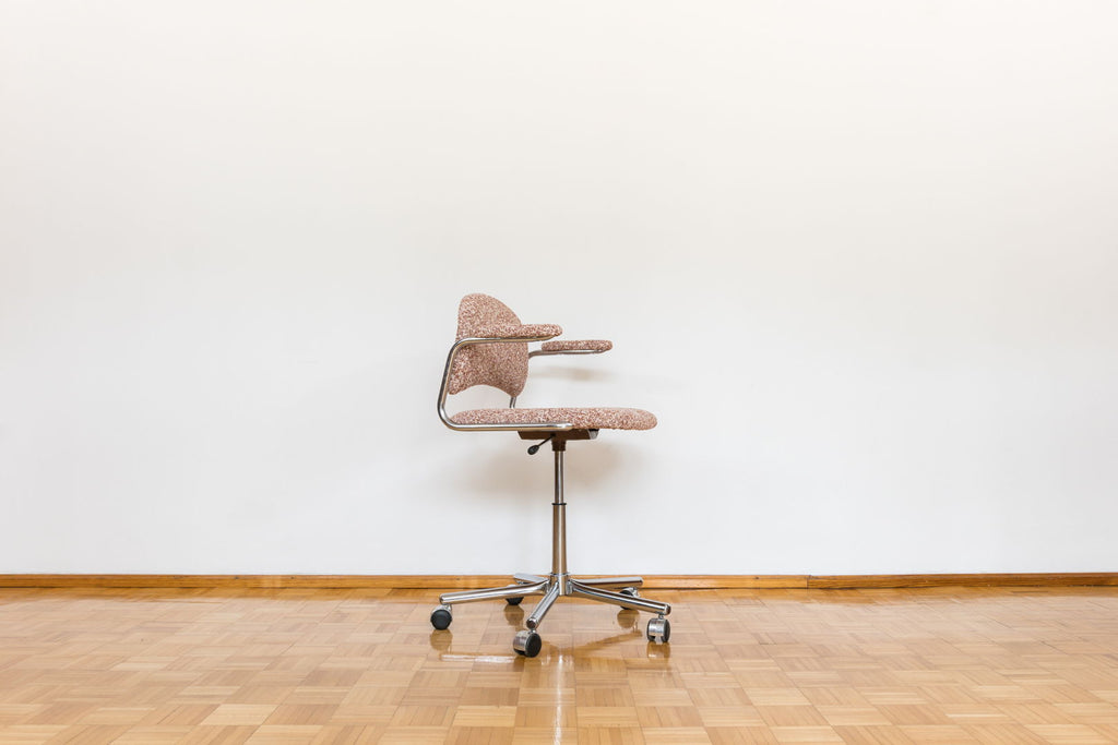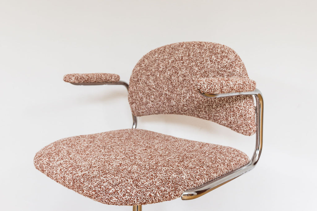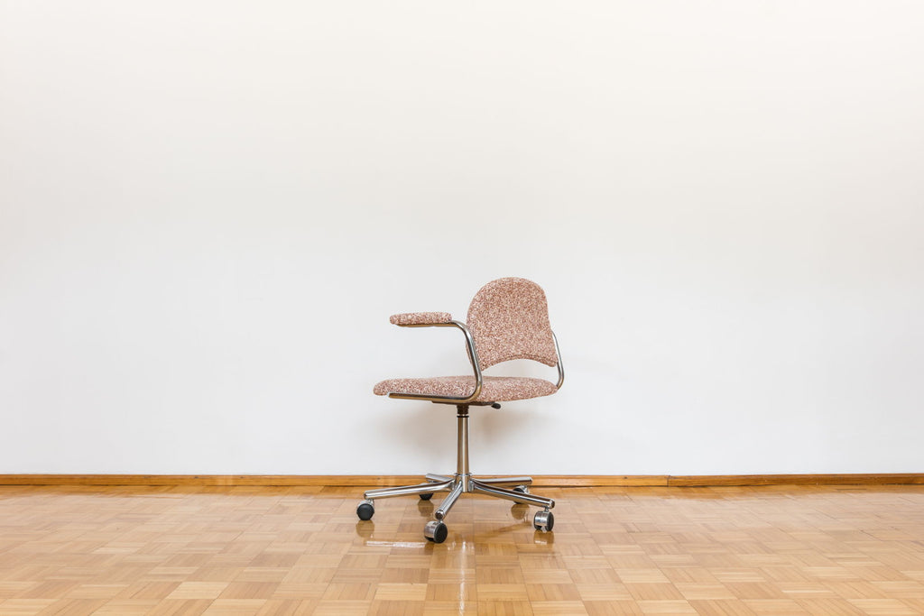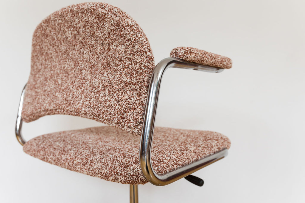 회전 의자(체코 공화국 코보나), 1990년대 크바드라트(Kvadrat)의 흰색과 빨간색(테라코타 색상) 부클 패브릭으로 다시 덮은 의자. 금속 스타 베이스에 바퀴가 달린 의자 받침대(금속 부품은 크롬 도금) 좌석 높이 43-55cm