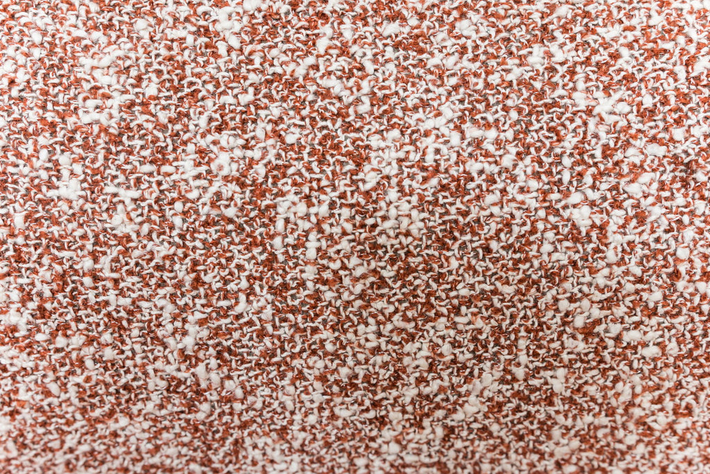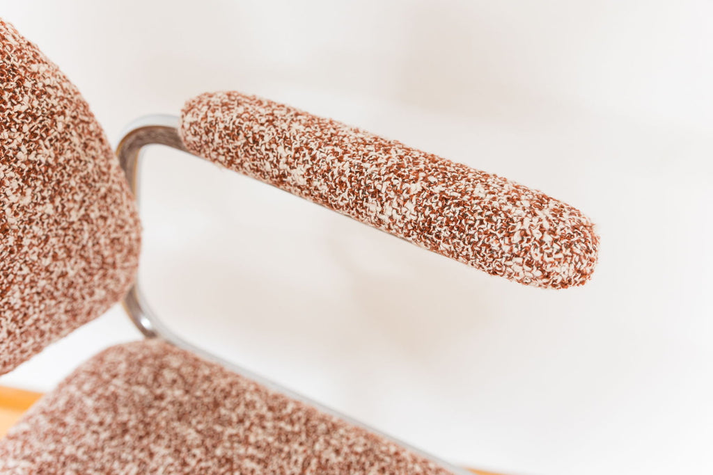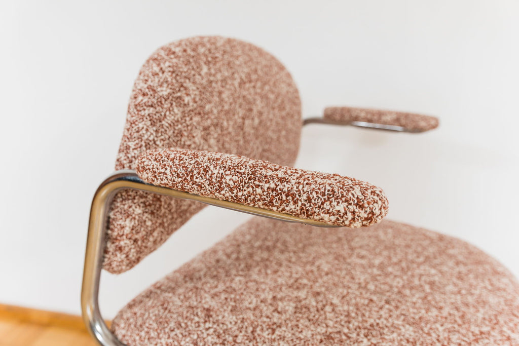 Reupholstered chair in white and red (terracotta colour) boucle fabric from Kvadrat.