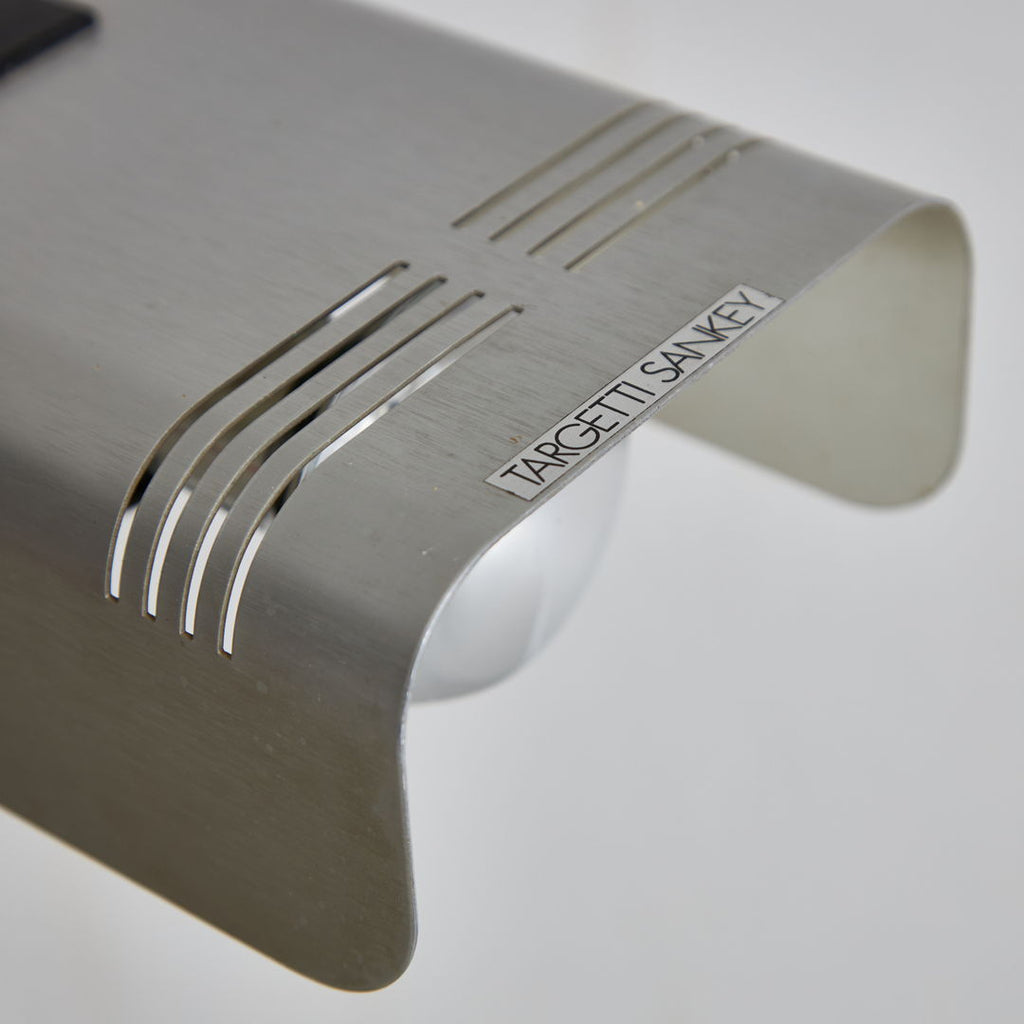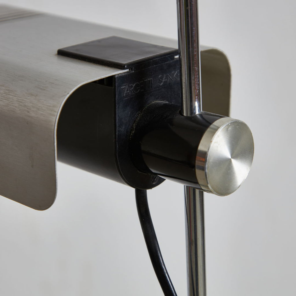 The timeless elegance and functionality meet in this floor lamp designed by Targetti Sankey for Targetti Sankey in the 1960s. Standing on a black metal base with plastic sole, featuring an adjustable chrome stem and silver-gray bent aluminum shade. This item has minor surface scratches and light wear appropriate to age and use.