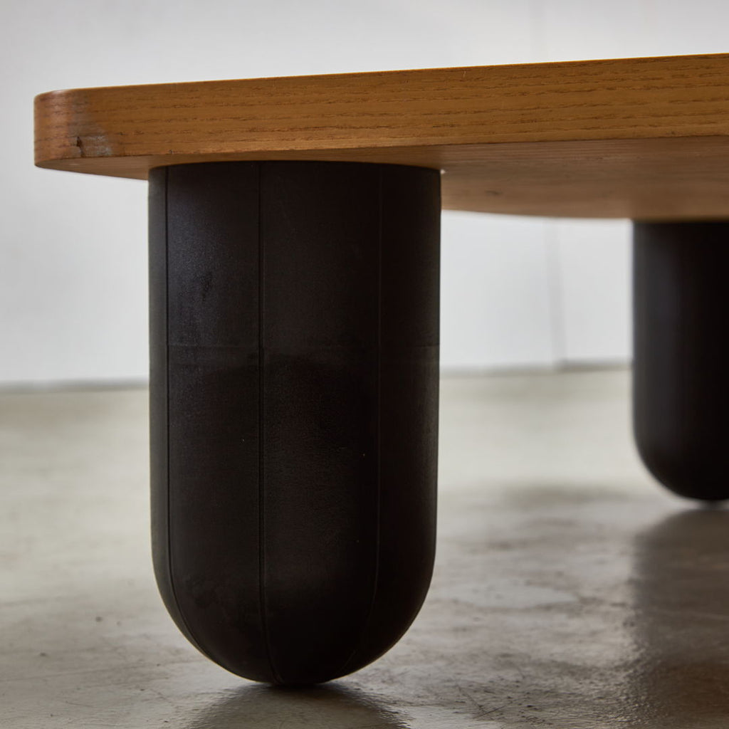 Square low coffee table with black, plastic cylindrical legs. The Tavolino Petalo modell was designed for Design Research in the 1960s. The ash wood table features curved edges and is a minimalist piece with timeless design. This item is in an excellent condition, showing minor signs of use on the legs and tiny cracks on the table top’s edges.