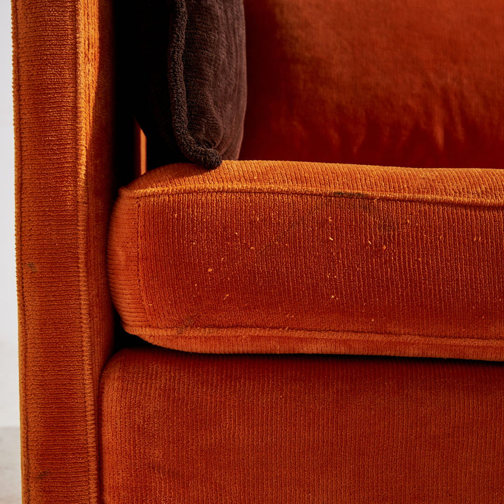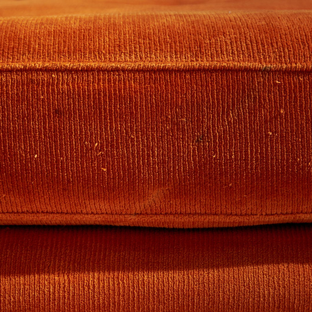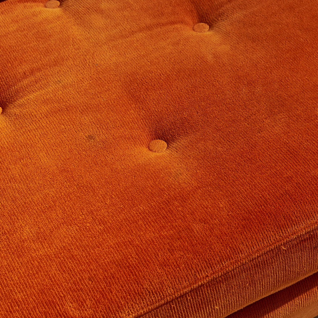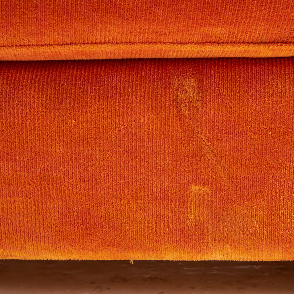 Three-seater Dux sofa with velvet upholstery and cushions from the 1970s. With some wear and stains on the upholstery. In vintage condition with some signs of use.
