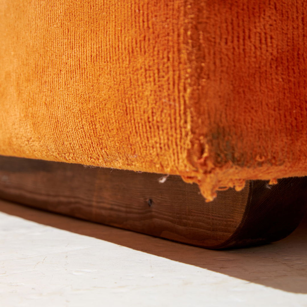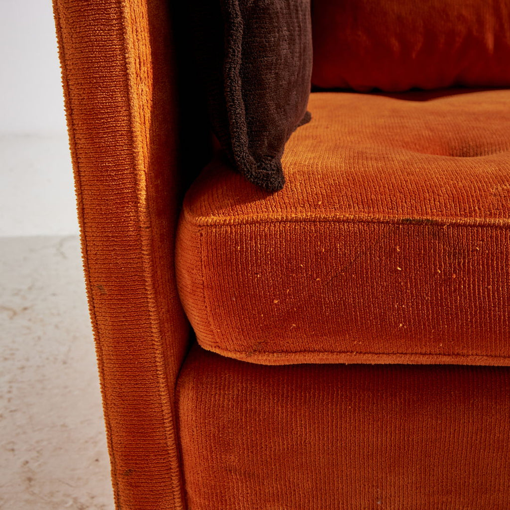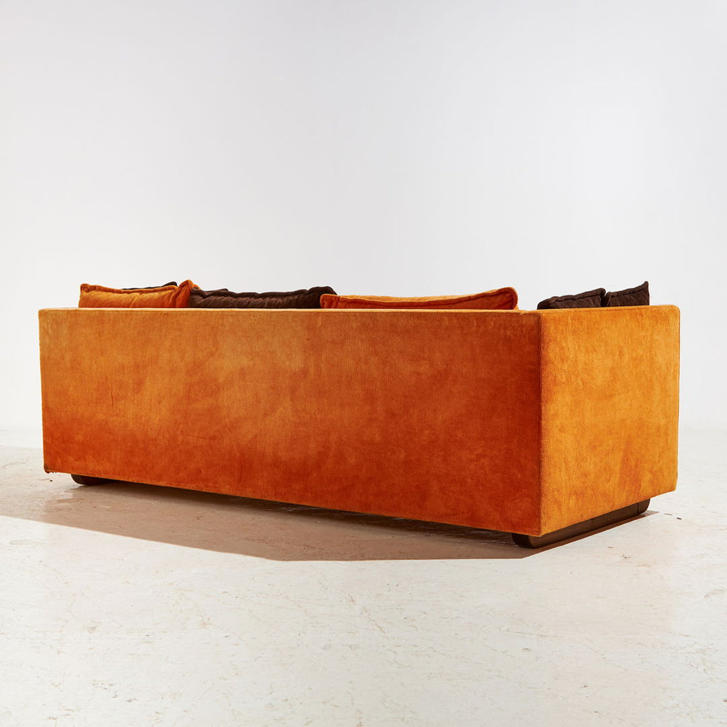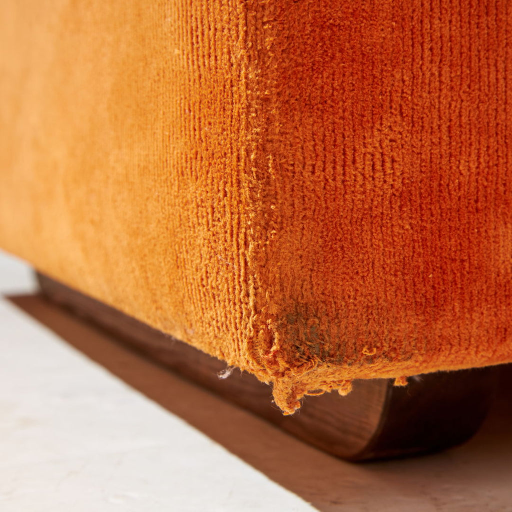 Three-seater Dux sofa with velvet upholstery and cushions from the 1970s. With some wear and stains on the upholstery. In vintage condition with some signs of use.
