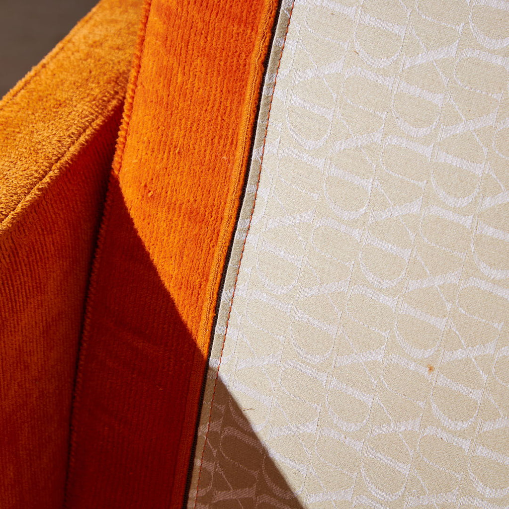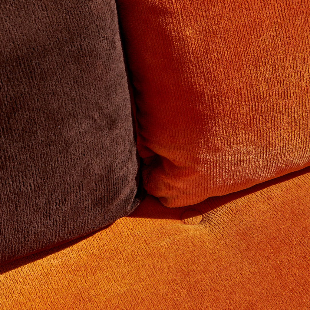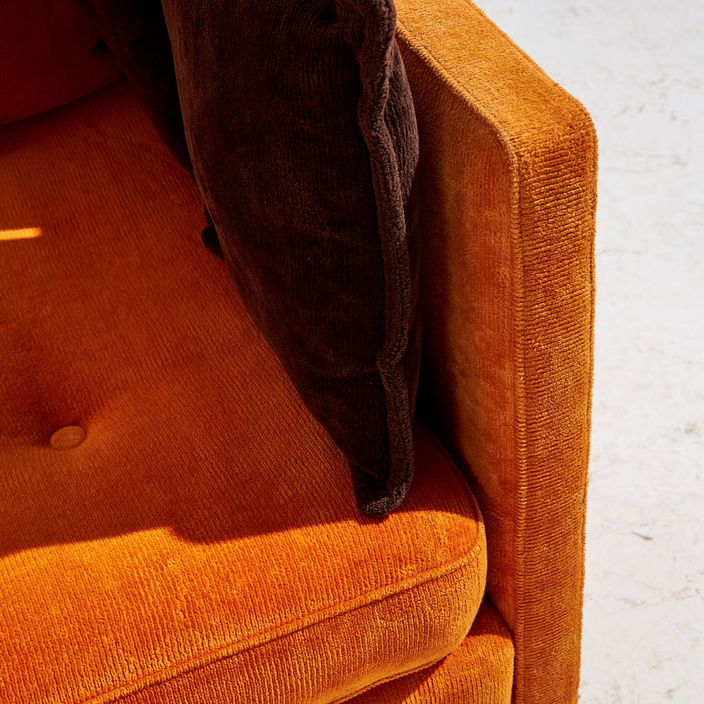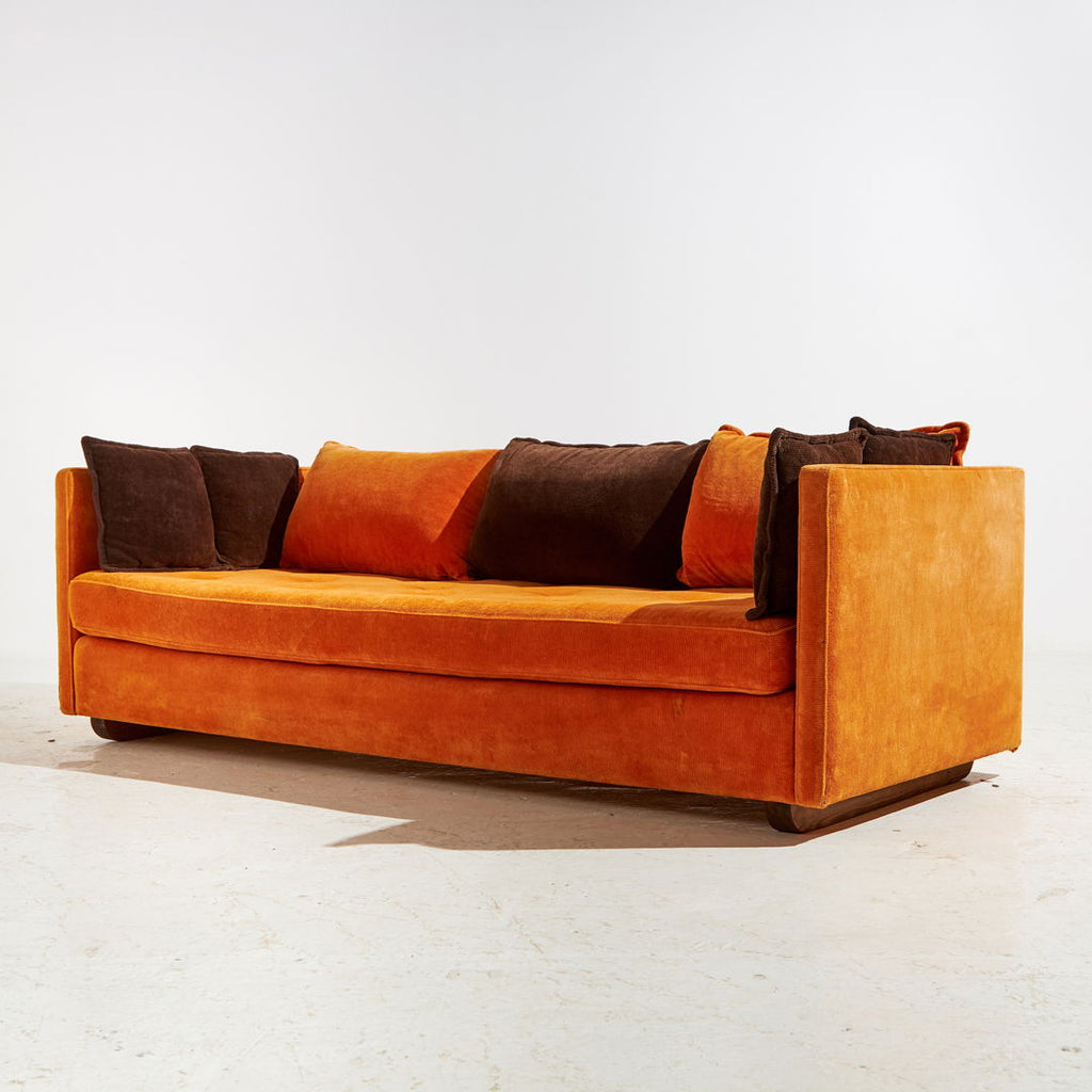 Three-seater Dux sofa with velvet upholstery and cushions from the 1970s. With some wear and stains on the upholstery. In vintage condition with some signs of use.