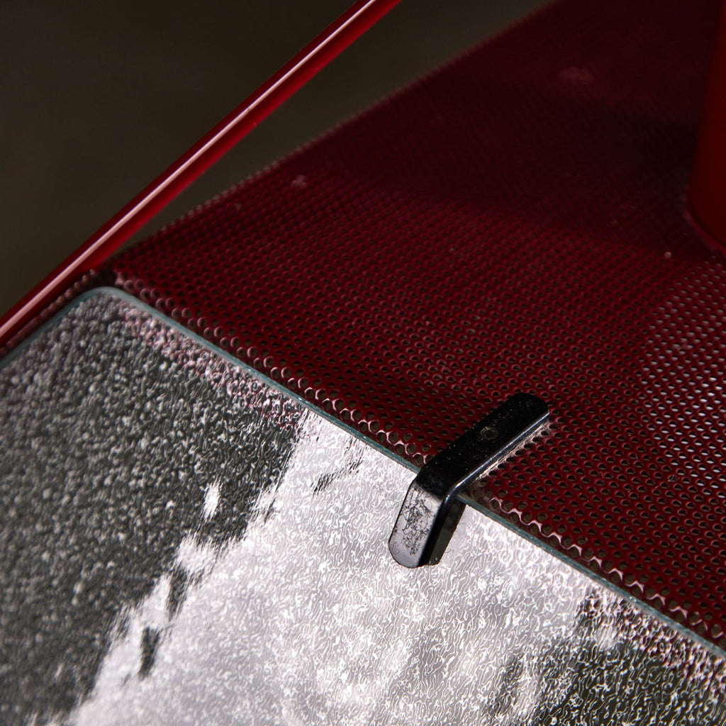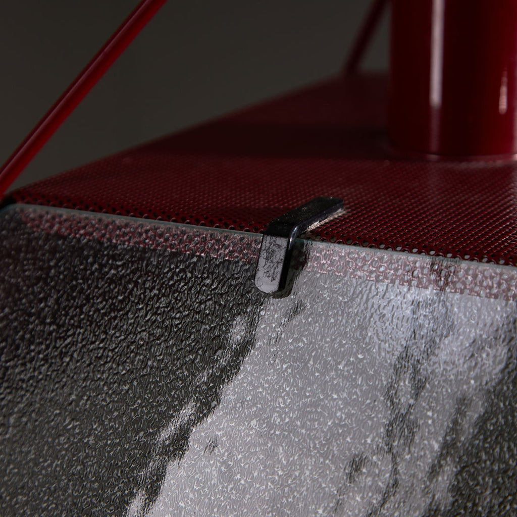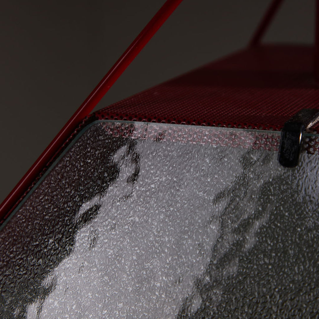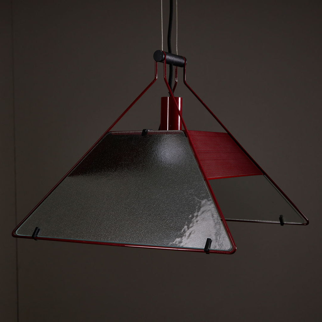 Burgundy postmodern trapezoidal metal pendant lamp with textured glass insert. The Trapezio modell was designed by Alberto Salvati & Ambrogio Tresoldi for Lucy in the 1980s. This item is in an excellent vintage condition with minor signs of use.