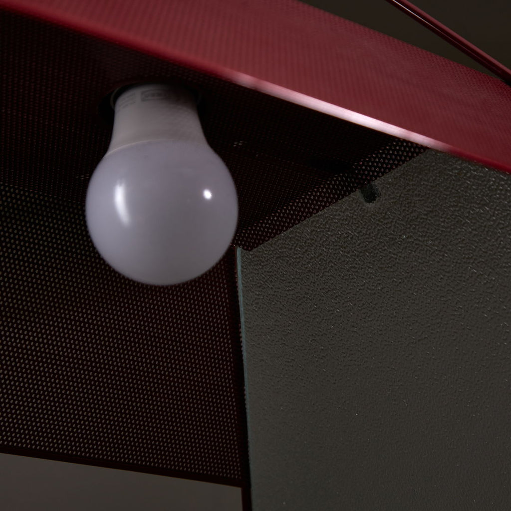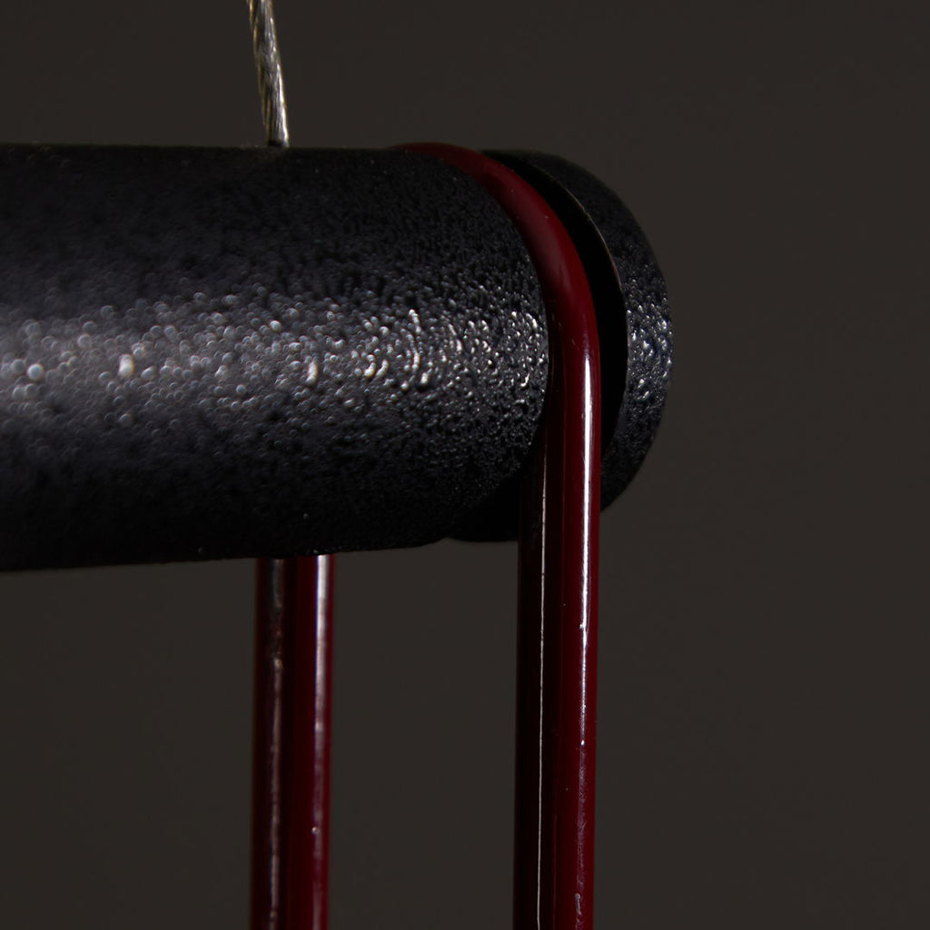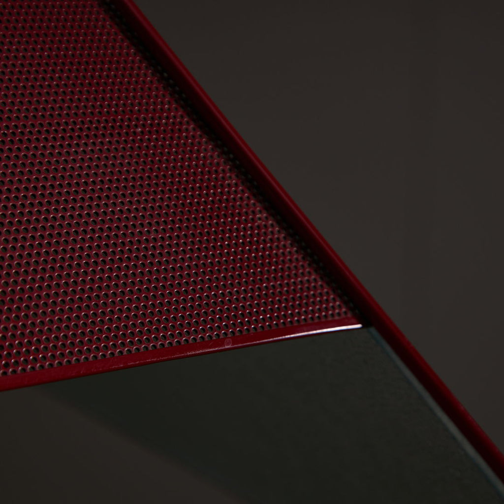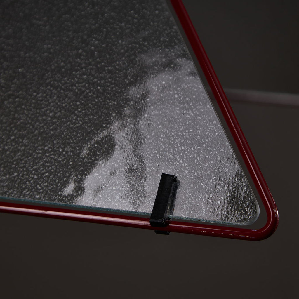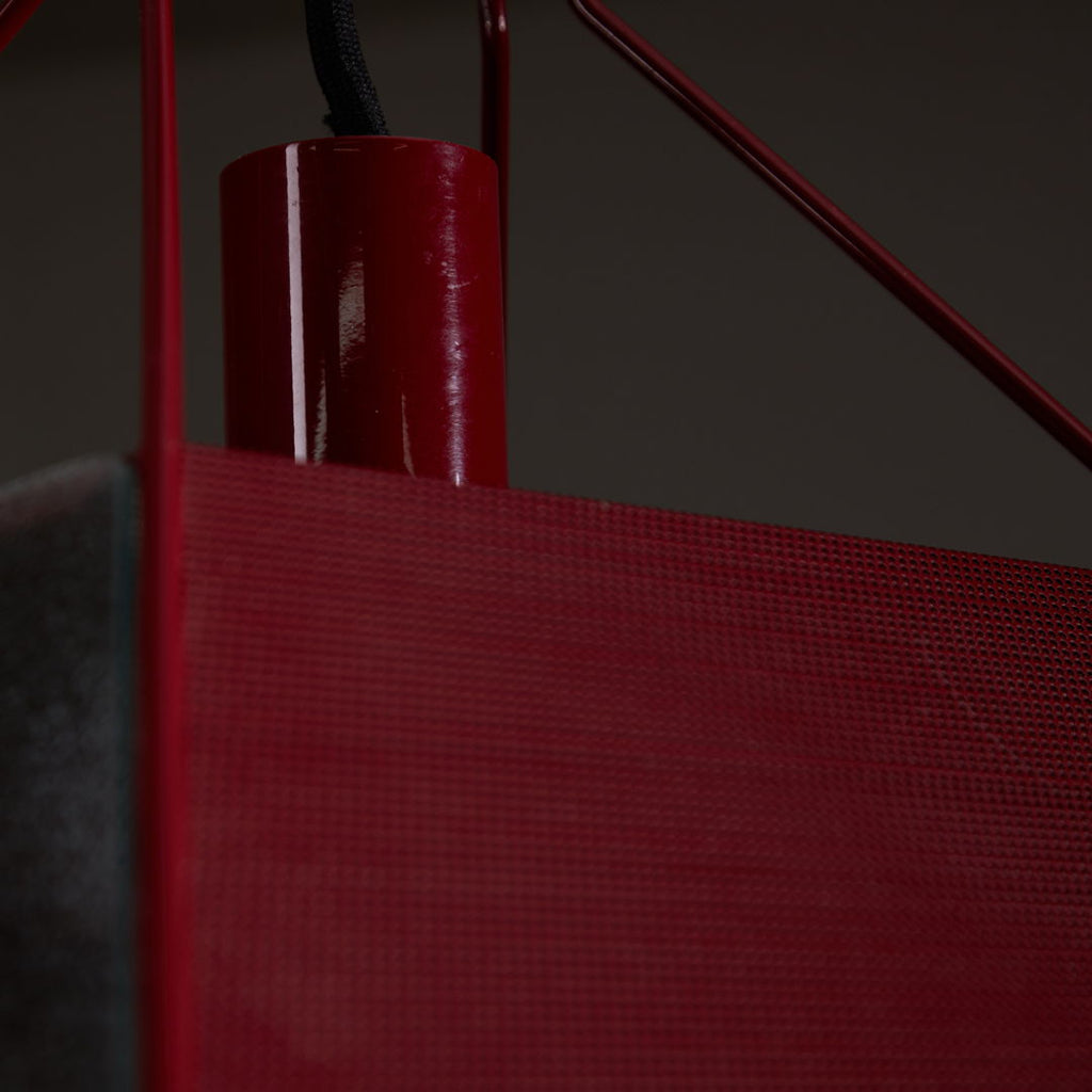 Burgundy postmodern trapezoidal metal pendant lamp with textured glass insert. The Trapezio modell was designed by Alberto Salvati & Ambrogio Tresoldi for Lucy in the 1980s. This item is in an excellent vintage condition with minor signs of use.