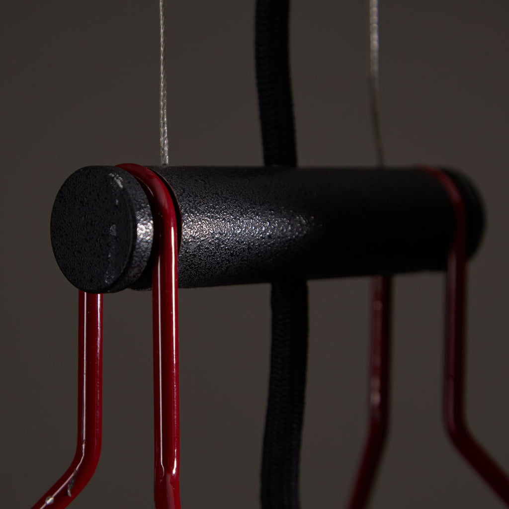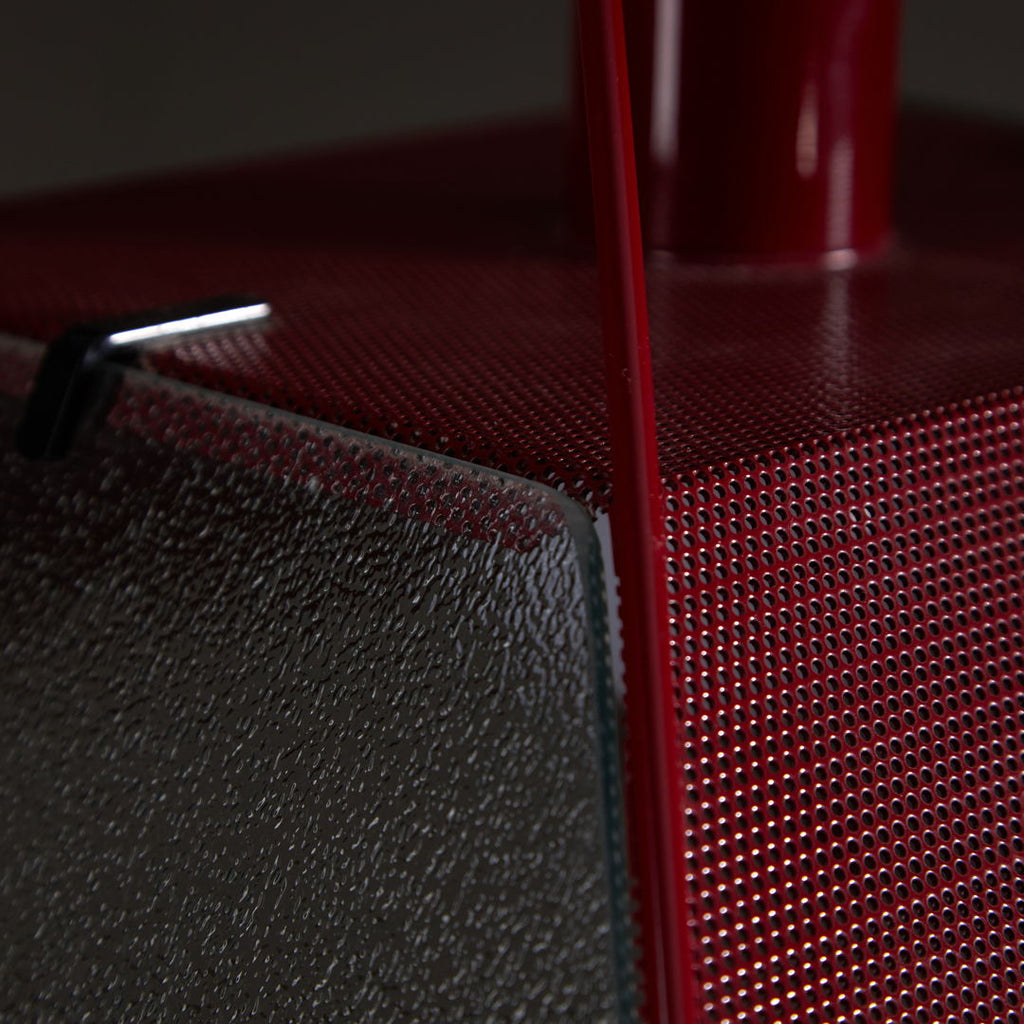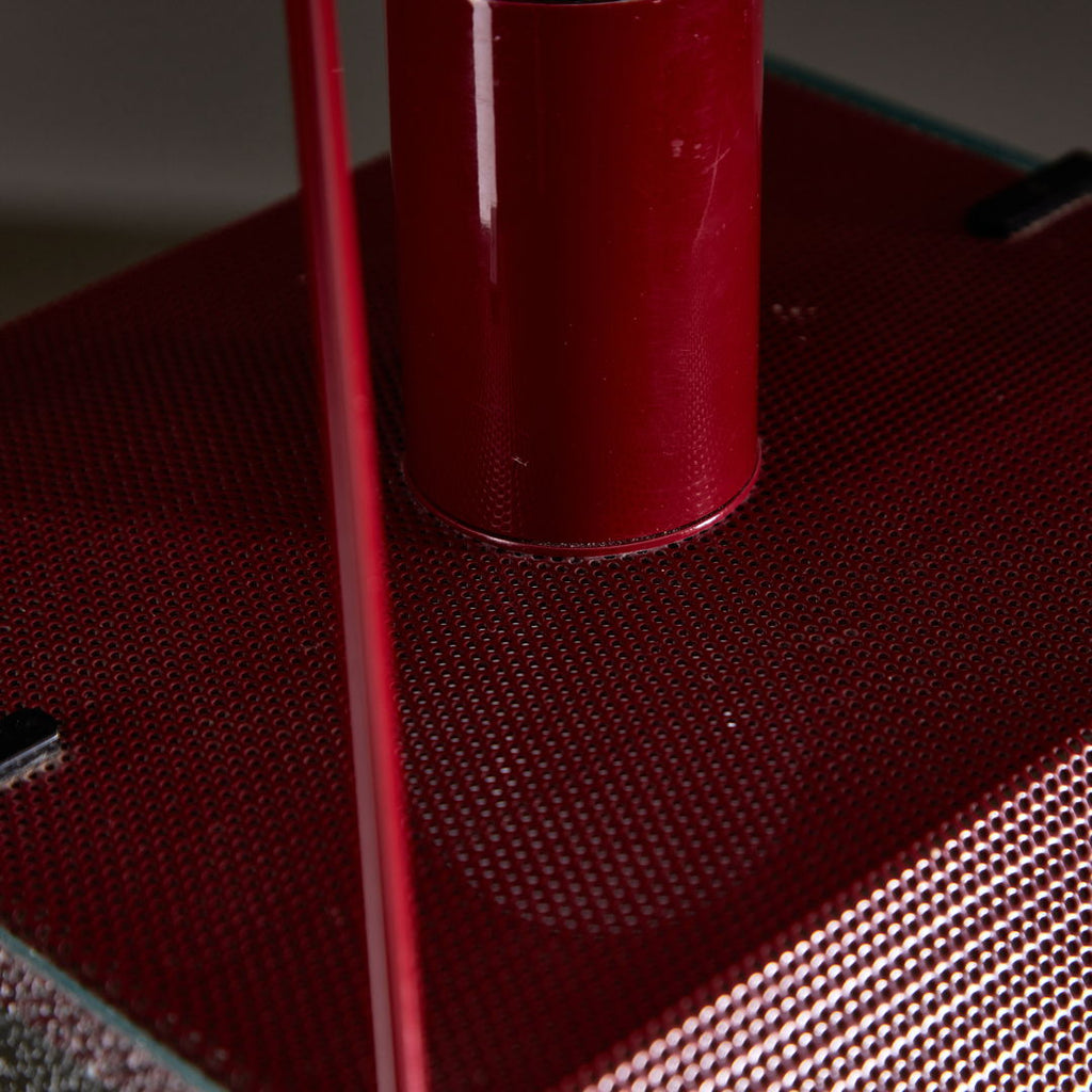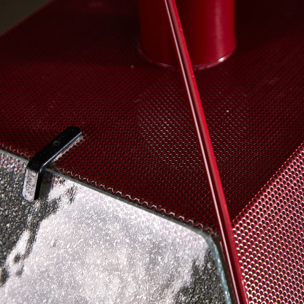 질감 있는 유리 인서트가 있는 버건디 포스트모던 사다리꼴 금속 펜던트 램프. Trapezio 모델은 1980년대 Lucy를 위해 Alberto Salvati와 Ambrogio Tresoldi가 디자인했습니다. 이 상품은 약간의 사용감이 있는 우수한 빈티지 상태입니다. SKU:GB0114