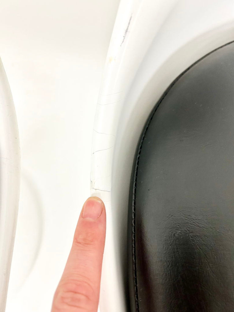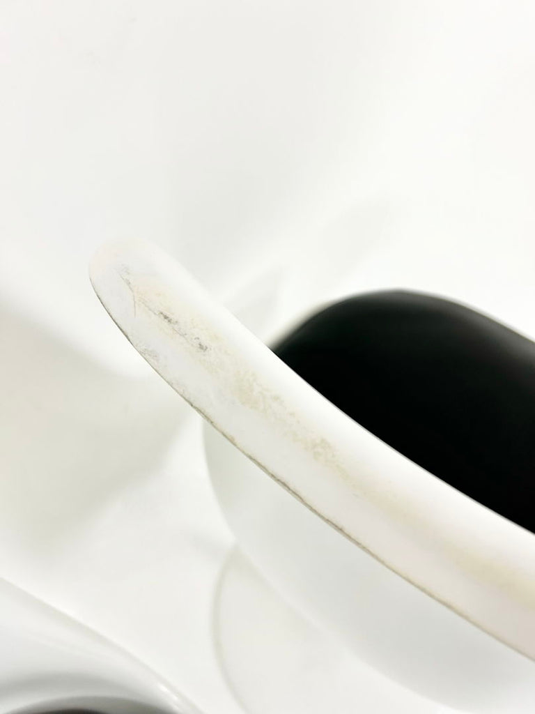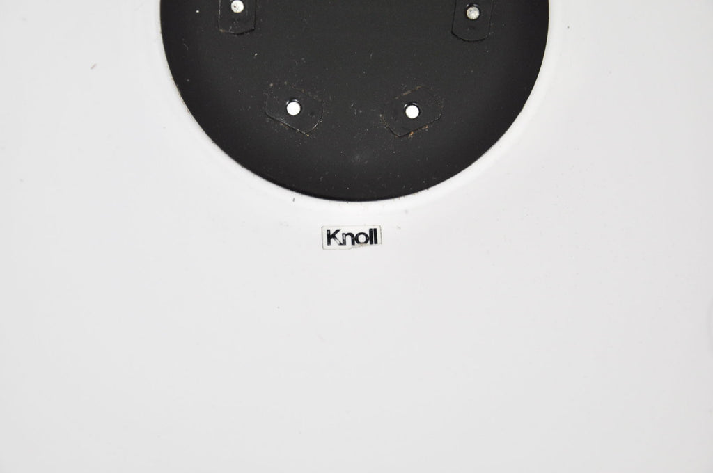 유리섬유, 알루미늄, 블랙 가죽 소재의 의자 6개 세트입니다. 좌석 밑면에 놀(Knoll) 스티커가 붙어 있습니다. 좌석 높이 46cm. 의자의 시간과 연식으로 인한 마모.
