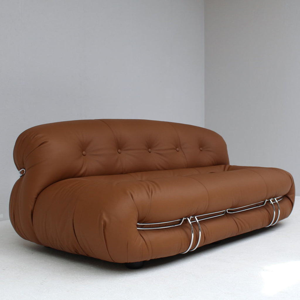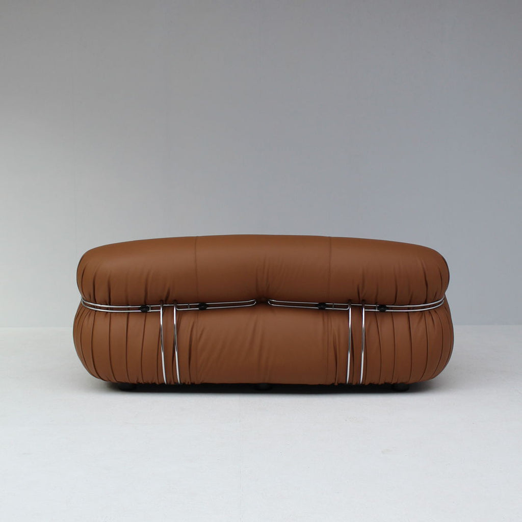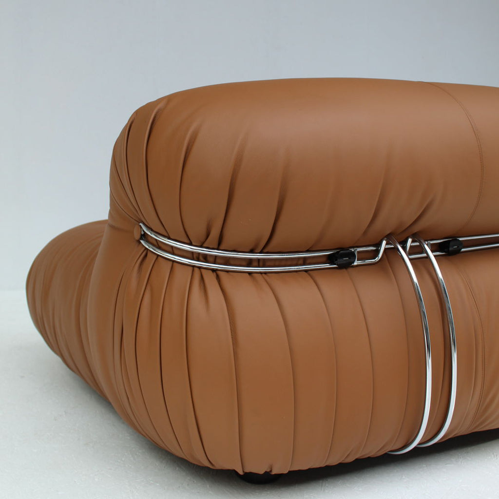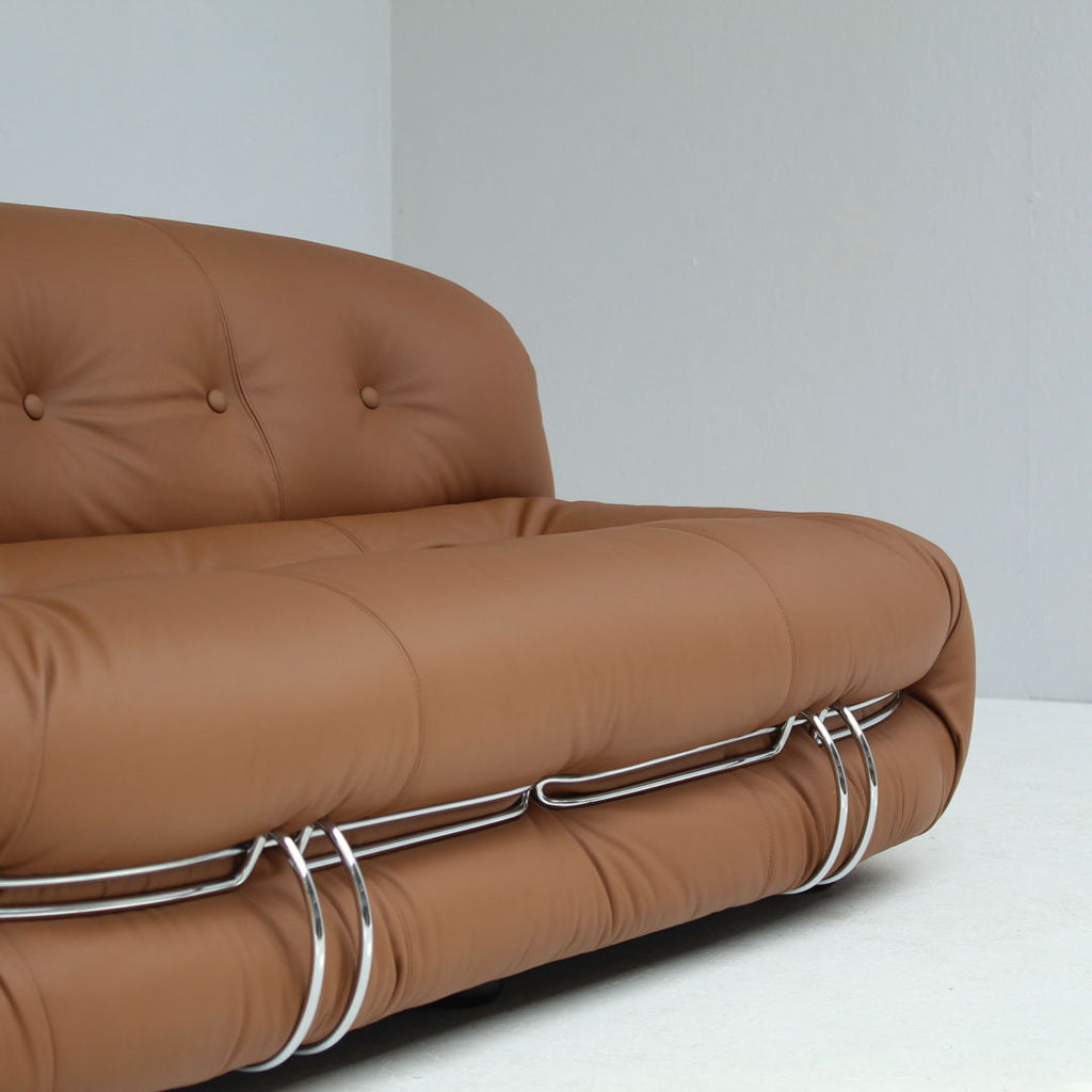 1970년대 Cassina를 위해 Afra & Tobia Scarpa가 제작한 Soriana 2인용 소파. 소파는 브라운 가죽으로 다시 마감하여 가죽 상태가 완벽합니다. 또한 크롬 도금된 강철의 상태도 매우 좋습니다. 해당 부분은 하단에 표시되어 있습니다.