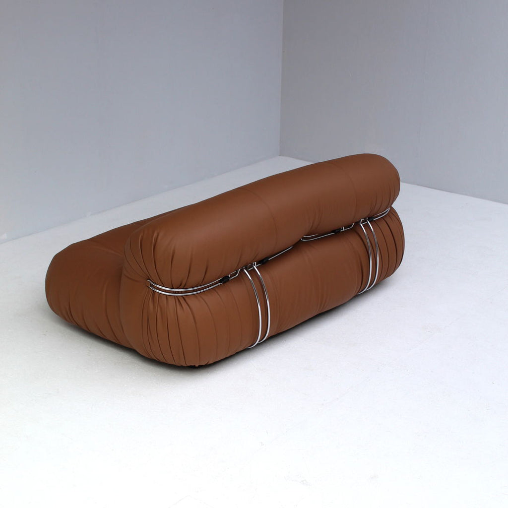 Soriana 2 seater sofa by Afra & Tobia Scarpa for Cassina from the 1970s. The sofa is reupholstered in brown leather, so the leather is in perfect condition. Also, the chromed steel is in excellent condition. The piece is labeled at the bottom.