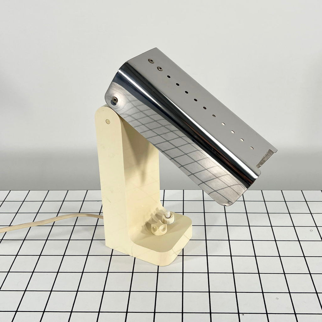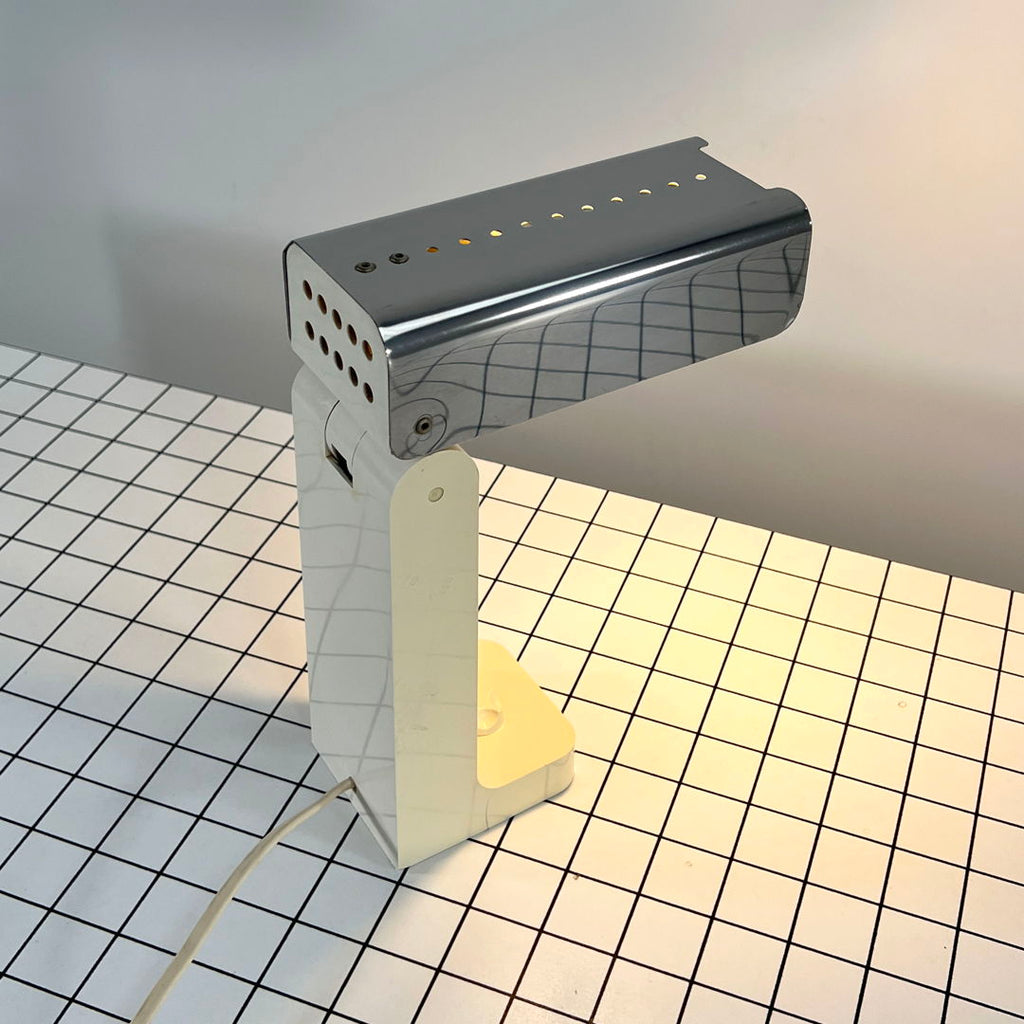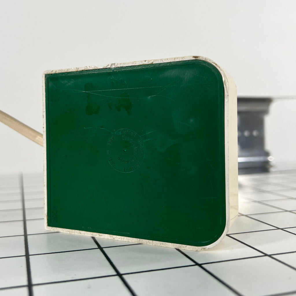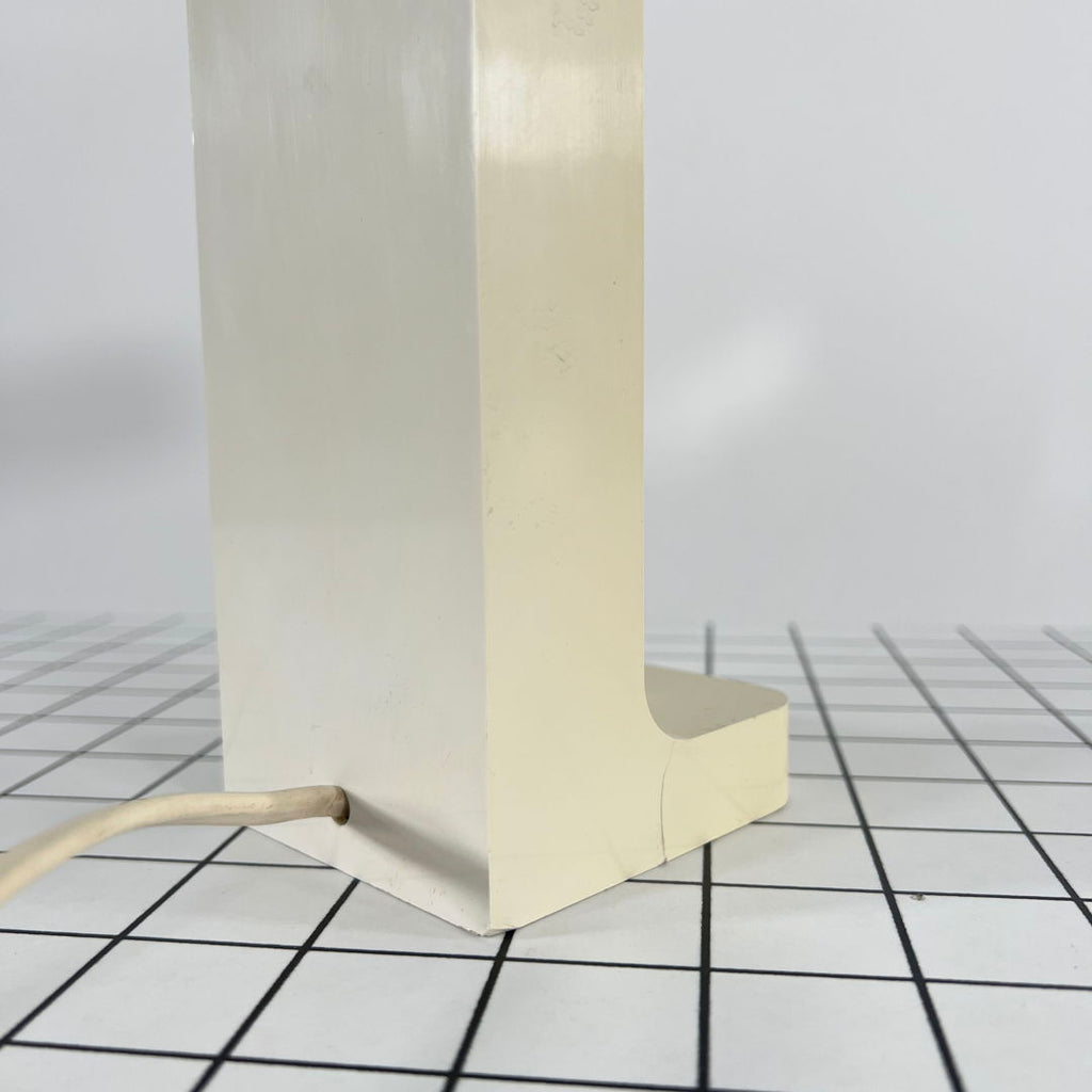 디자이너 - Joe Colombo 프로듀서 - Kartell 모델 - Vademecum 테이블 램프 설계 기간 - 70년대 치수 - 폭 8cm x 깊이 18cm x 높이 25cm 재질 - 플라스틱, 크롬 색상 - 은색, 흰색 전기적 특성 - 유럽형 플러그(최대 240V) / 전구 E14 댓글 - 연령과 사용에 따른 가벼운 마모. 플라스틱이 황변됩니다. 특히 한쪽과 안쪽에. 한쪽 모서리의 금속이 살짝 접혀있습니다. 발의 플라스틱에 표면적인 균열이 하나 있습니다. 자세한 내용은 사진을 참조하세요.
