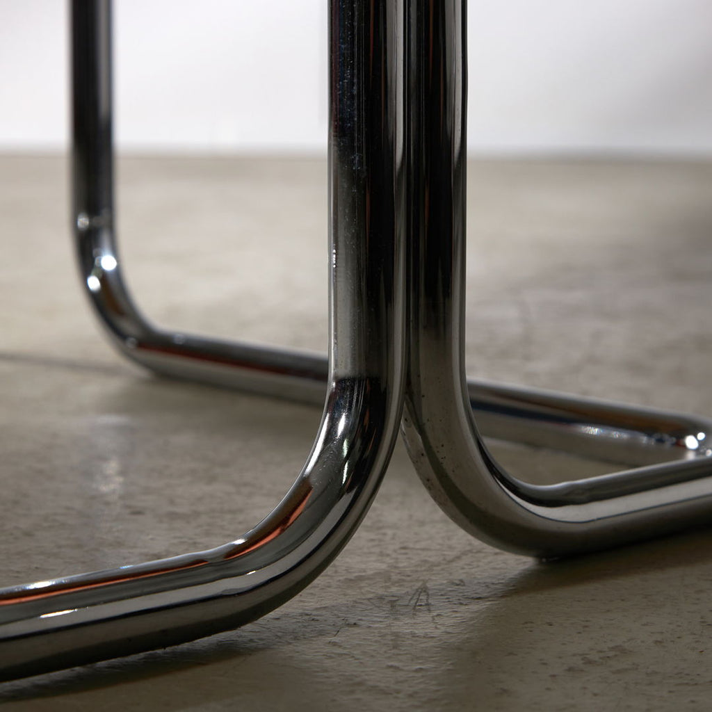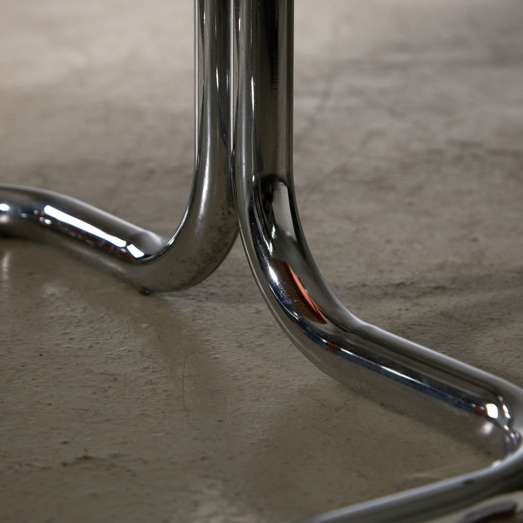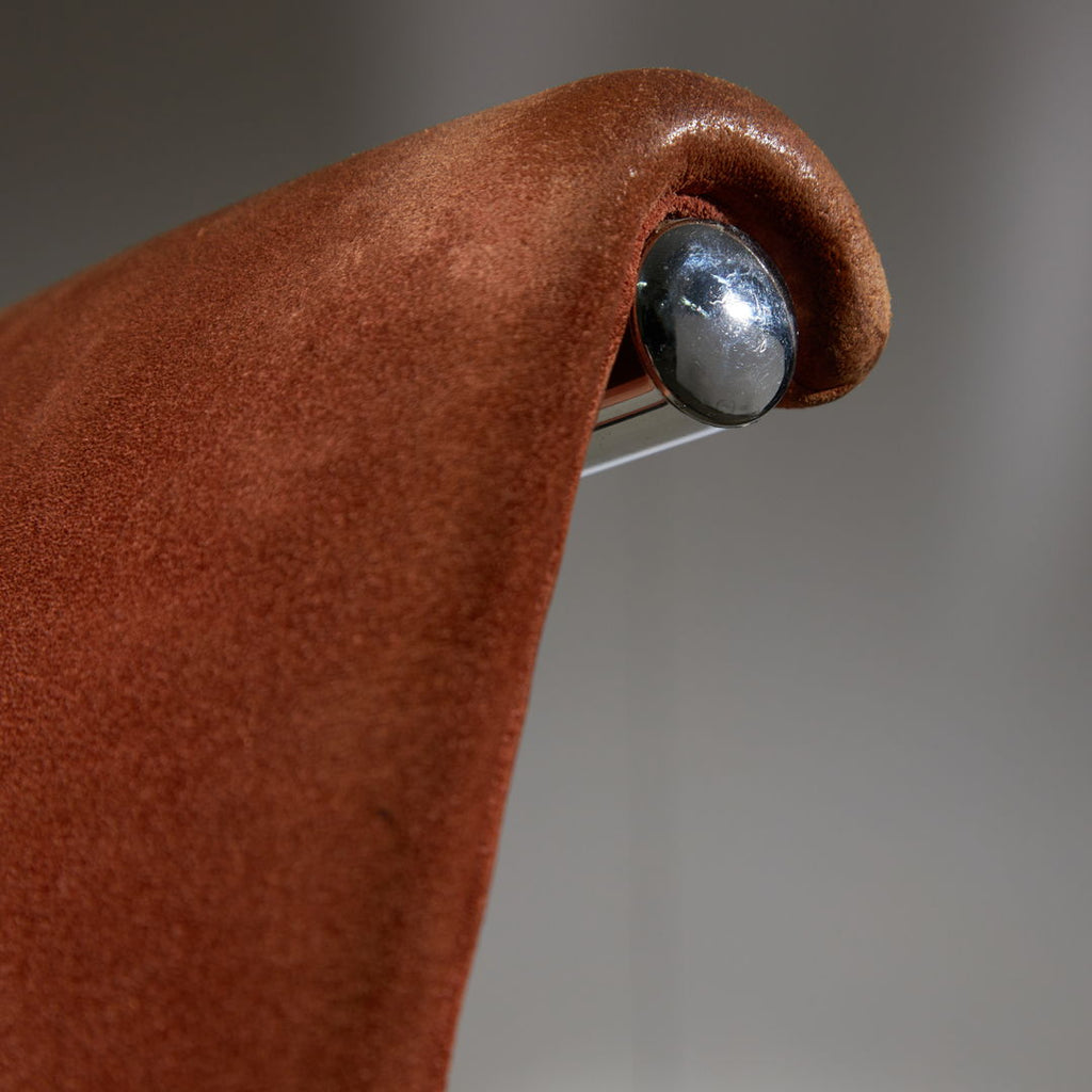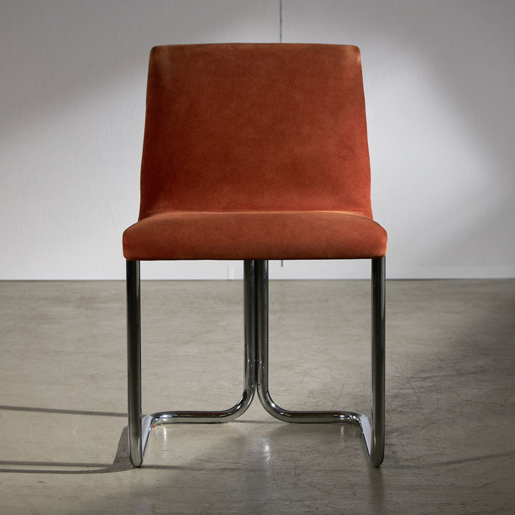 Designed with precision and attention to detail, this stunning chair is upholstered in rich, cozy orange velvet that not only adds a touch of luxury to your space, but also radiates warmth and comfort. The shiny chrome accents elevate the design, creating a modern and sophisticated look that is sure to make a statement in any room, while the curves and lines make this item unique and captivating. 2 pieces available in great vintage condition, with minor signs of age and use.