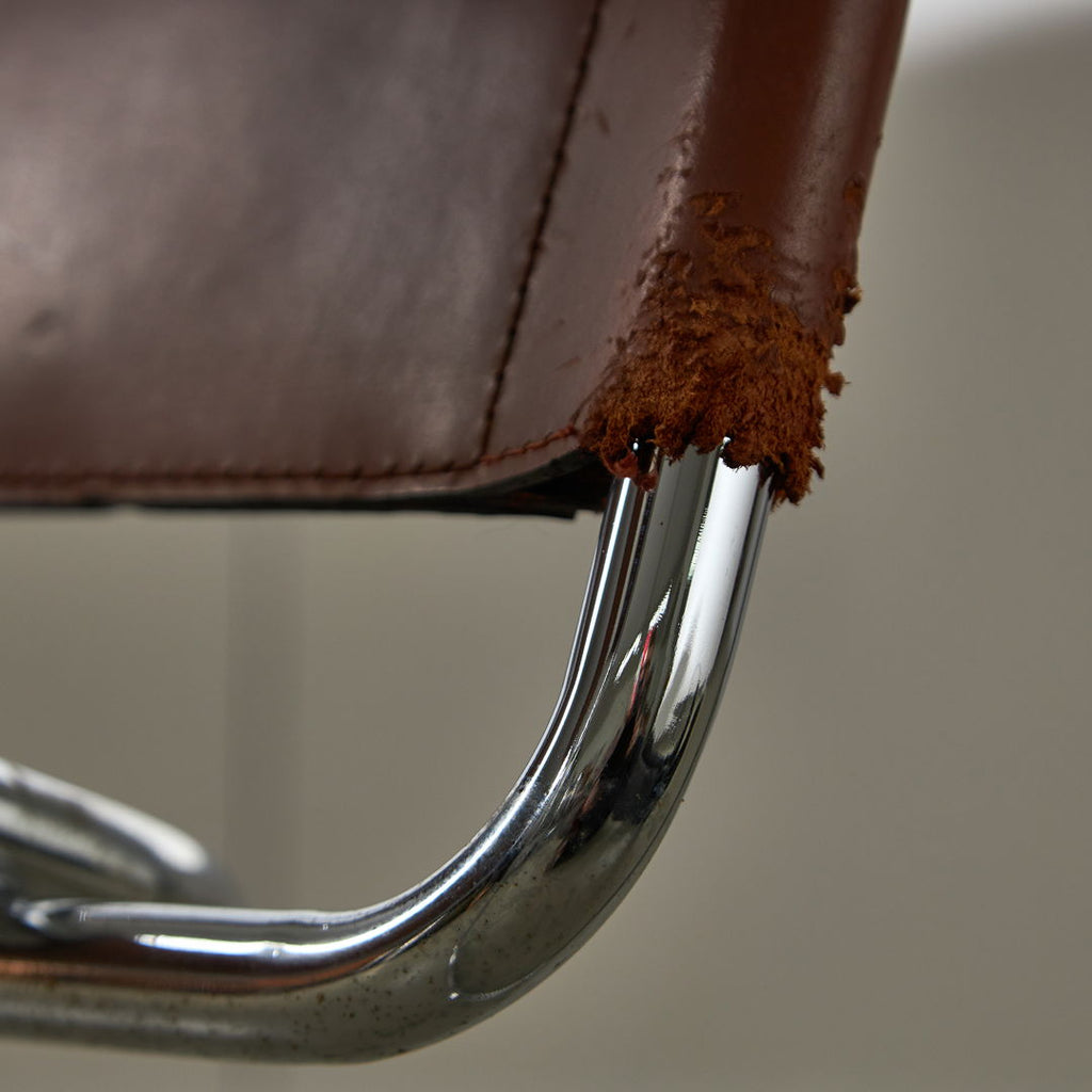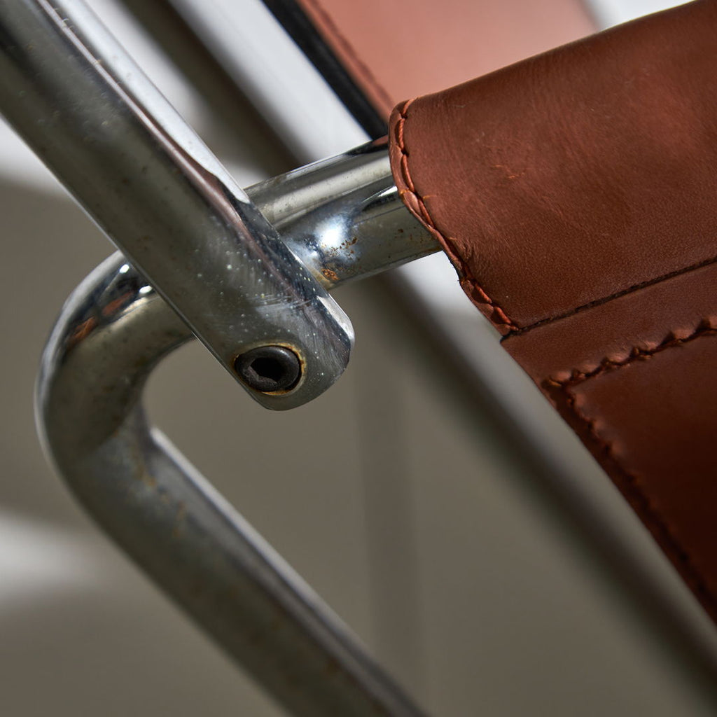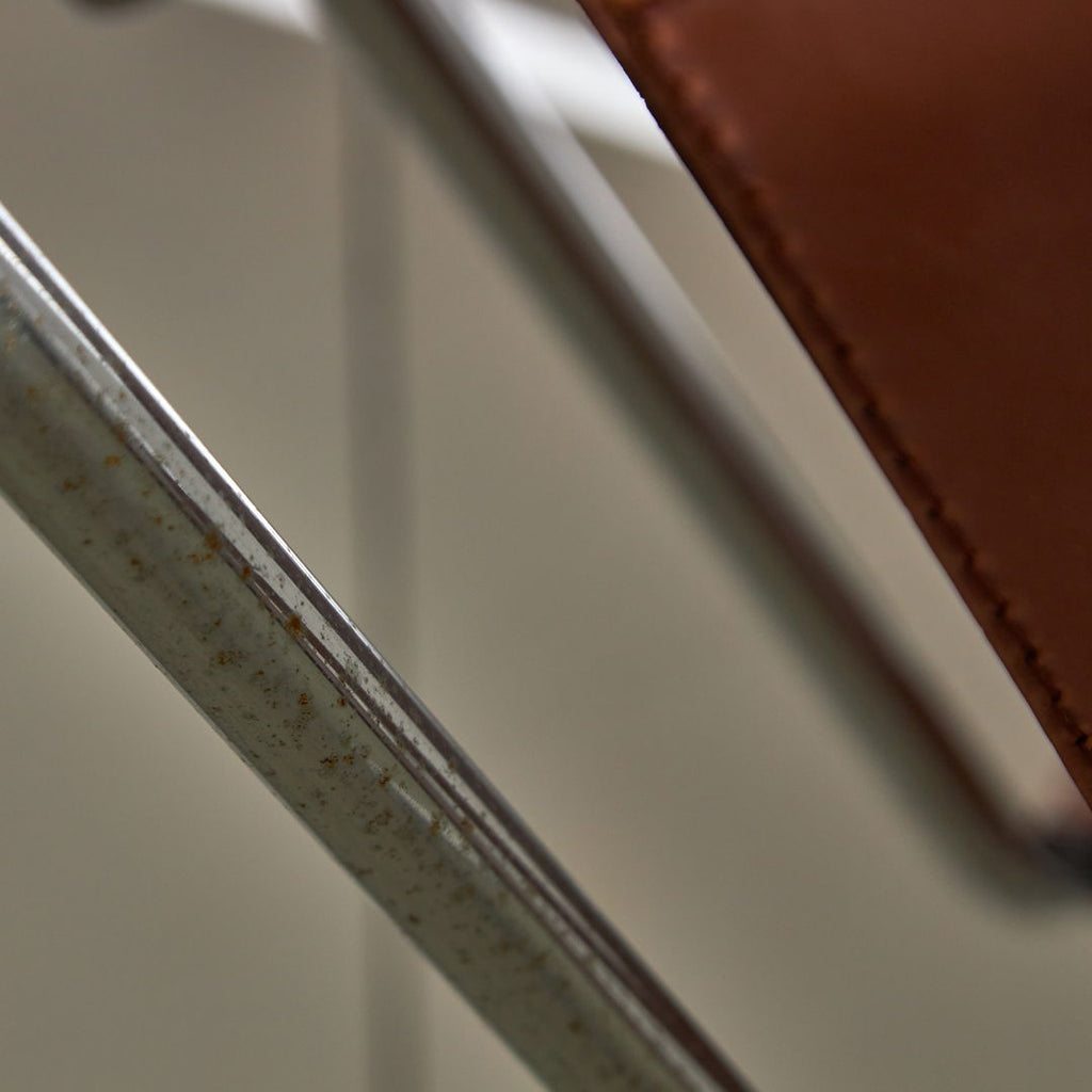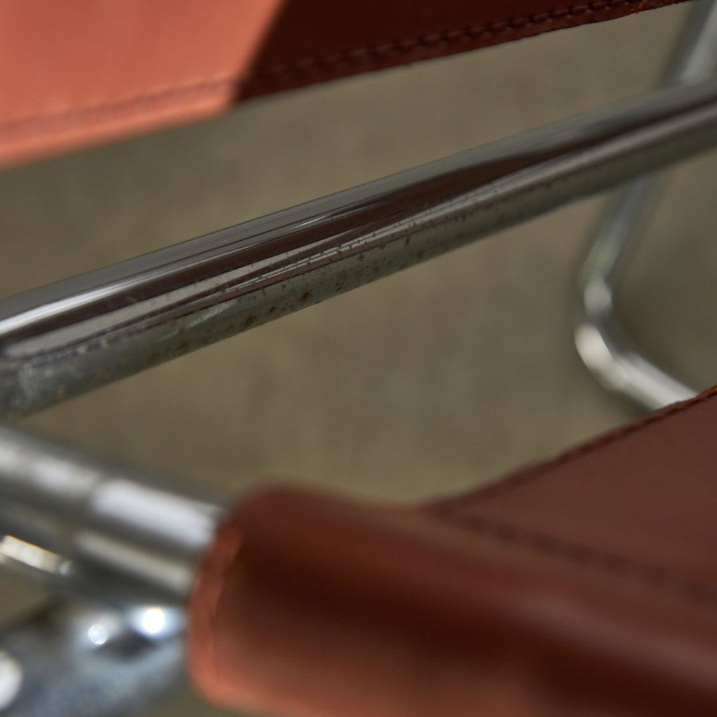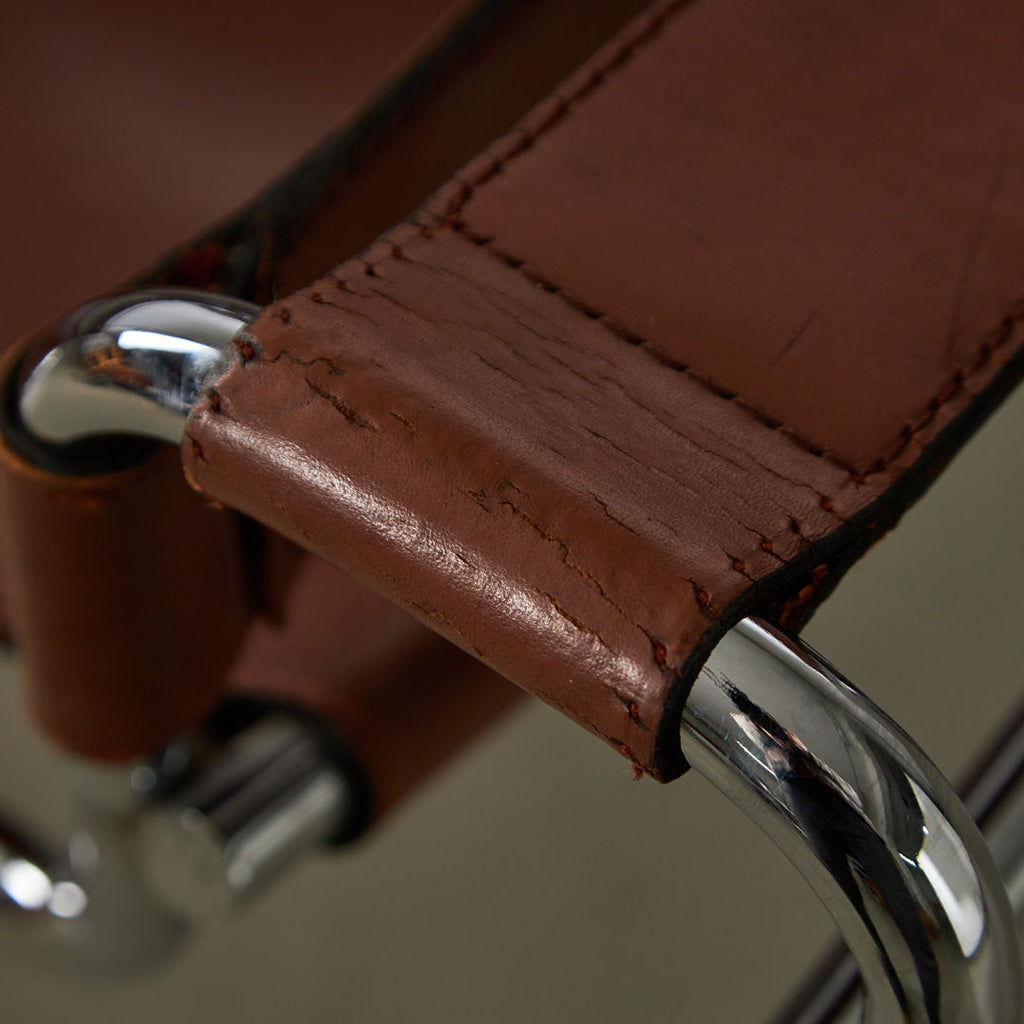 마르셀 브로이어(Marcel Breuer)가 디자인한 브라운 컬러의 바실리 의자(Wassily Chair) 등받이에 디자이너의 시그니처가 새겨져 있으며, 가비나(Gavina)가 생산했던 시절로 거슬러 올라갑니다. 가죽 시트와 등받이는 사용감이 거의 없는 매우 좋은 빈티지 상태이며, 팔걸이 중 하나에 약간 더 무거운 마모 지점이 보입니다. 크롬 프레임은 관리가 잘 되어 있고 광택이 나는 것 같습니다. SKU: GB0148