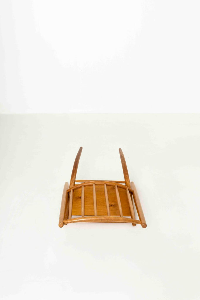 이 스마트한 구조는 나사 없이 결합된 두 부분으로 구성되어 있으며 쉽게 운송하거나 보관할 수 있습니다. 디자인은 서아프리카 지도자 부족의 의자에서 영감을 받았습니다. 이 의자는 세월에 따라 약간의 마모가 있는 좋은 상태입니다. 원하는 경우 일부 래커를 복원할 수 있습니다.