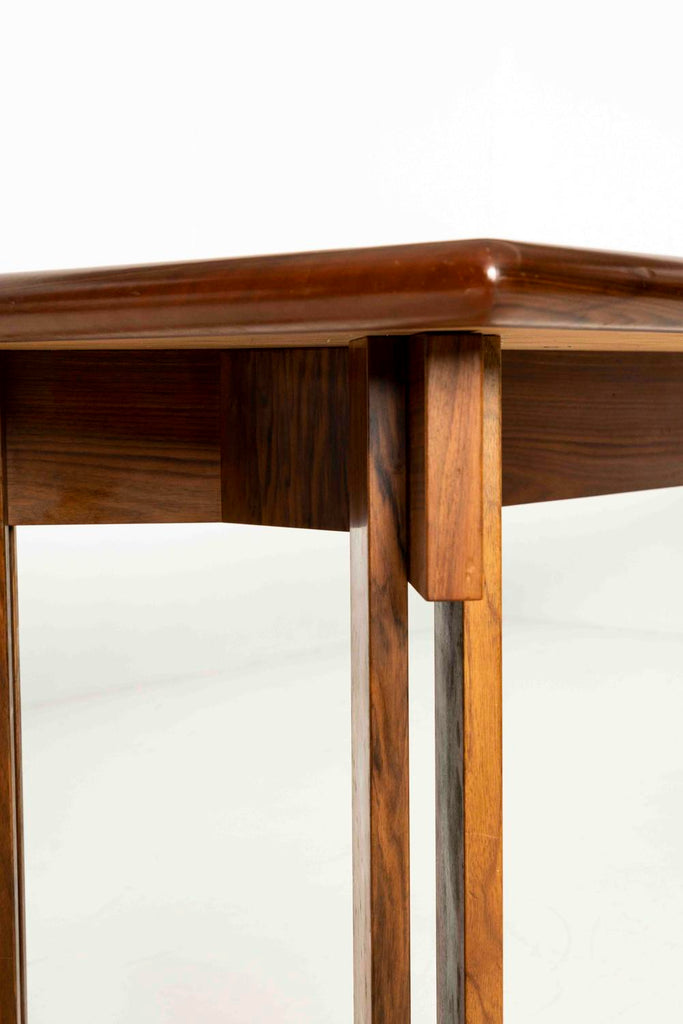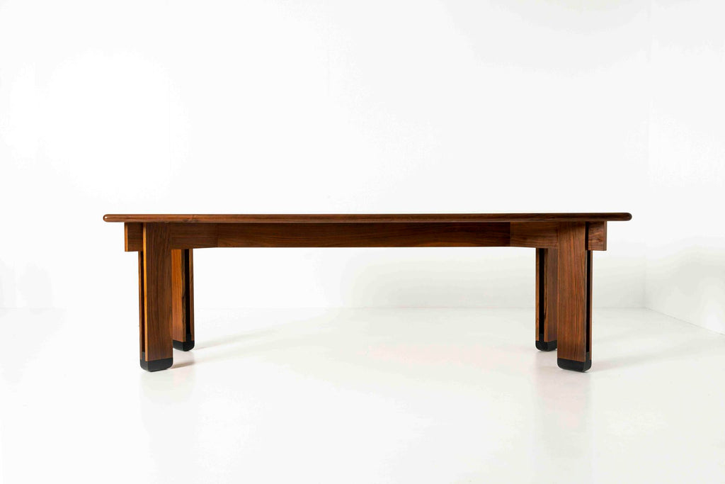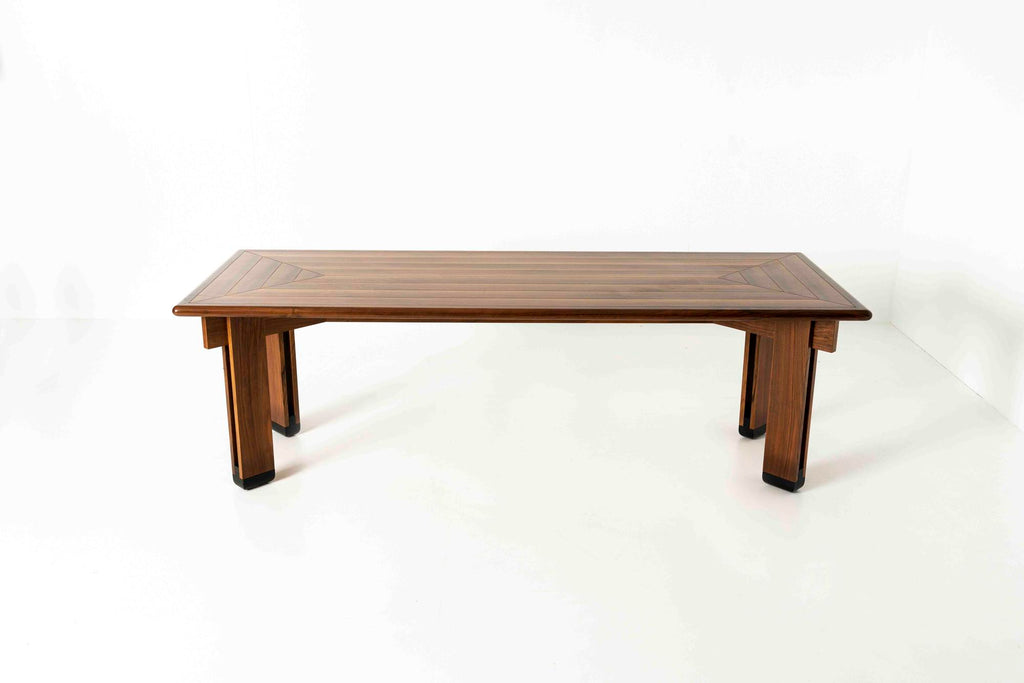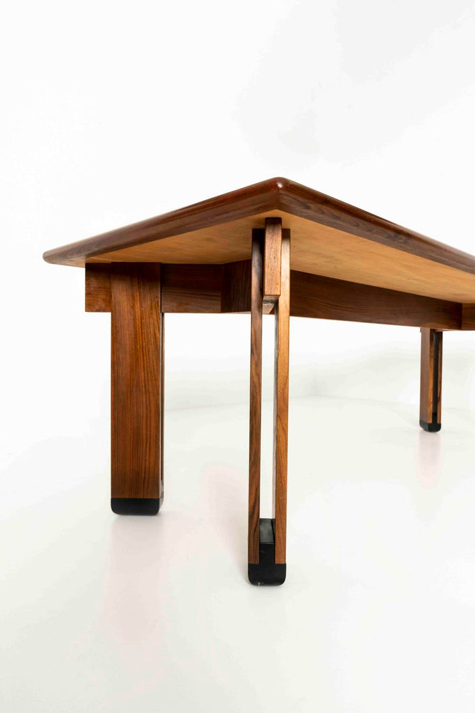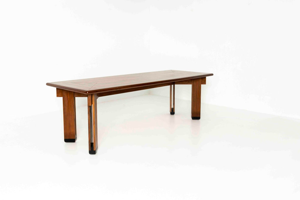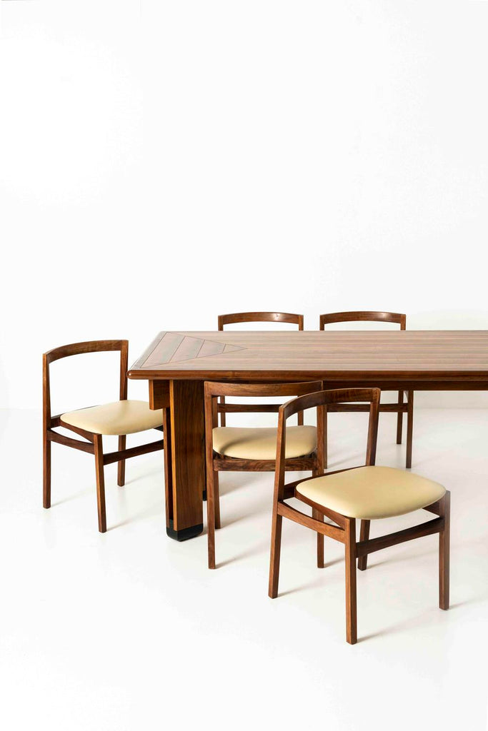 1950년대 이탈리아의 Brugnoli Mobili Cantù를 위한 인상적인 식탁 iby Ico Parisi. 이 테이블은 수직 라이닝이 특징인 잘 디자인된 다리가 있는 베이스를 가지고 있으며 우리는 그것이 호두라고 생각합니다. 상단에는 패턴의 나무 상감이 있습니다. 테이블은 크고 쉽게 8개의 좌석이 있습니다.