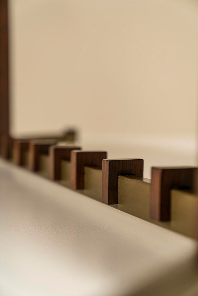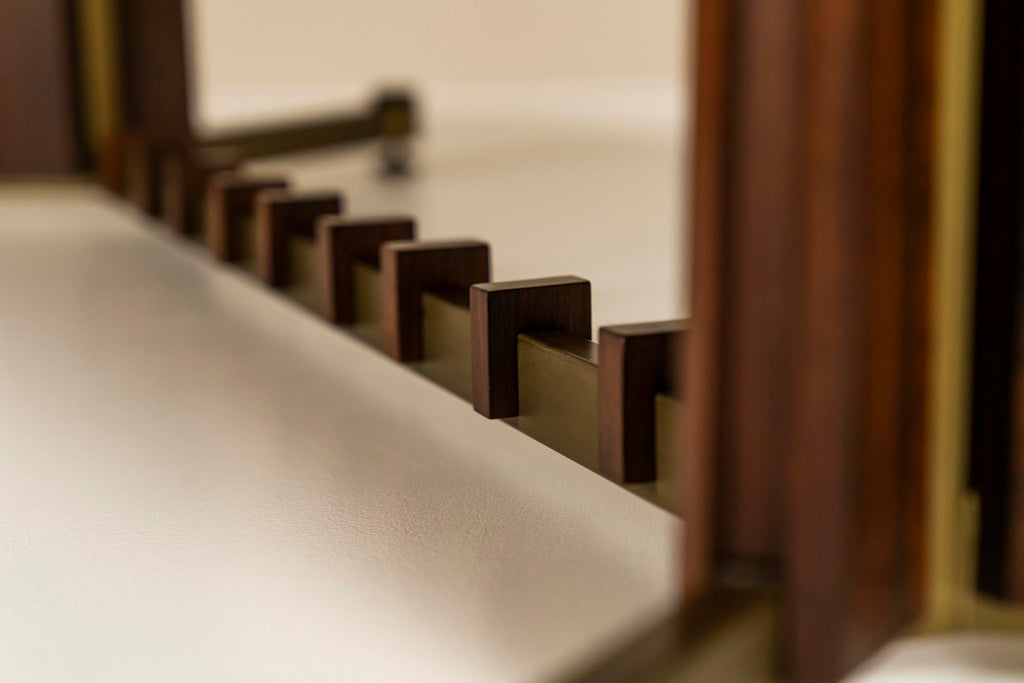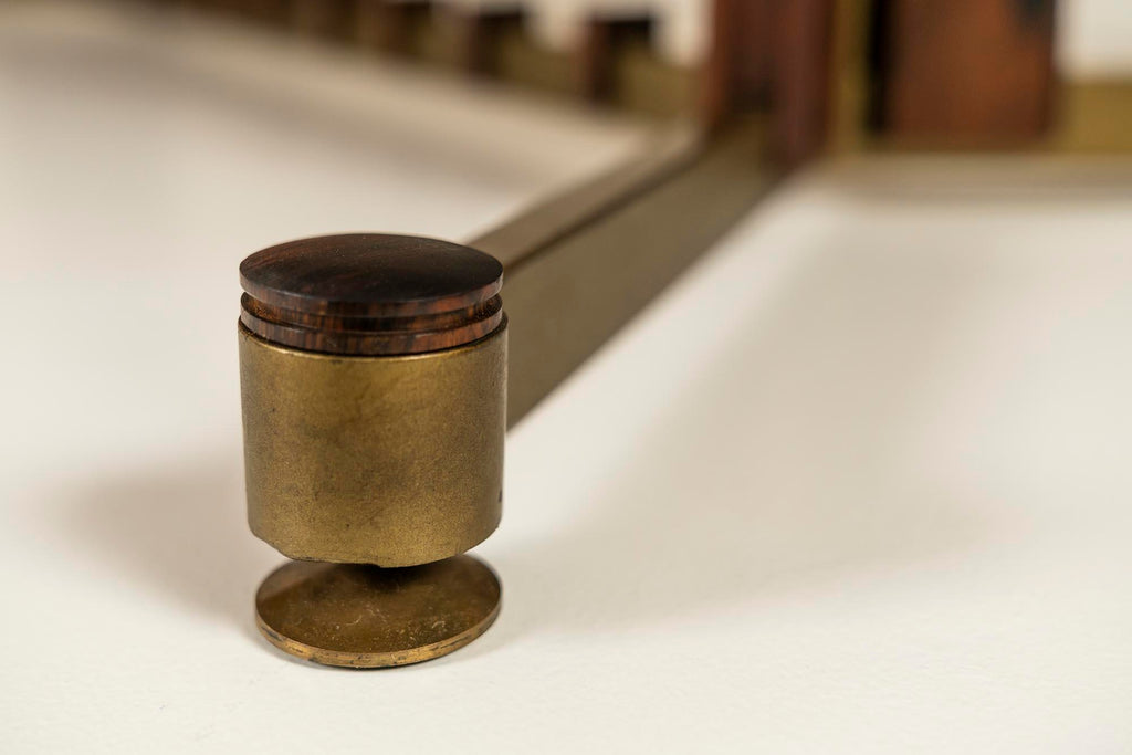 1960년대의 이 이탈리아 식탁은 건축 디자인과 재료 선택이 돋보입니다. 여러 가지 놀라운 세부 사항이 특징인 프레임부터 시작하겠습니다. 둥근 다리는 황동으로 만들어졌으며 테이블의 수평을 맞추기 위해 돌리기만 하면 조절이 가능합니다. 이 발의 윗부분에는 로즈우드 캡으로 장식되어 있는 것을 볼 수 있습니다. 여기에서 튼튼한 황동 프레임이 중간까지 이어집니다. 대들보와 프레임의 나머지 부분은 조정 가능한 발로 인해 바닥에서 불과 몇 센티미터만 들어 올려지며 대들보 주위에 고정된 9개의 자단 블록으로 장식되어 있습니다. 또한 전체가 브러싱 처리된 황동으로 구성된 프레임의 하단에서 곧은 다리로 시선을 돌립니다. 아름다운 자단으로 만든 두 개의 매끈한 날개가 각 다리를 장식합니다. 이 나무 부품은 프레임에 고정되어 테이블에 독창적이고 우아한 느낌을 줍니다. 아름답고 위엄 있는 옻칠한 마호가니 목재 상판이 이 특별한 프레임에 놓여 있습니다. 상판은 패싯 엣지로 완전히 마감되었으며 쾌적한 파티나를 선사합니다. 다양한 유형의 재료가 서로 멋진 조합을 이루며 디자인과 함께 평범한 식탁이 아님을 확인합니다. 우리는 최근에 녹청과 빈티지한 모양과 느낌을 보존하면서 이 테이블을 복원했습니다.