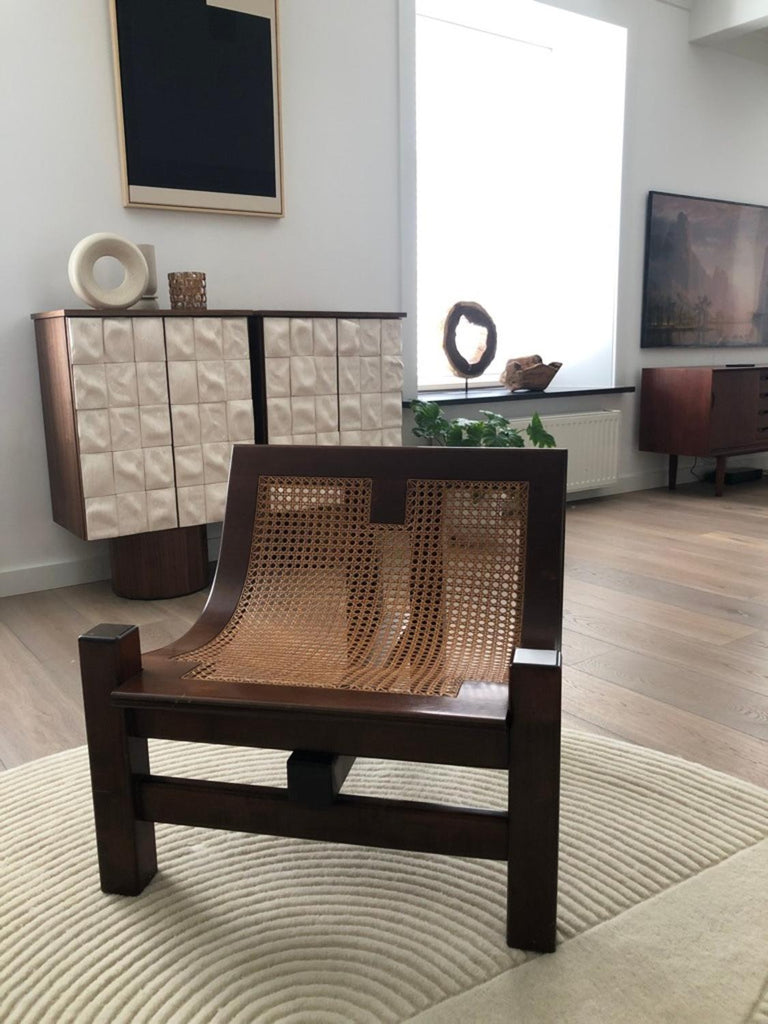 1960년대 이탈리아에서 나무와 지팡이로 만든 페르디난도 메카니(Ferdinando Meccani)의 멋진 안락의자. 이 의자는 인상적인 디자인으로 멋진 외관과 느낌을 줍니다.